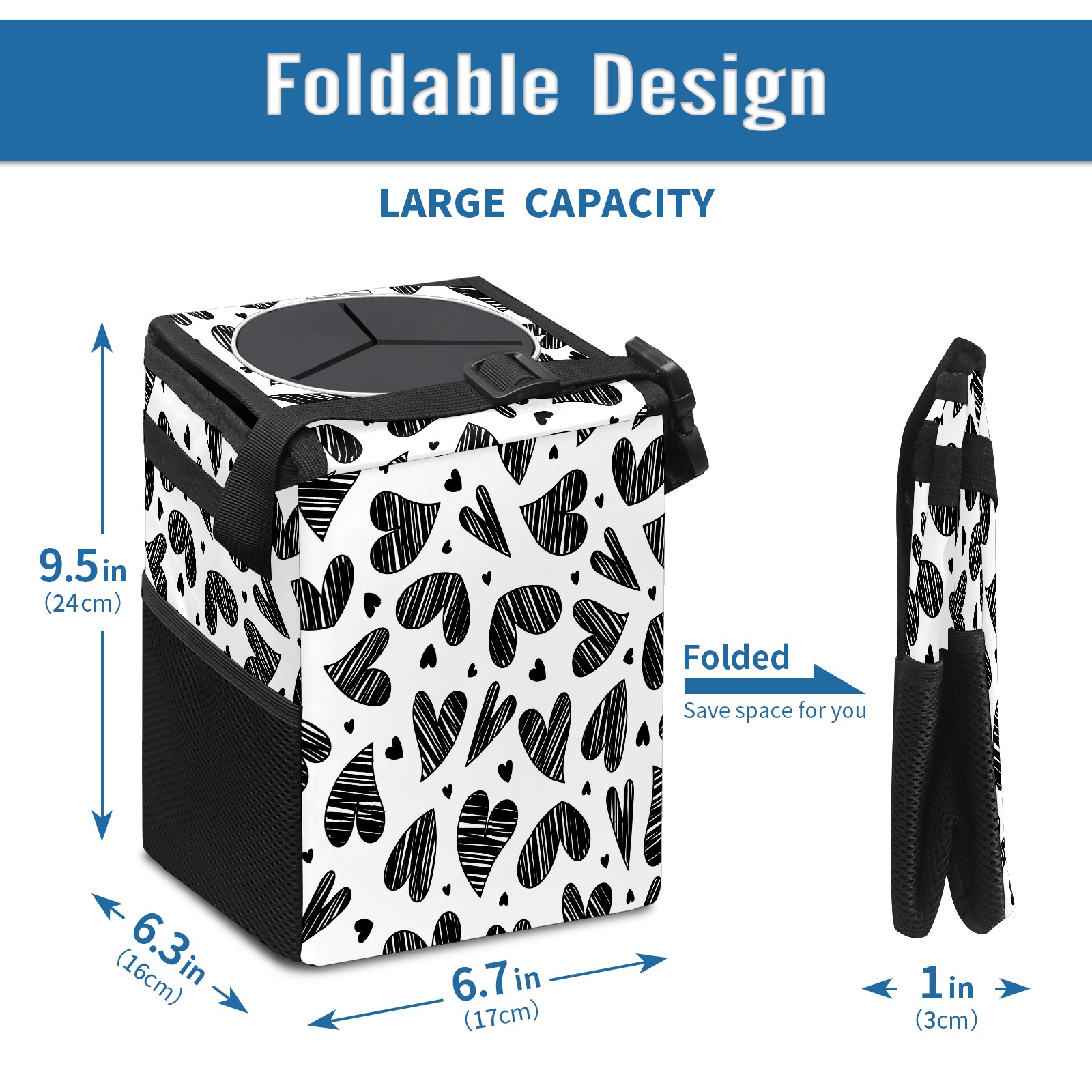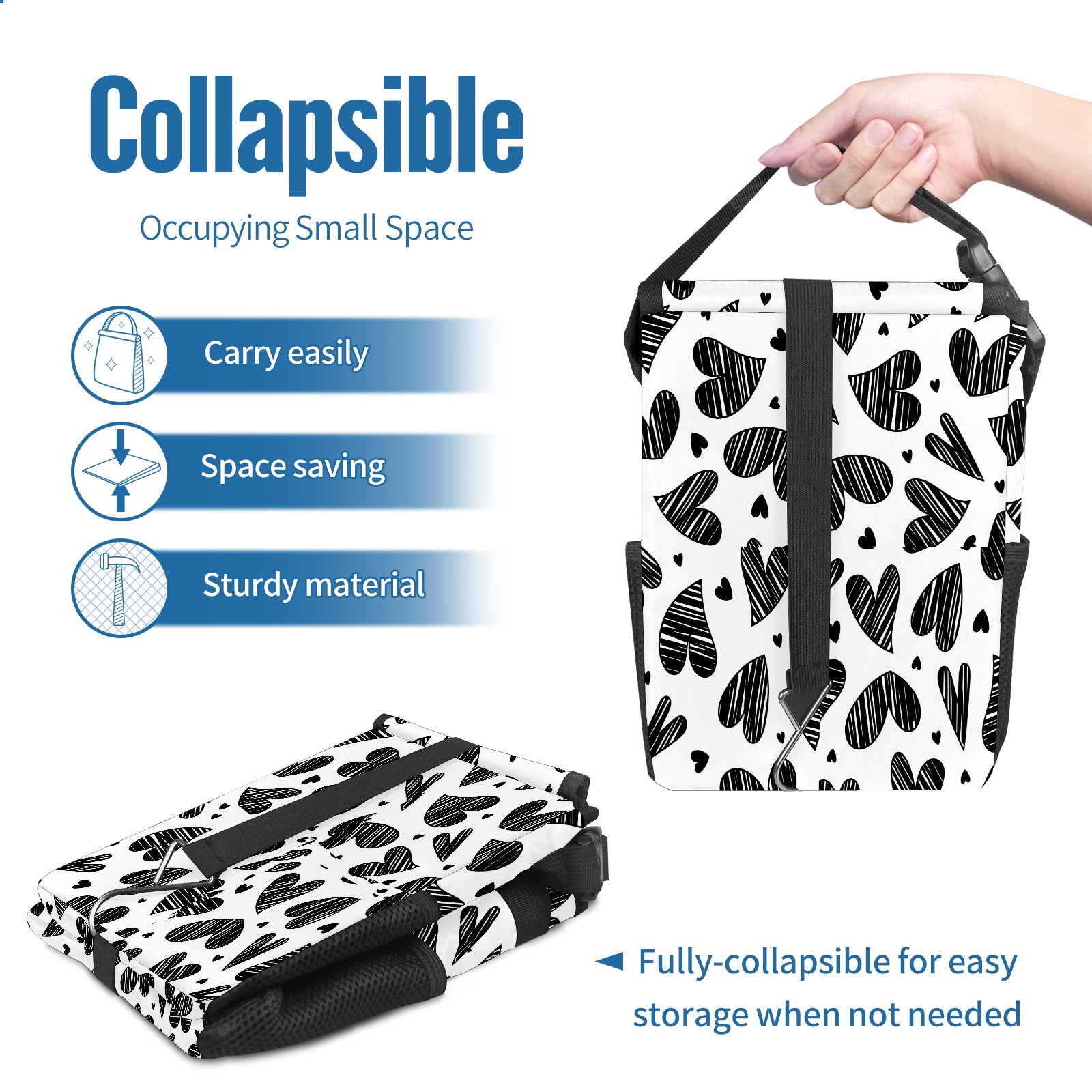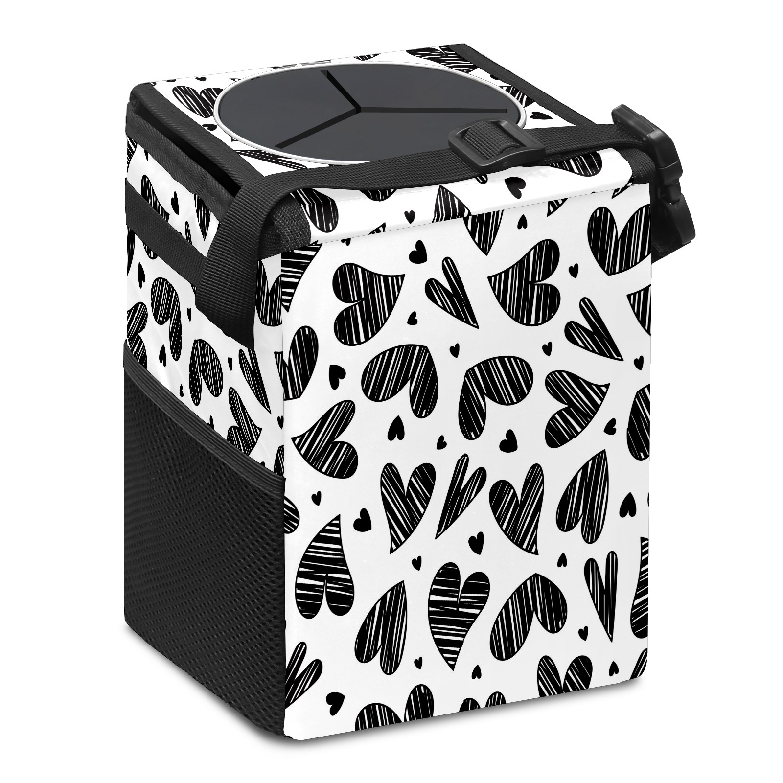 Car Garbage Can — Multi-functional, Lightweight Portable, Reusable Vehicle Trash Can, Waterproof with Sufficient Storage Capacity Doodle Love Heart Black Pattern
