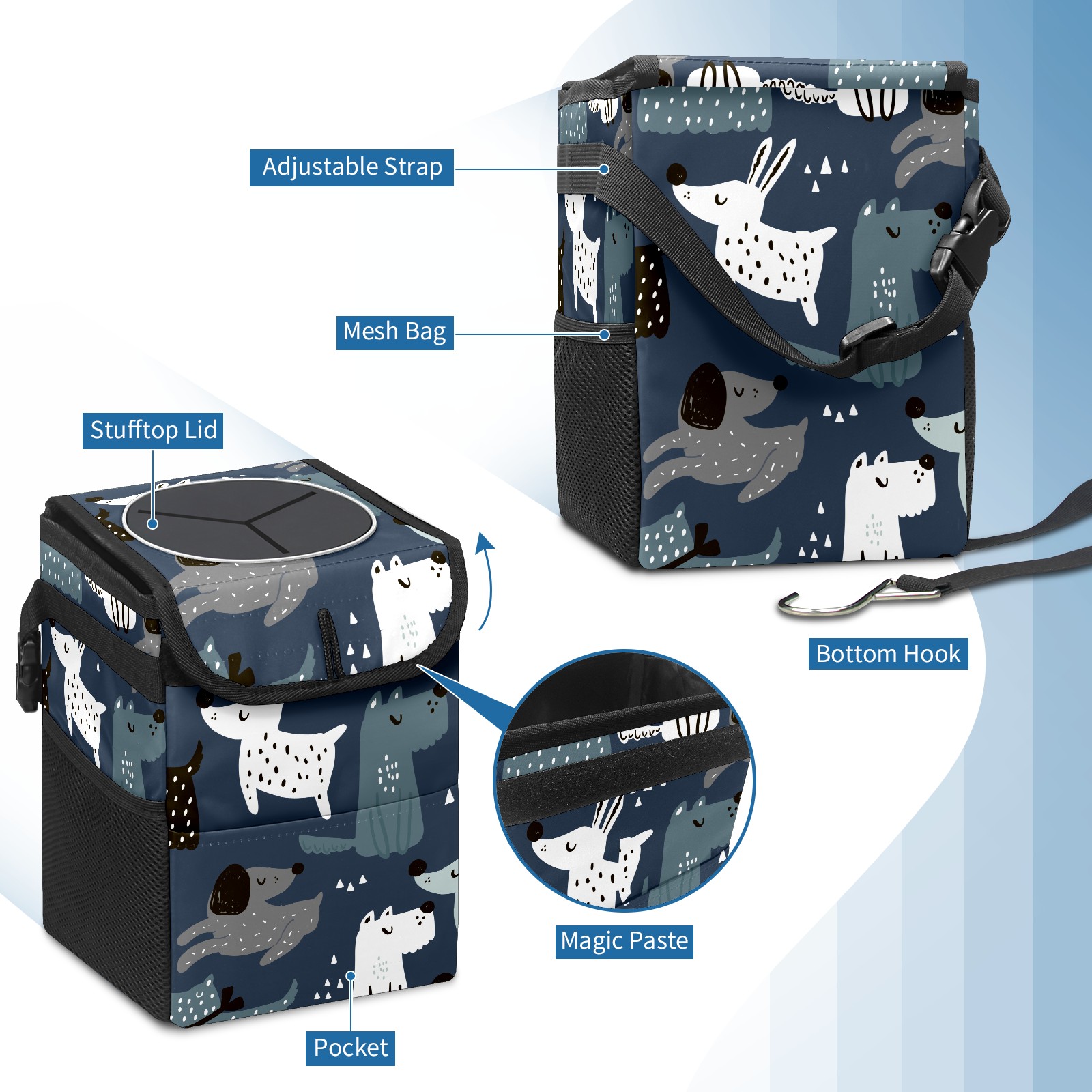 • <p>Keep your car neat with this practical car trash can—built for durability, versatility, and on-the-go convenience! Crafted from quality twill fabric with a waterproof lining, it prevents leaks, keeping seats/floors clean. Clean easily: empty directly or secure a disposable bag with side clips. Adjustable pull cord fits floor, seat, or headrest. 9.5x6.3x6.7 inches, ample space for daily trash, folds flat for storage. More than a trash can, it doubles as a storage bag for cups, toys, docs, and small gadgets—must-have car interior accessory. Installs in seconds on seats, console, or gear shift; adjustable straps keep it stable, no slipping on bumpy roads. Perfect gift for new car owners!</p>