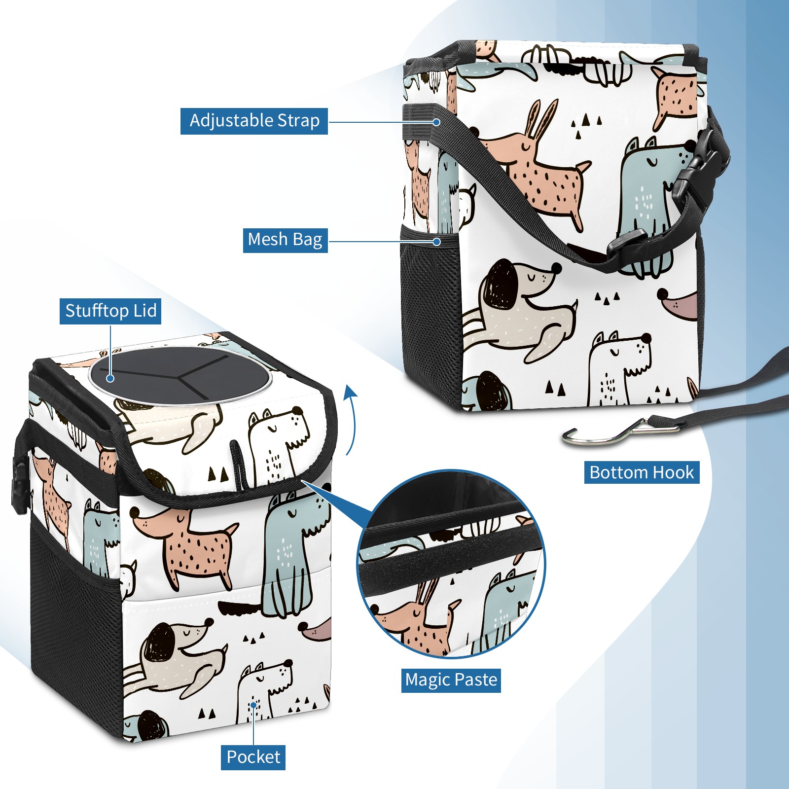 • <p>Keep your car neat with this practical car trash can—built for durability, versatility, and on-the-go convenience! Crafted from quality twill fabric with a waterproof lining, it prevents leaks, keeping seats/floors clean. Clean easily: empty directly or secure a disposable bag with side clips. Adjustable pull cord fits floor, seat, or headrest. 9.5x6.3x6.7 inches, ample space for daily trash, folds flat for storage. More than a trash can, it doubles as a storage bag for cups, toys, docs, and small gadgets—must-have car interior accessory. Installs in seconds on seats, console, or gear shift; adjustable straps keep it stable, no slipping on bumpy roads. Perfect gift for new car owners!</p>