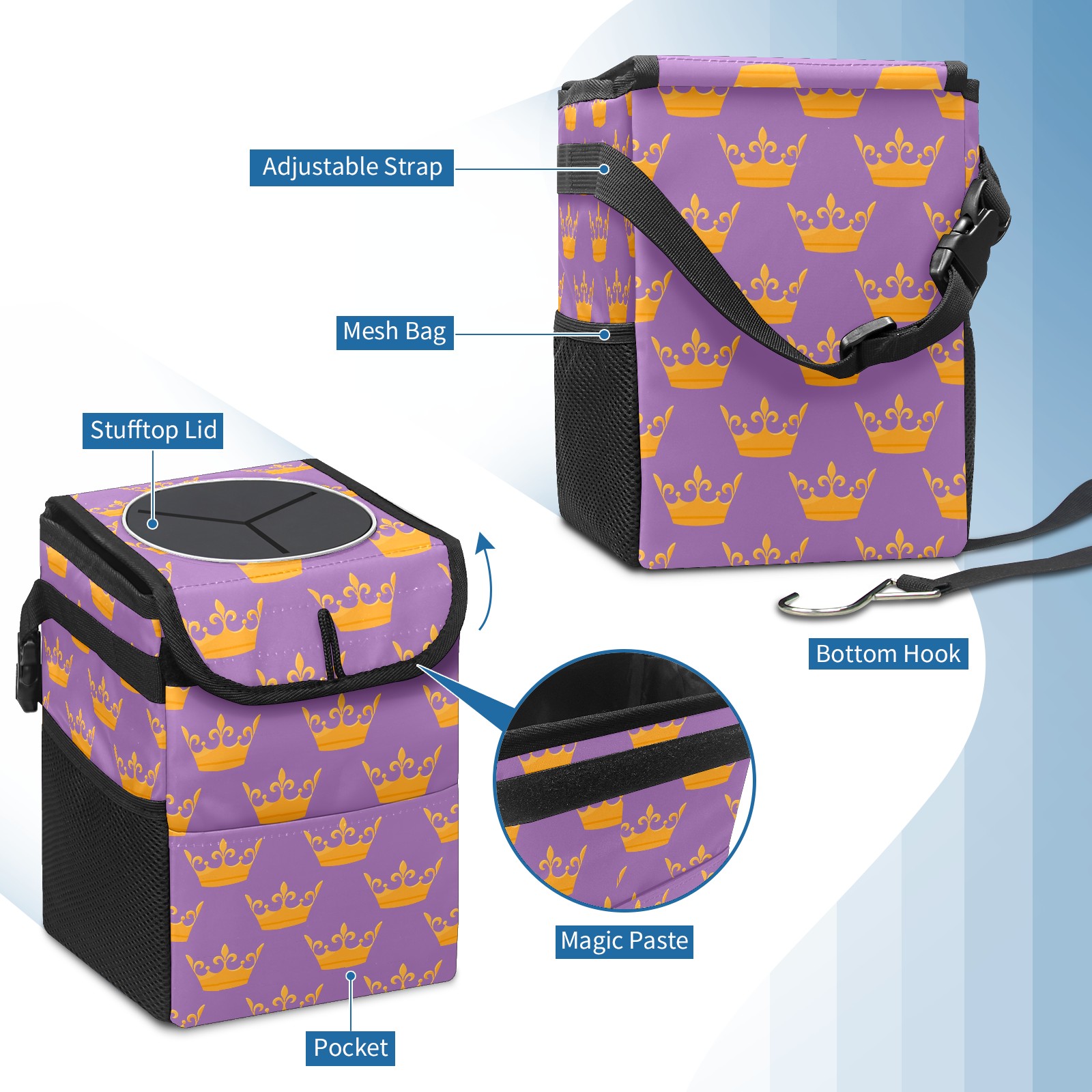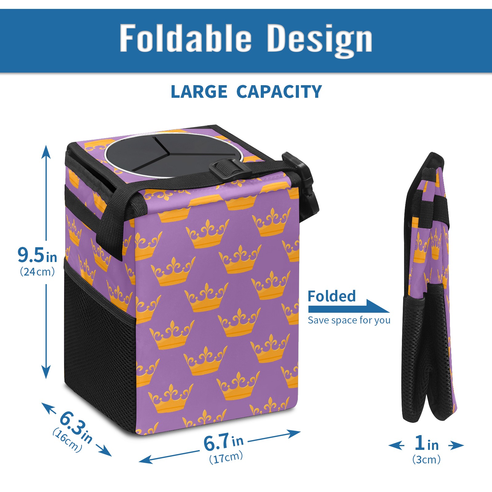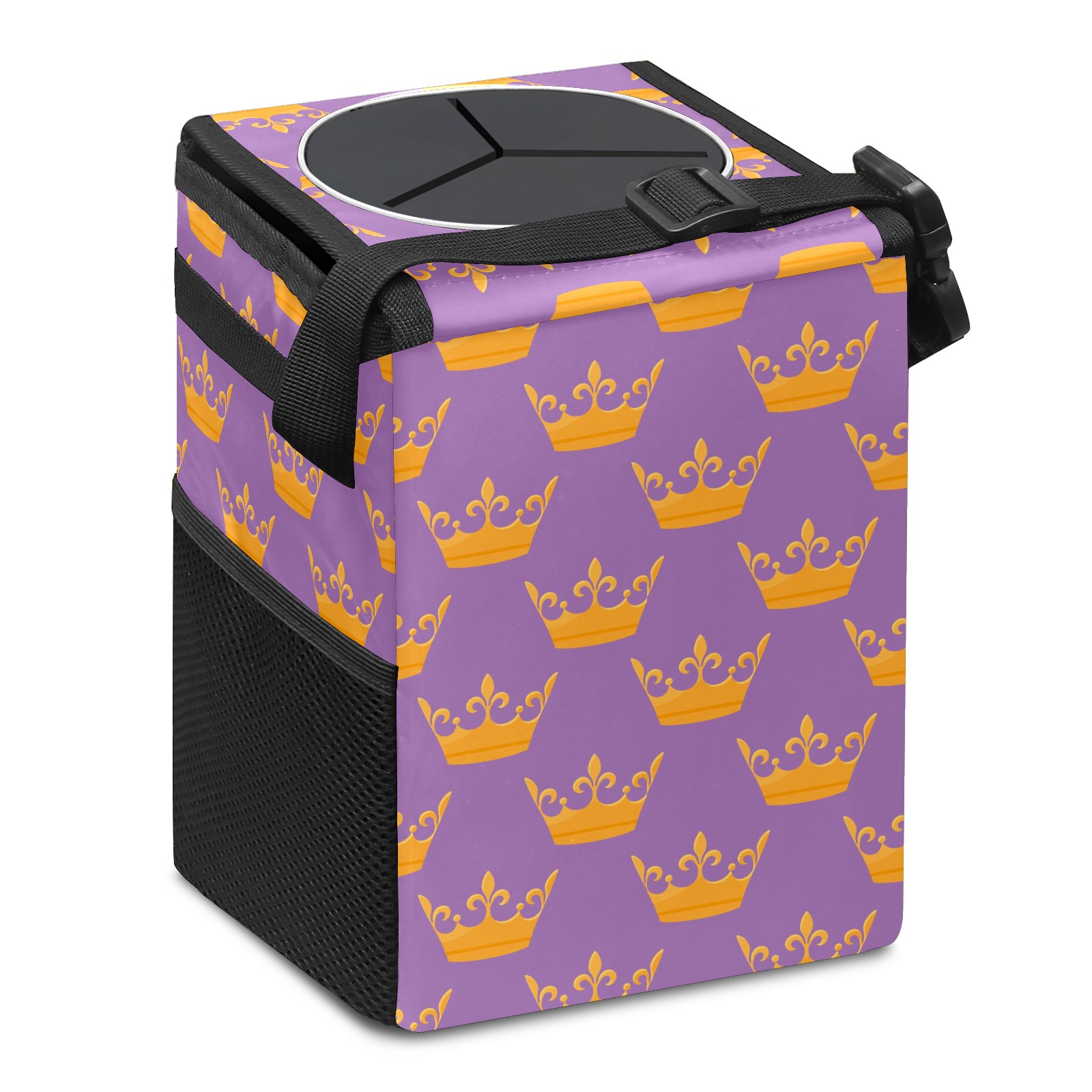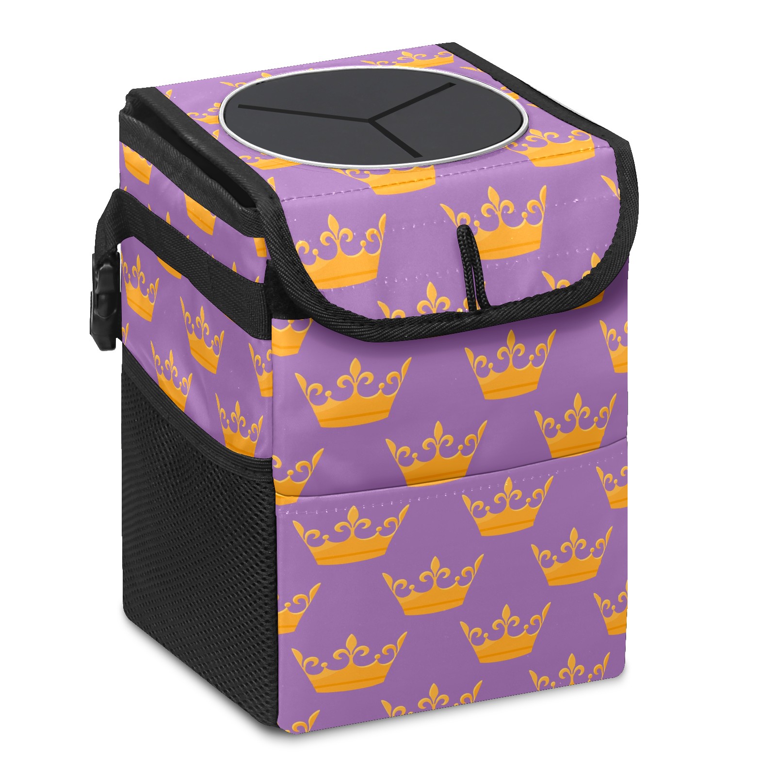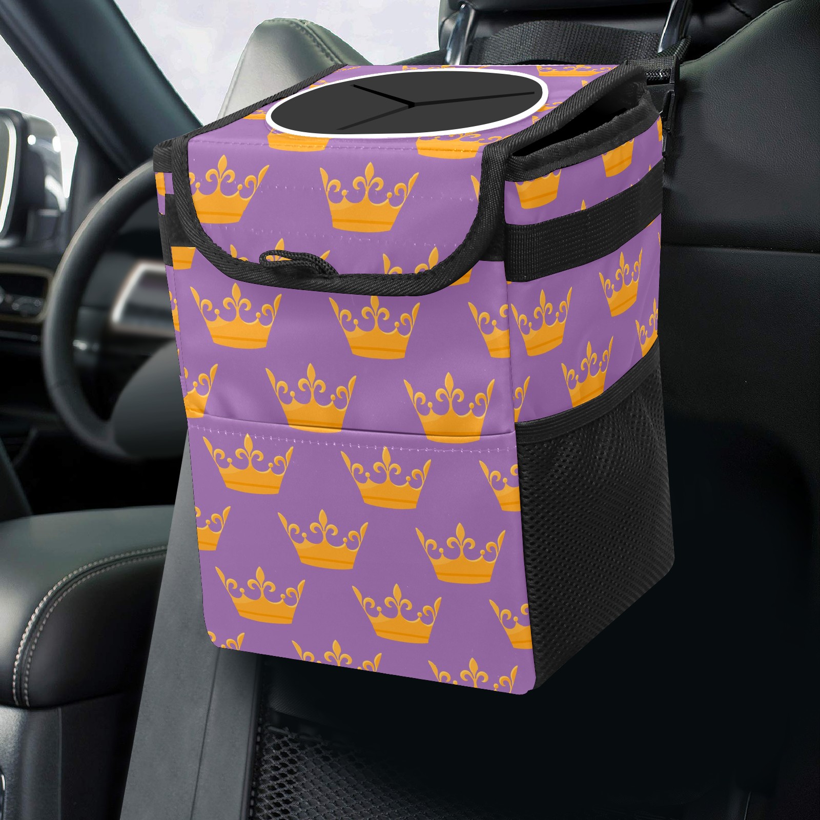 Car Garbage Can — Multi-functional, Lightweight Portable, Reusable Vehicle Trash Can, Waterproof with Sufficient Storage Capacity Golden Queen Crown Purple Background