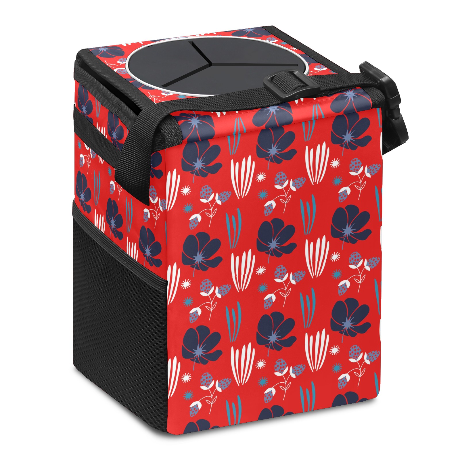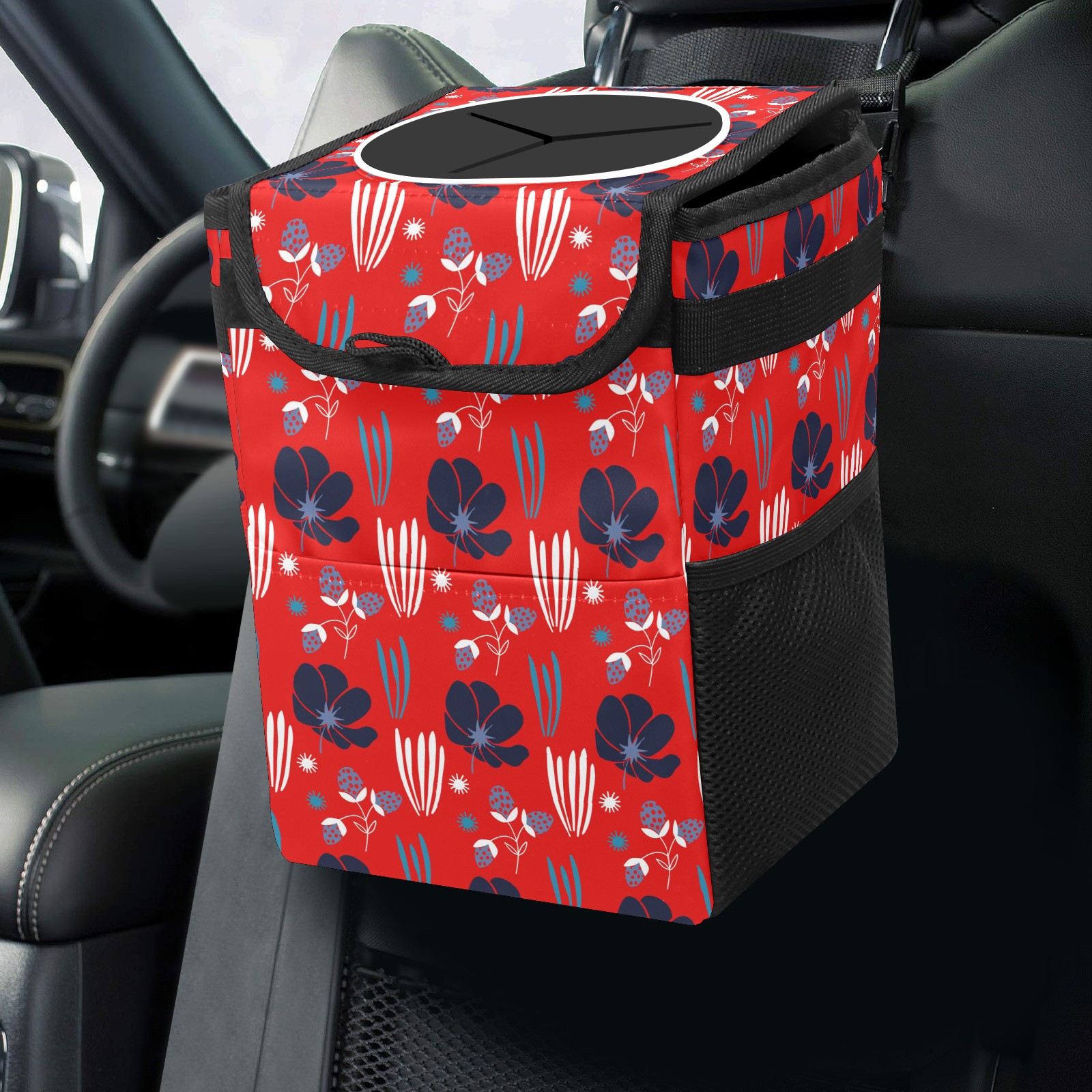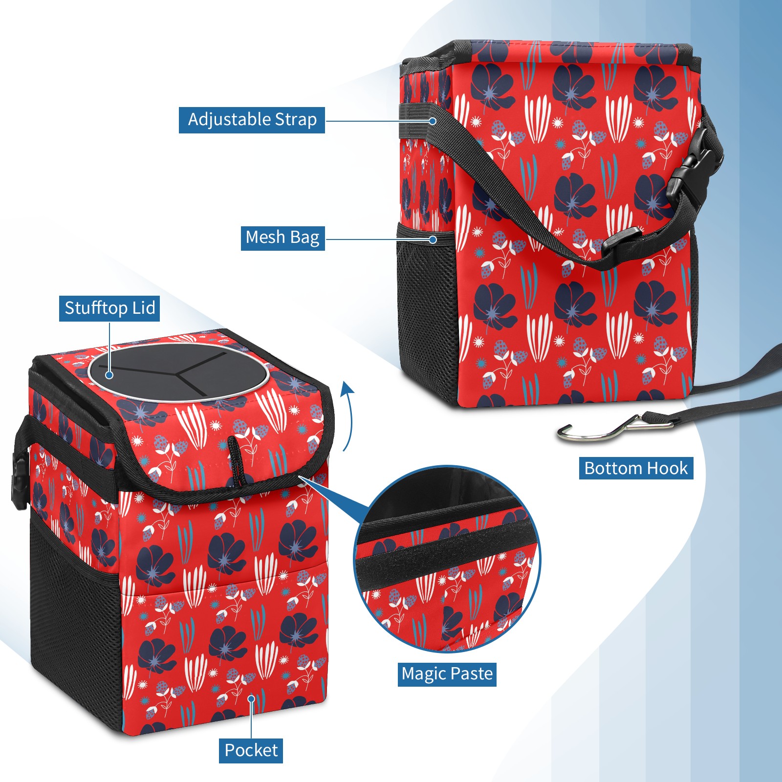 Car Garbage Can — Multi-functional, Lightweight Portable, Reusable Vehicle Trash Can, Waterproof with Sufficient Storage Capacity Blue Strawberry Floral Red Background