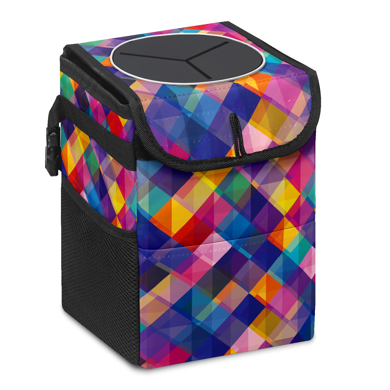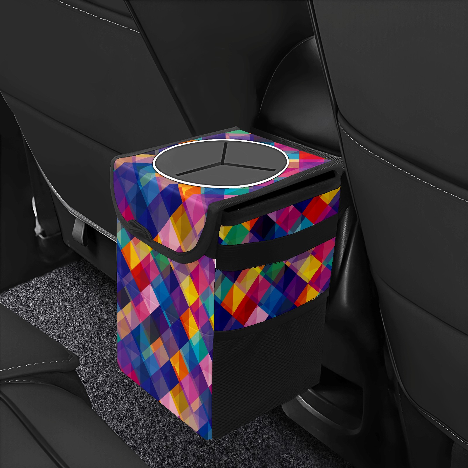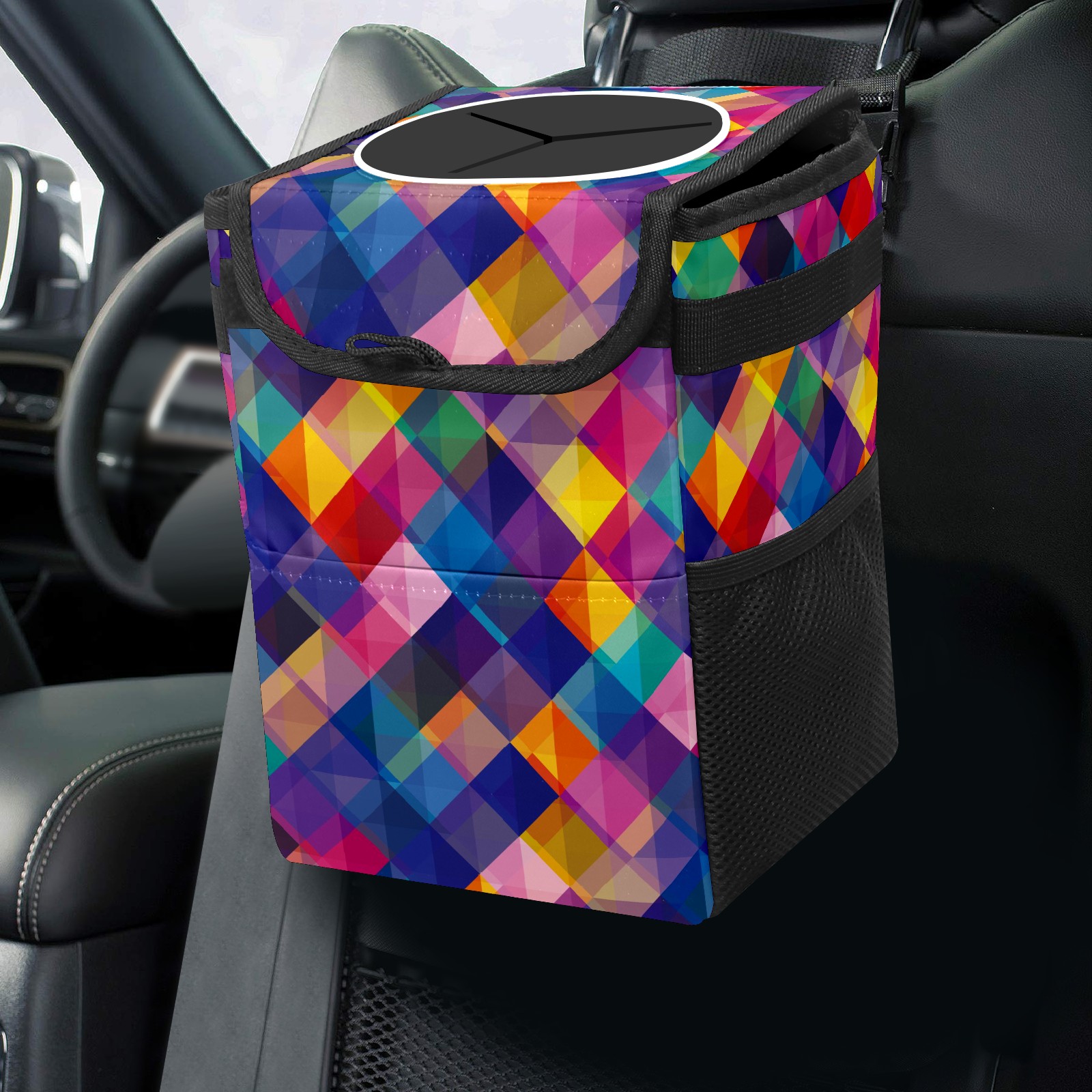 Car Garbage Can — Multi-functional, Lightweight Portable, Reusable Vehicle Trash Can, Waterproof with Sufficient Storage Capacity Abstract Colorful Geometric Square Pattern