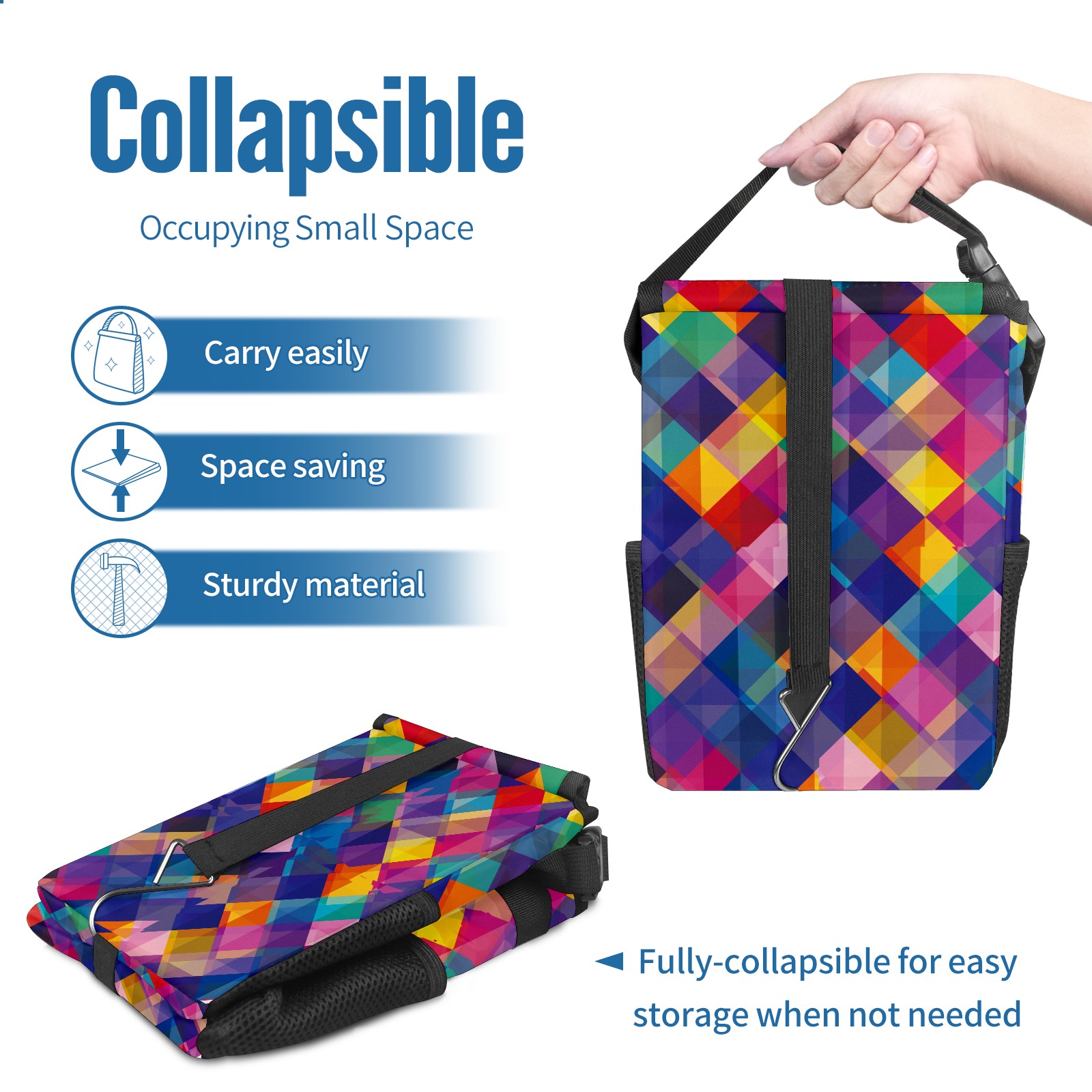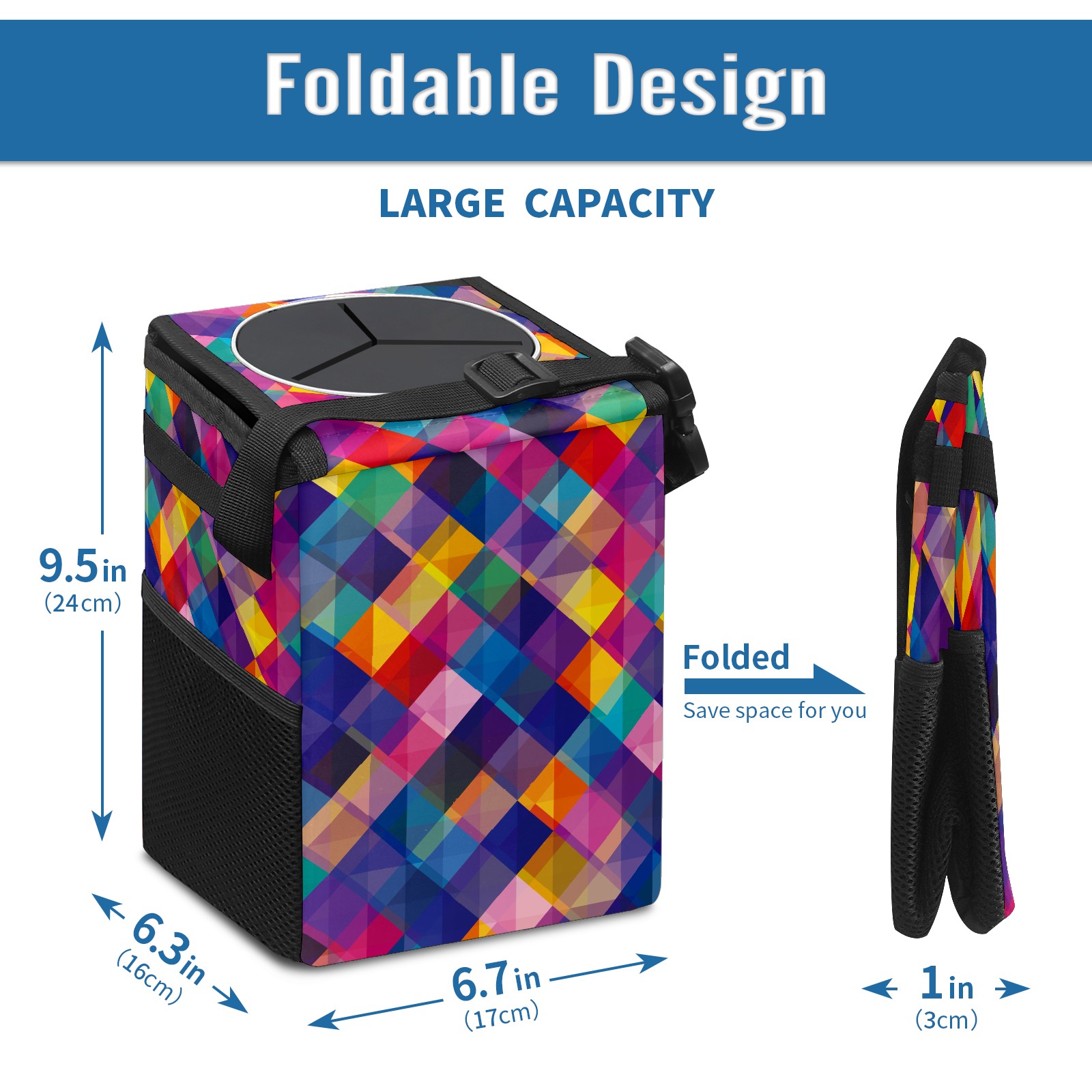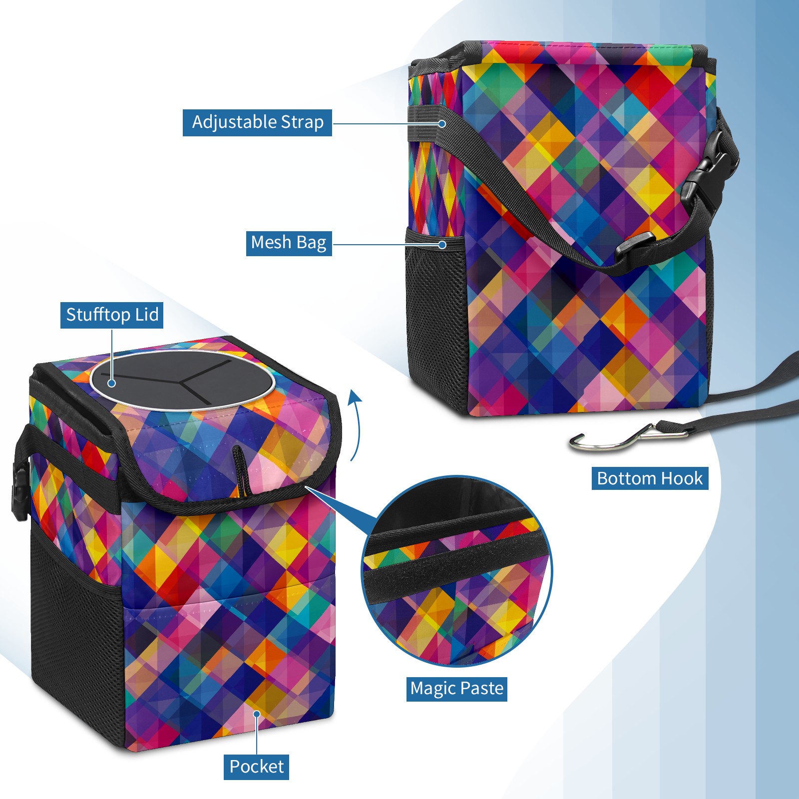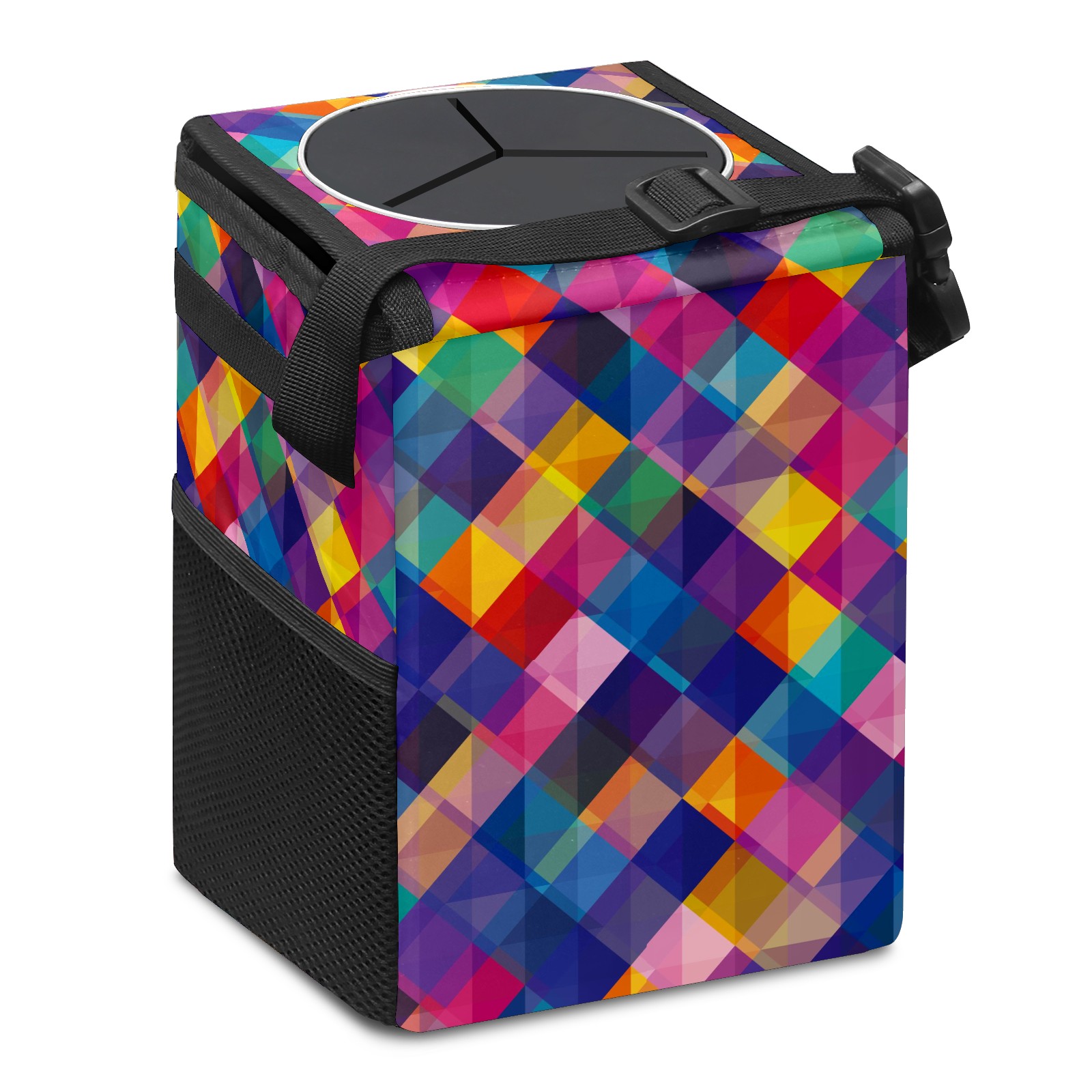 Car Garbage Can — Multi-functional, Lightweight Portable, Reusable Vehicle Trash Can, Waterproof with Sufficient Storage Capacity Abstract Colorful Geometric Square Pattern