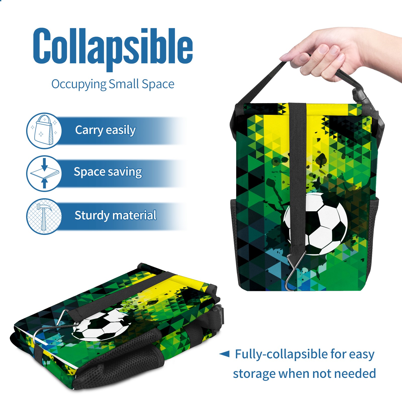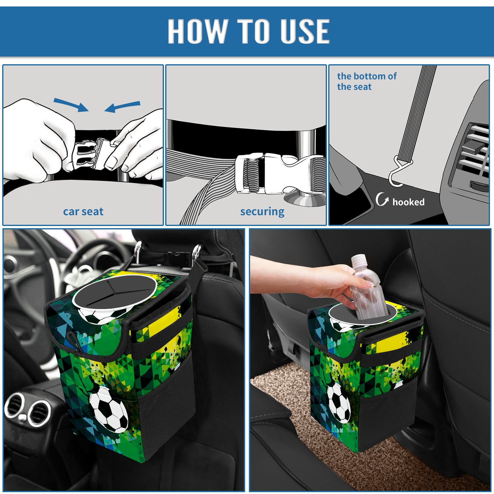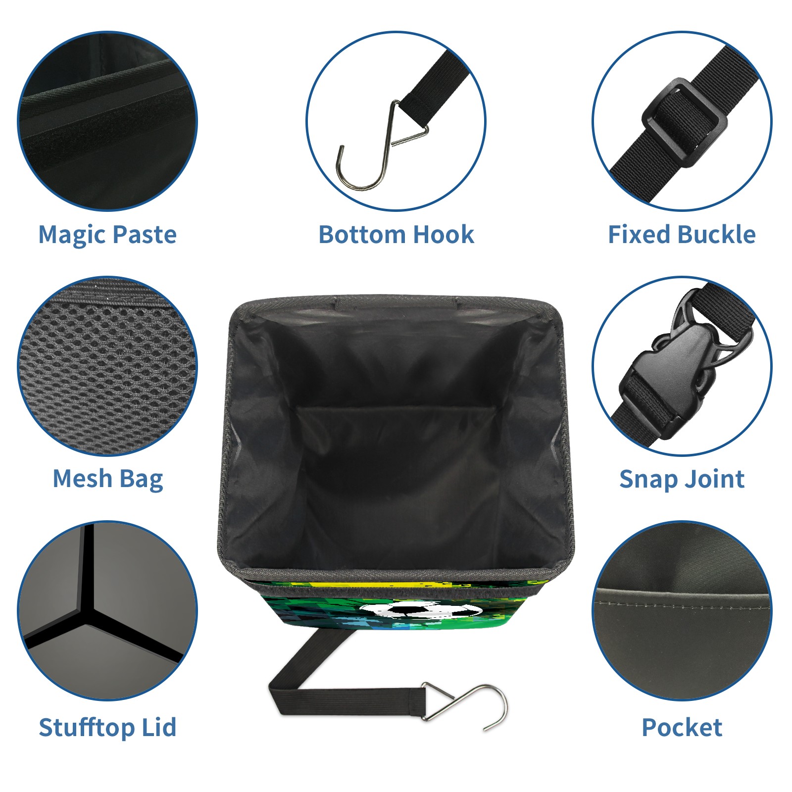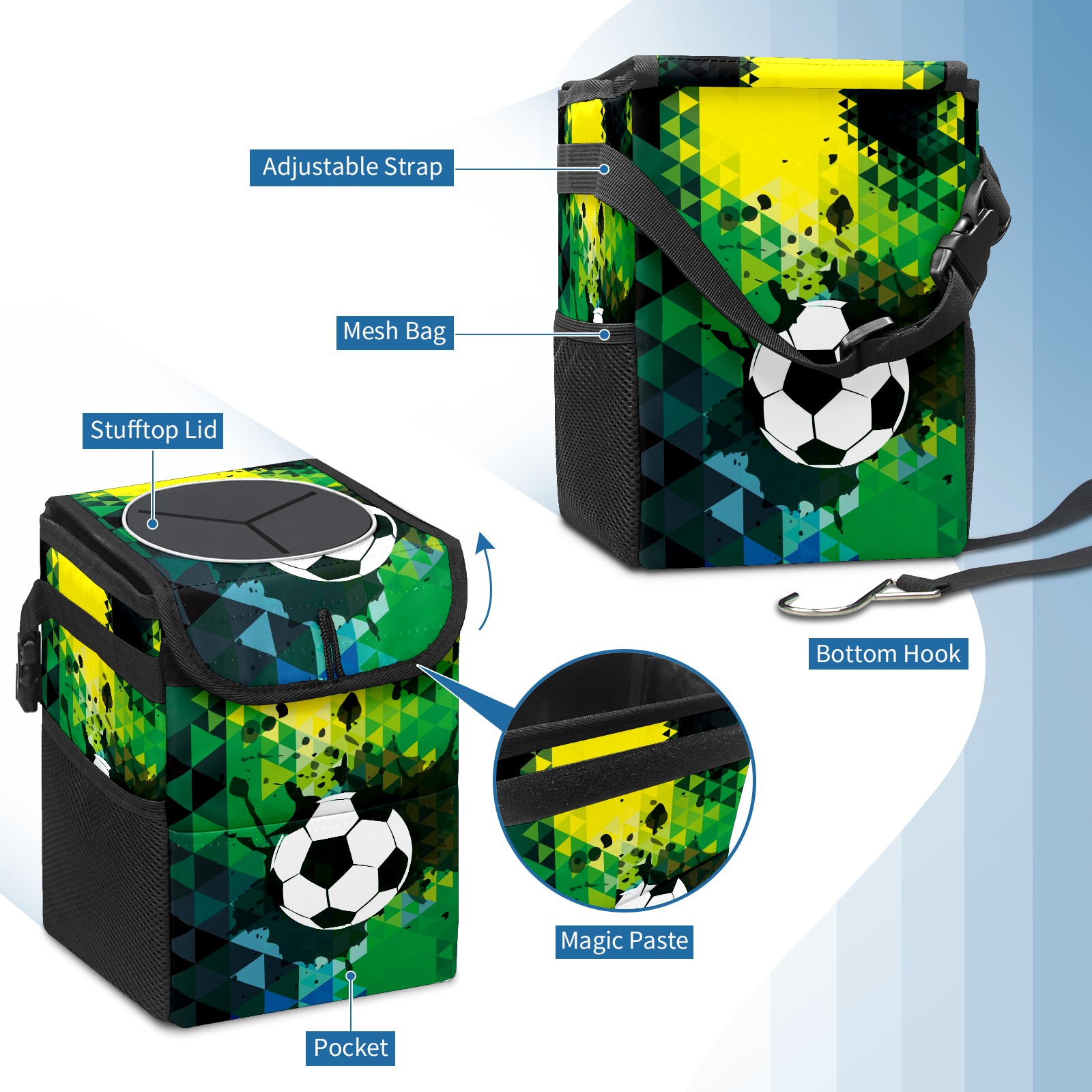 Car Garbage Can — Multi-functional, Lightweight Portable, Reusable Vehicle Trash Can, Waterproof with Sufficient Storage Capacity Black Green Doodle Sport Soccer