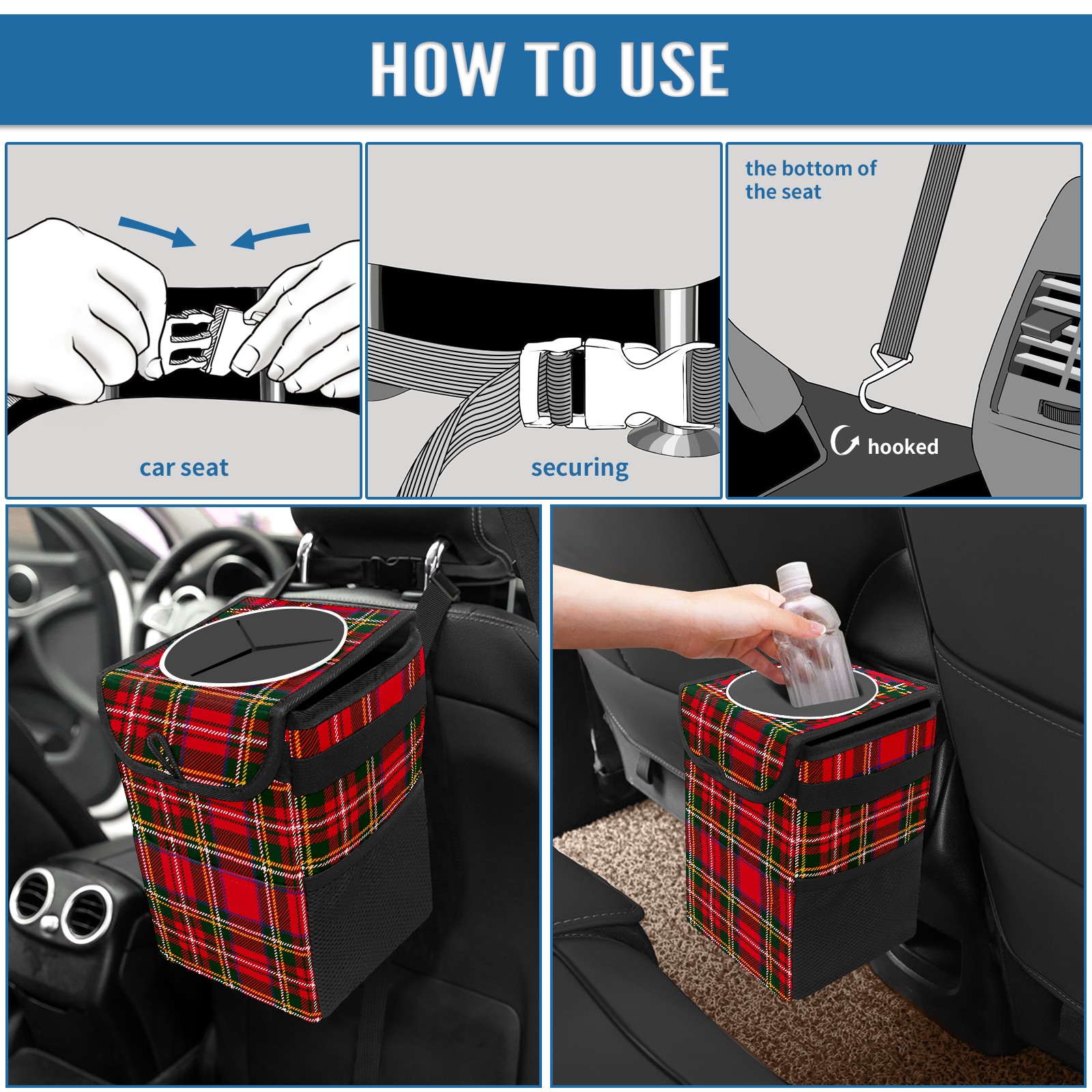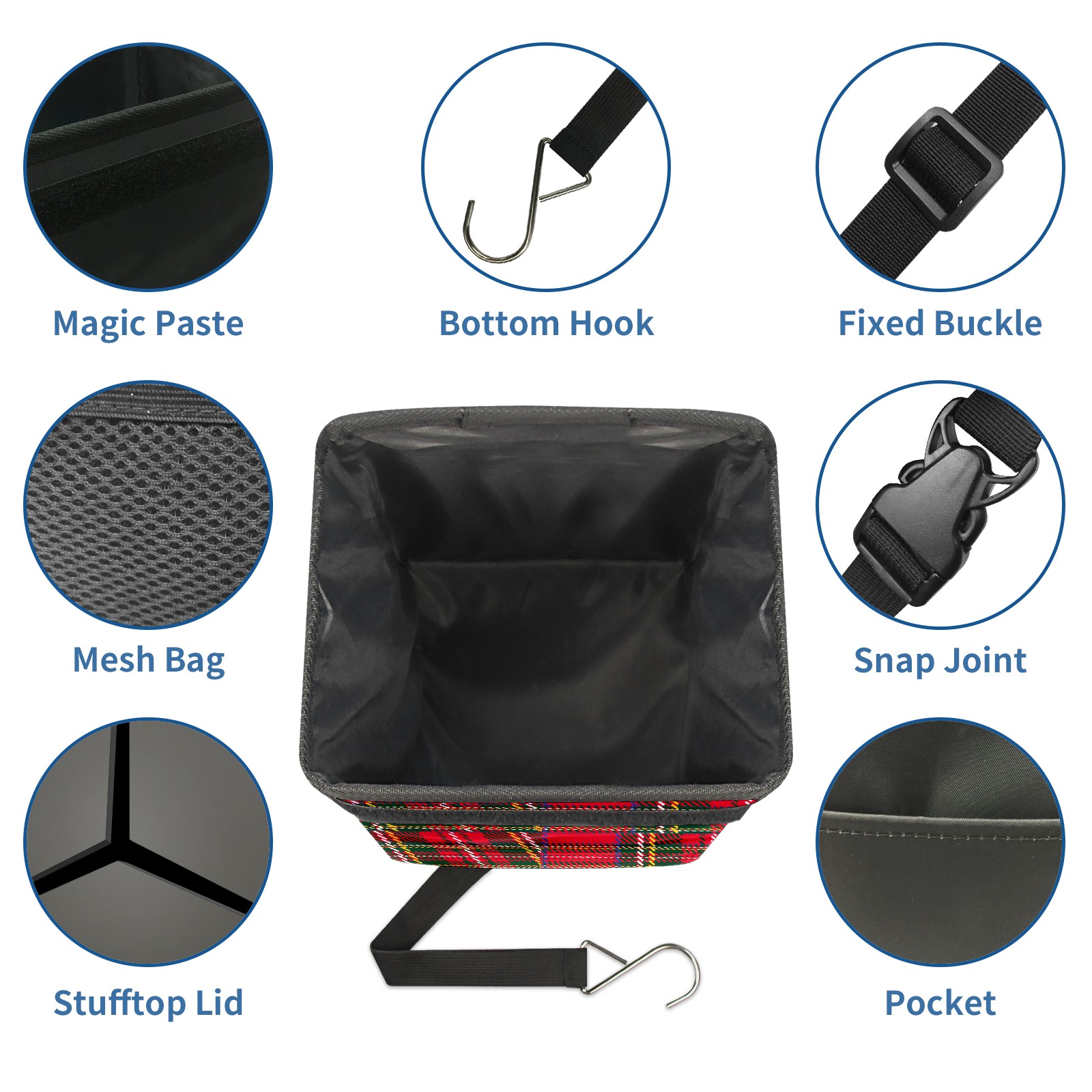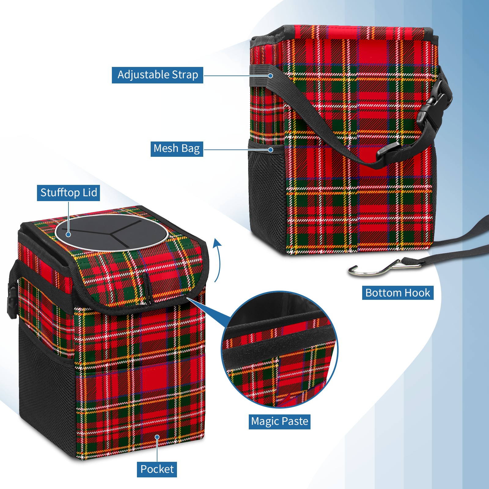 Car Garbage Can — Multi-functional, Lightweight Portable, Reusable Vehicle Trash Can, Waterproof with Sufficient Storage Capacity Red Green Tartan Plaid Pattern