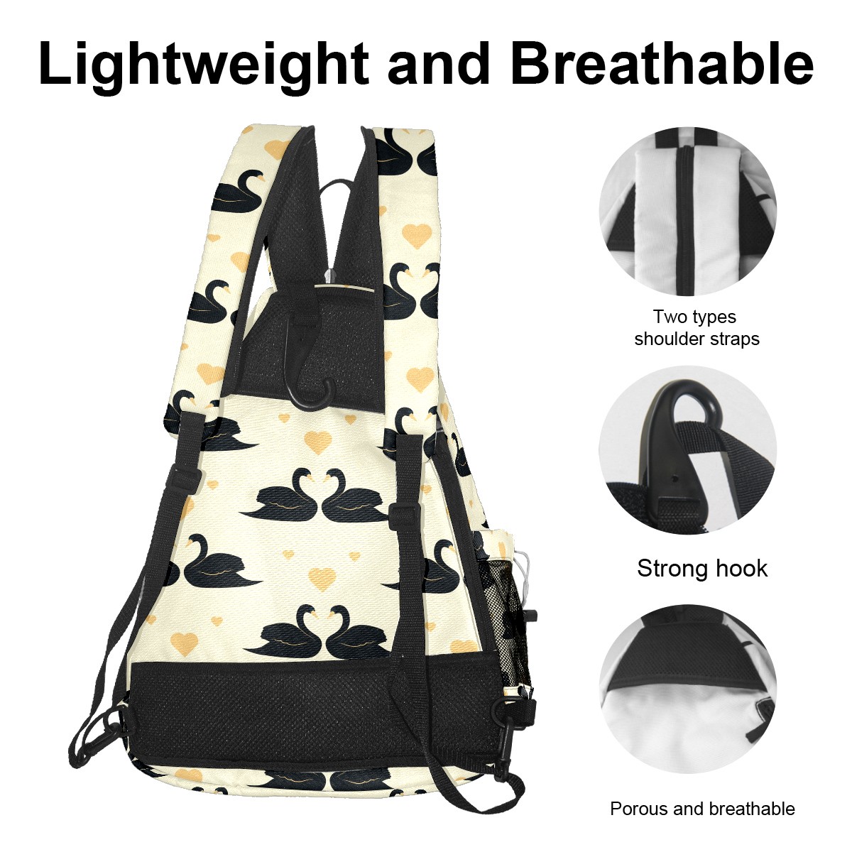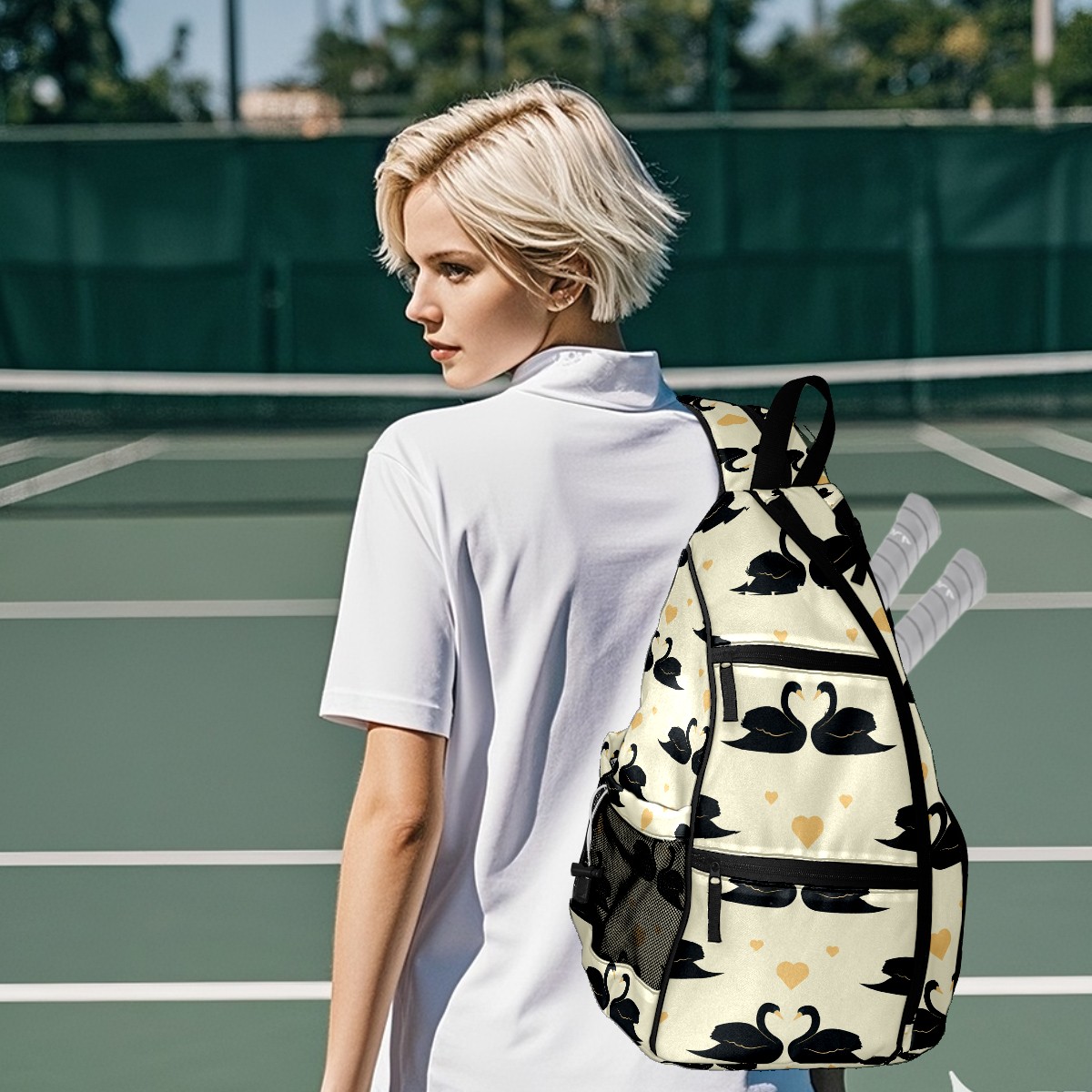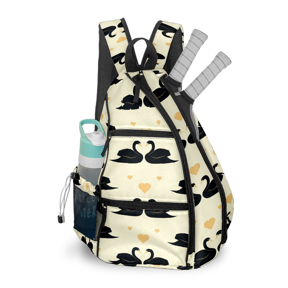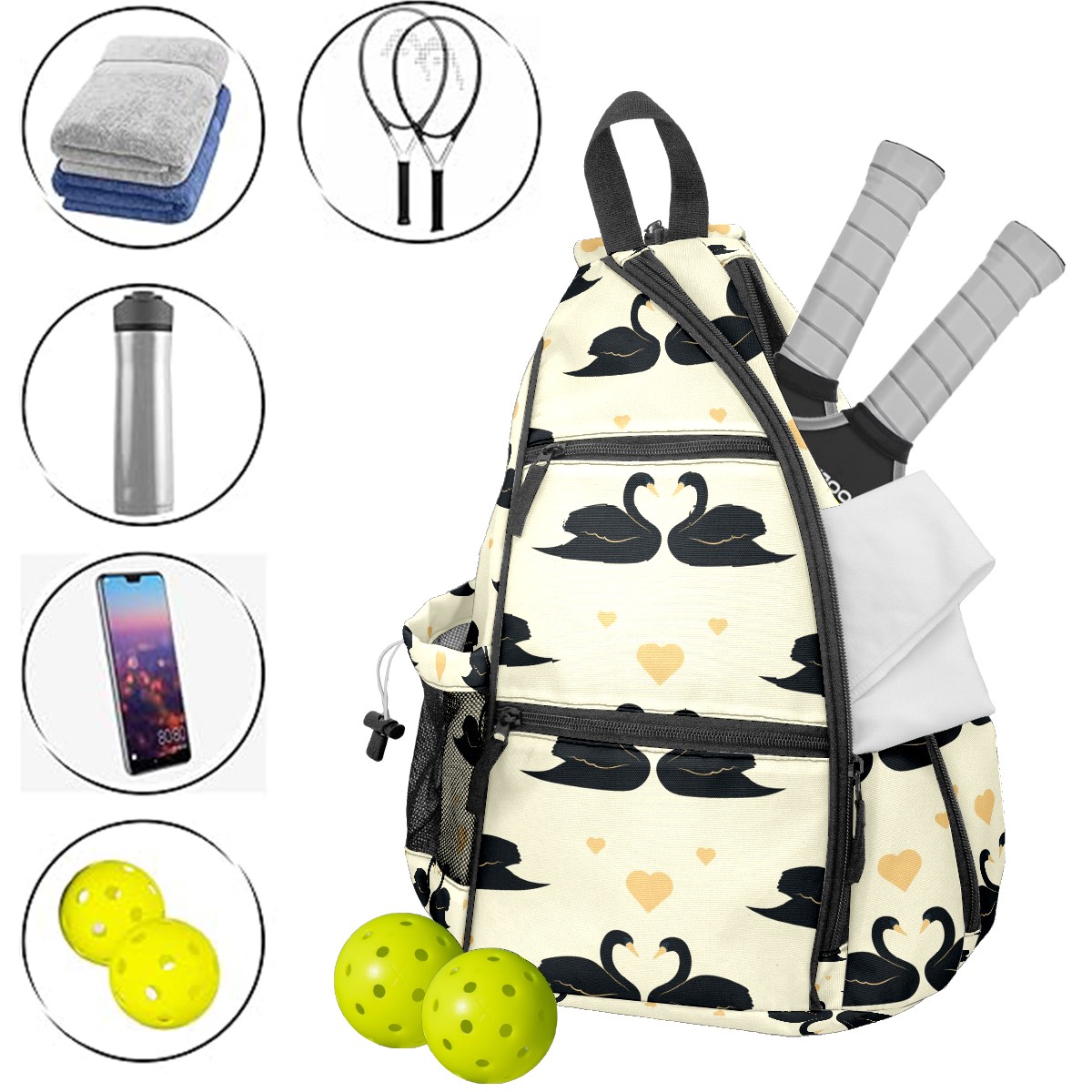 Multifunctional Pickleball Bag,Large Capacity Sports Pickleball Racket Bag, Water Bottle Holder and Fence Hook,Suitable for Both Men Women -Elegant Black Swan Couple Love Heart Yellow
