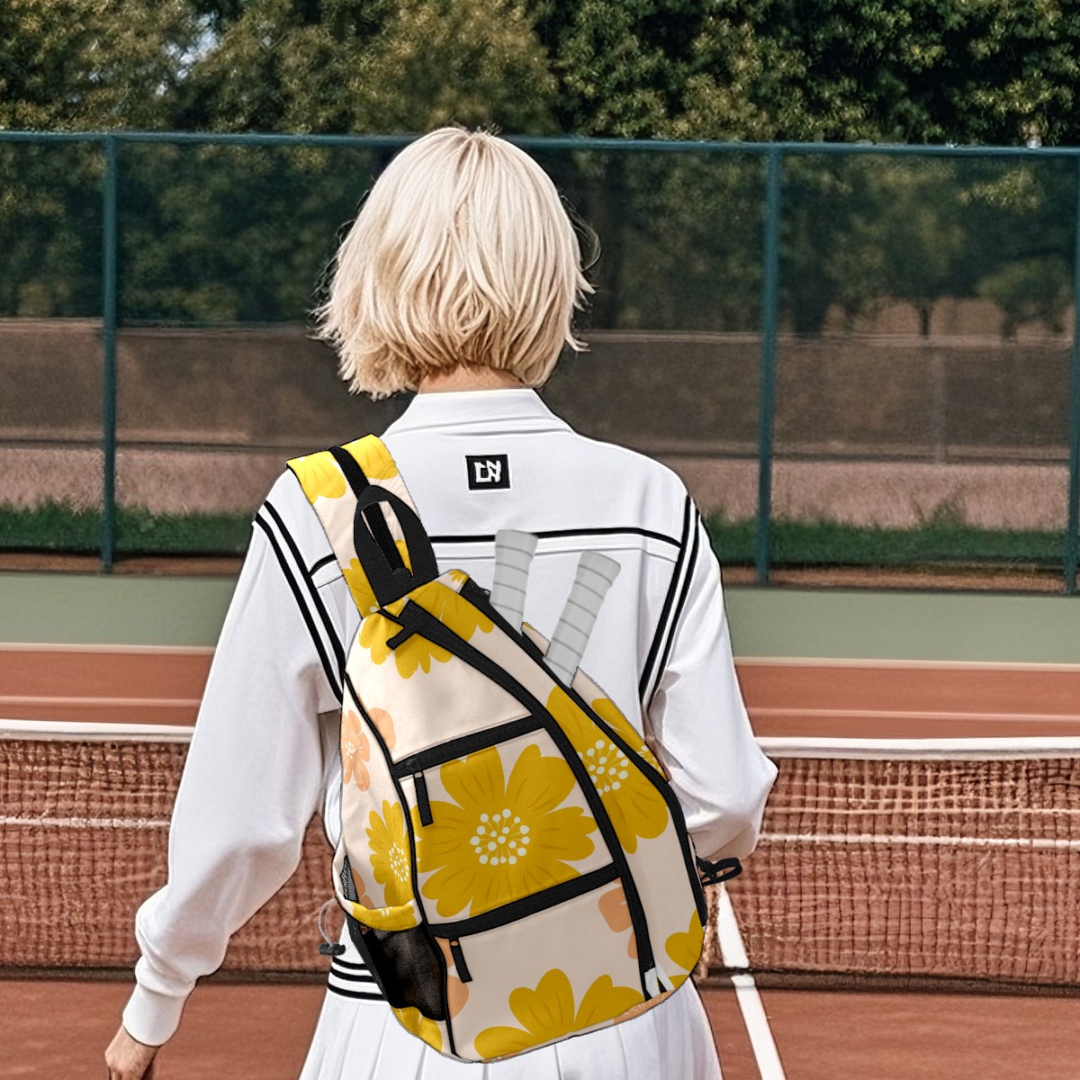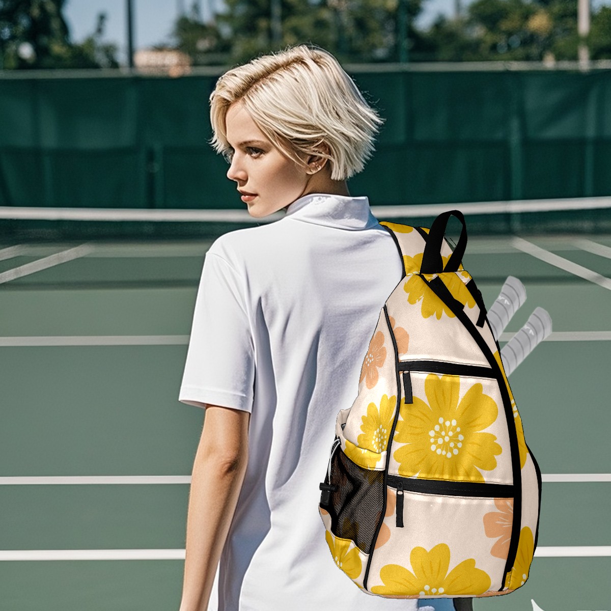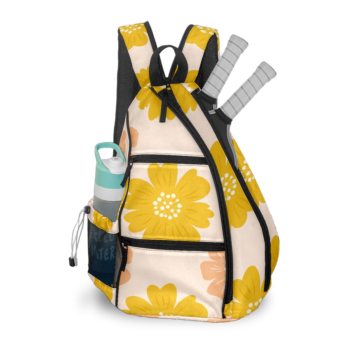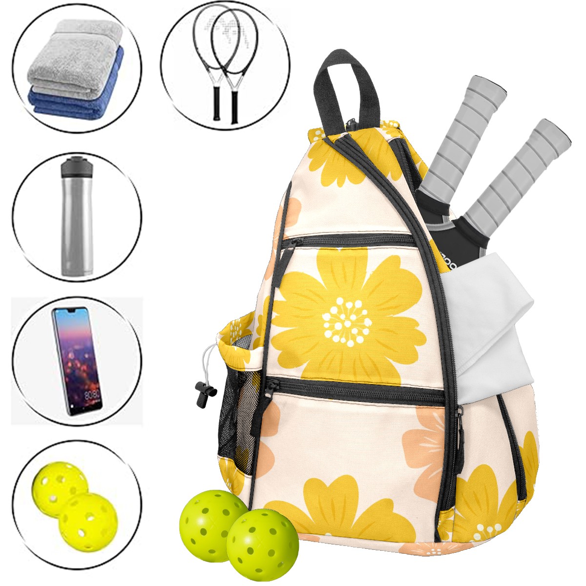 Multifunctional Pickleball Bag,Large Capacity Sports Pickleball Racket Bag, Water Bottle Holder and Fence Hook,Suitable for Both Men Women -Yellow Orange Floral Pattern Warm