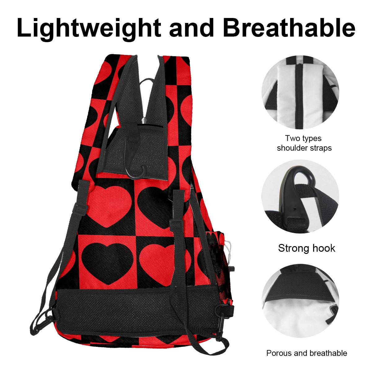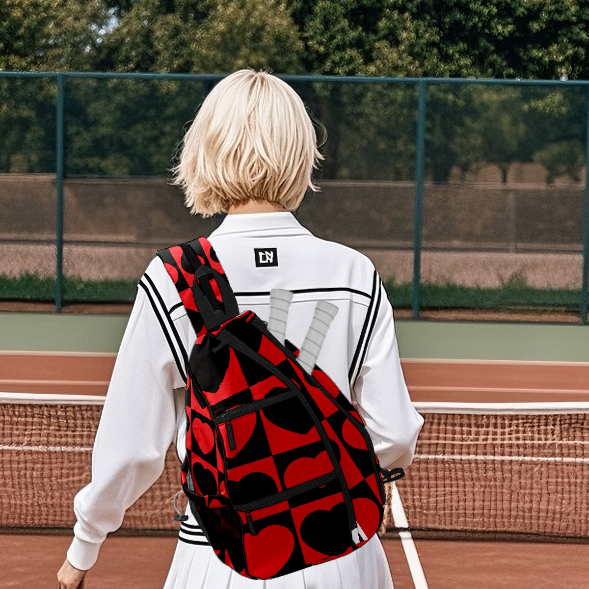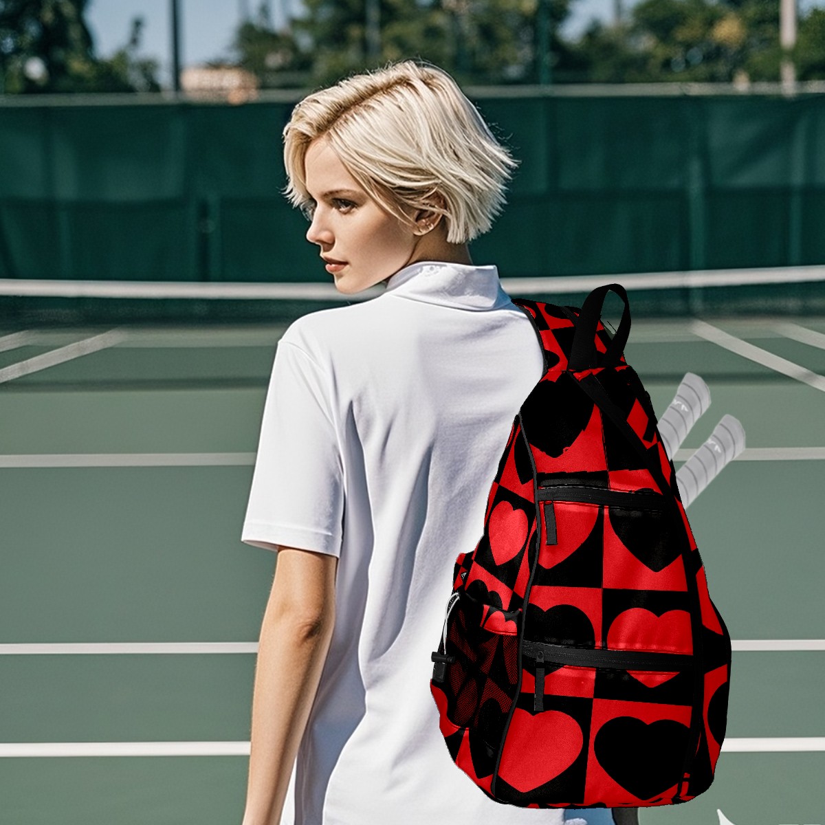 Multifunctional Pickleball Bag,Large Capacity Sports Pickleball Racket Bag, Water Bottle Holder and Fence Hook,Suitable for Both Men Women -Red Black Love Heart Mosaic Square