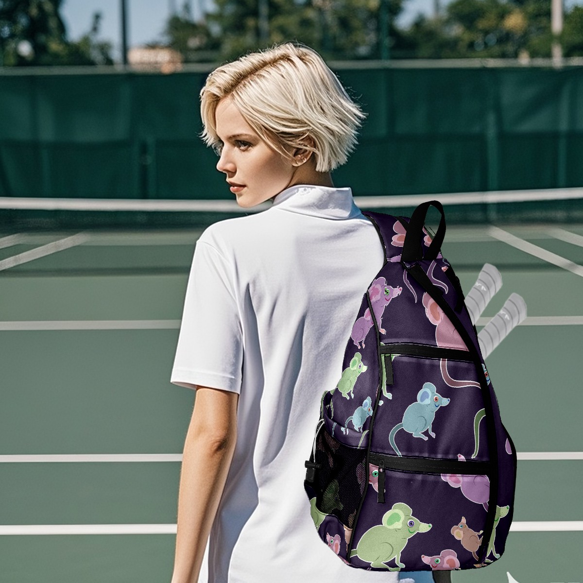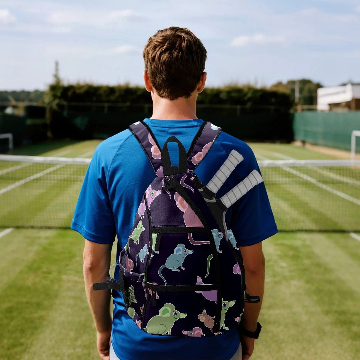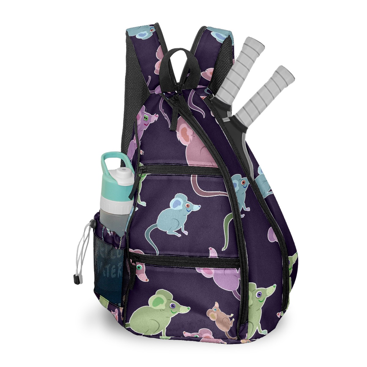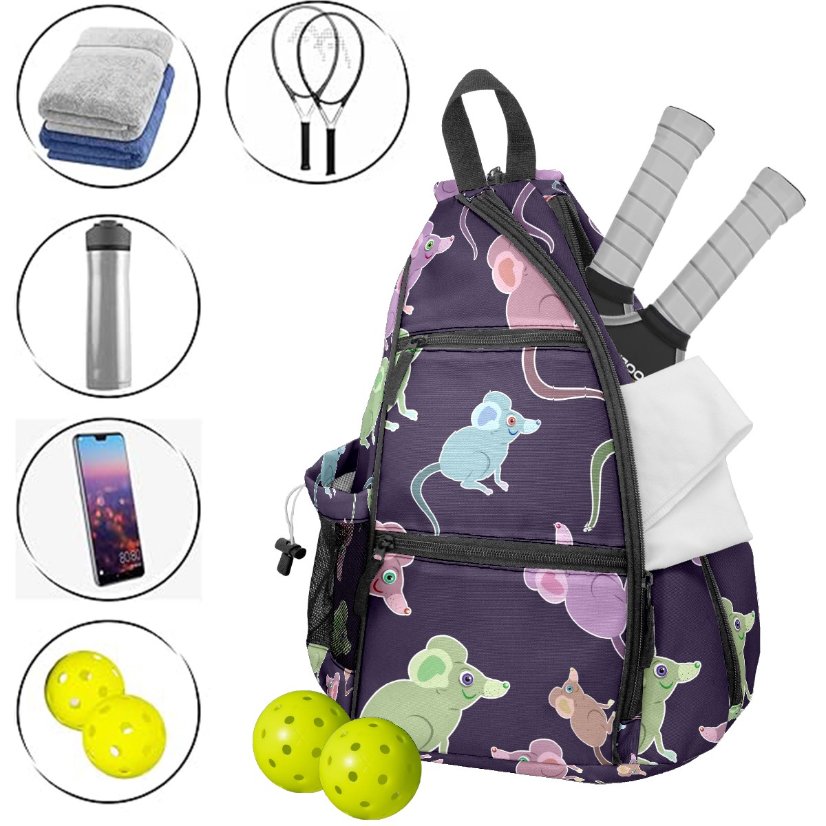Multifunctional Pickleball Bag,Large Capacity Sports Pickleball Racket Bag, Water Bottle Holder and Fence Hook,Suitable for Both Men Women -Purple Green Blue Mice Pattern