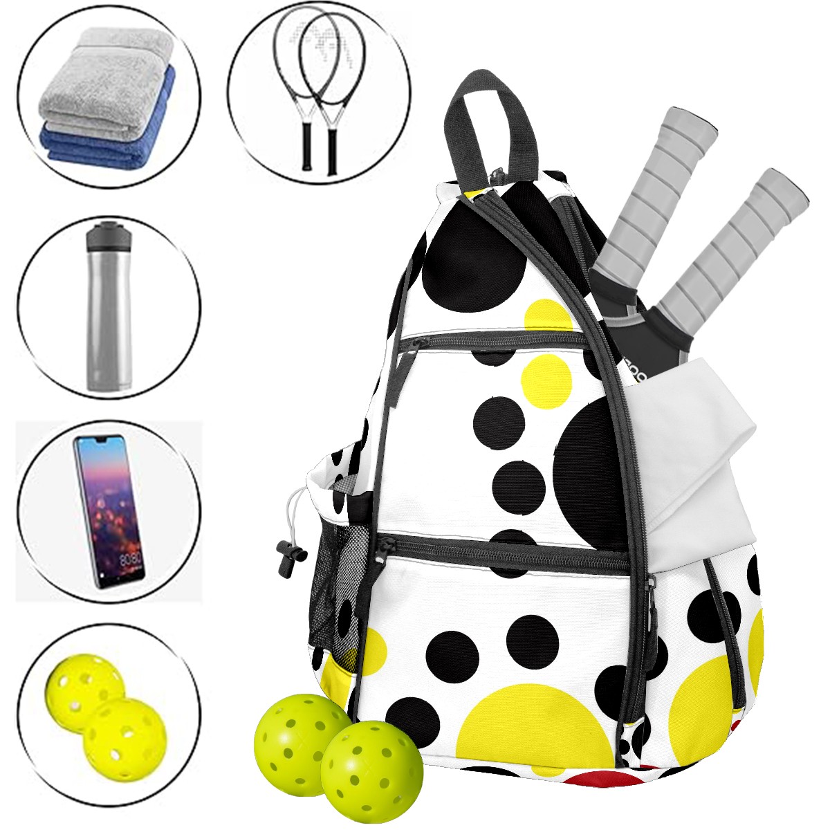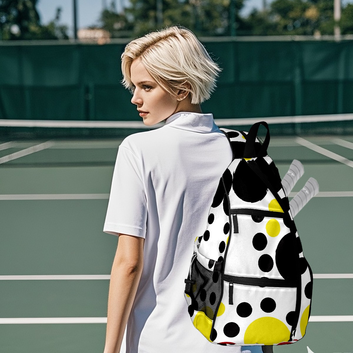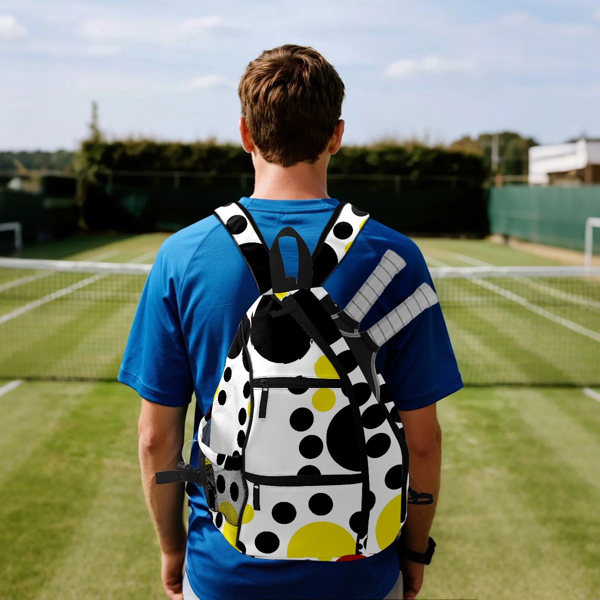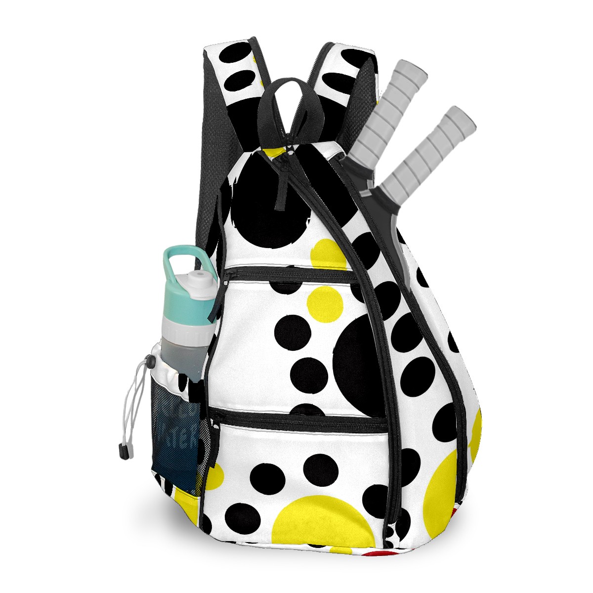 Multifunctional Pickleball Bag,Large Capacity Sports Pickleball Racket Bag, Water Bottle Holder and Fence Hook,Suitable for Both Men Women -Black Yellow Red Circle Dot Pattern