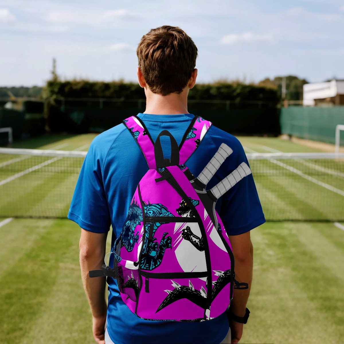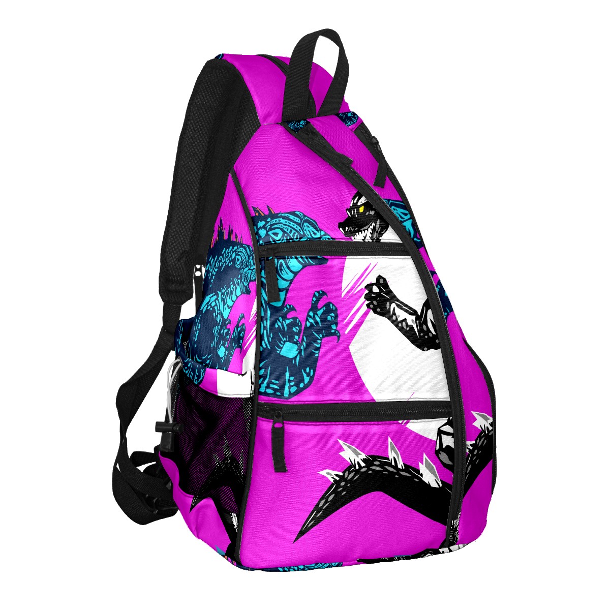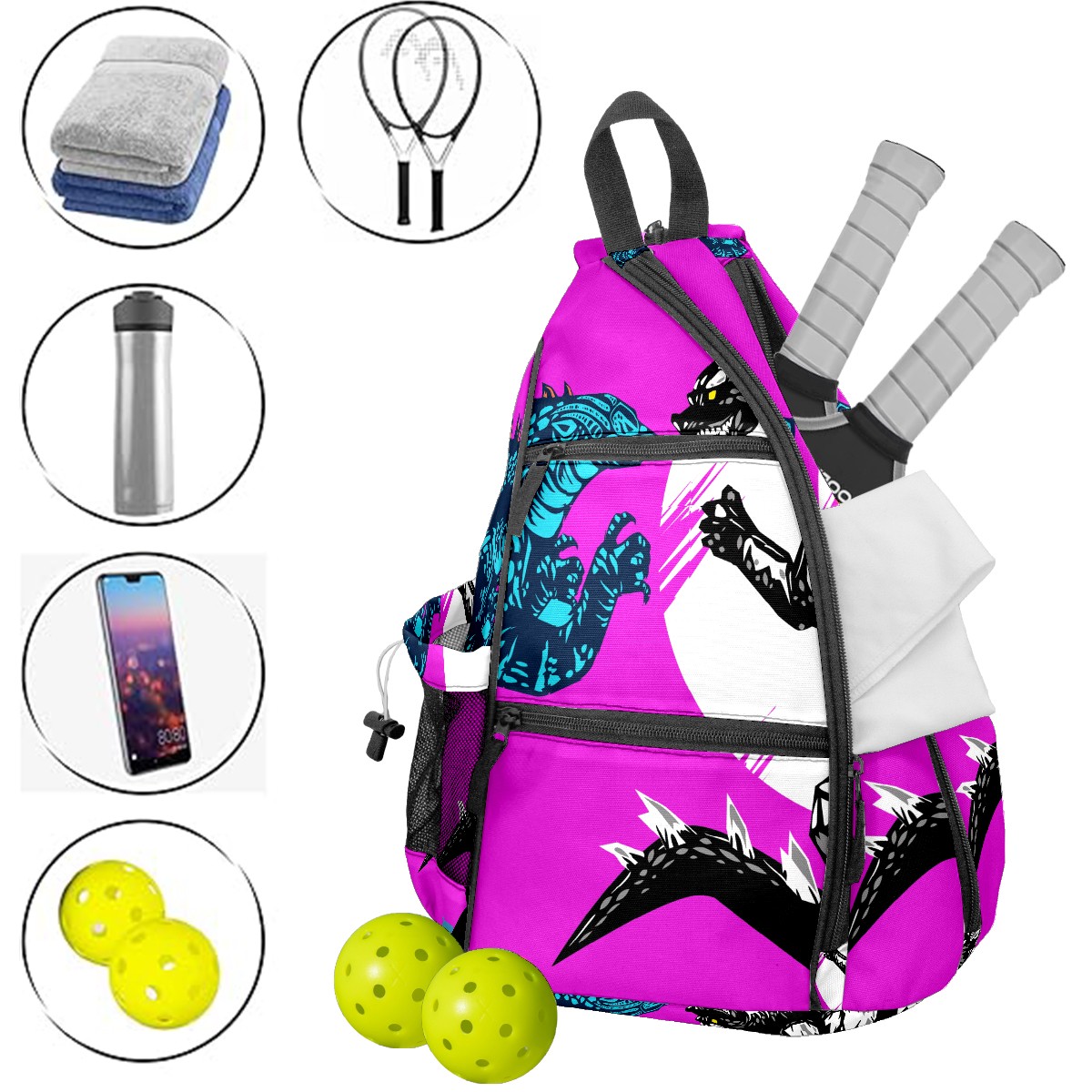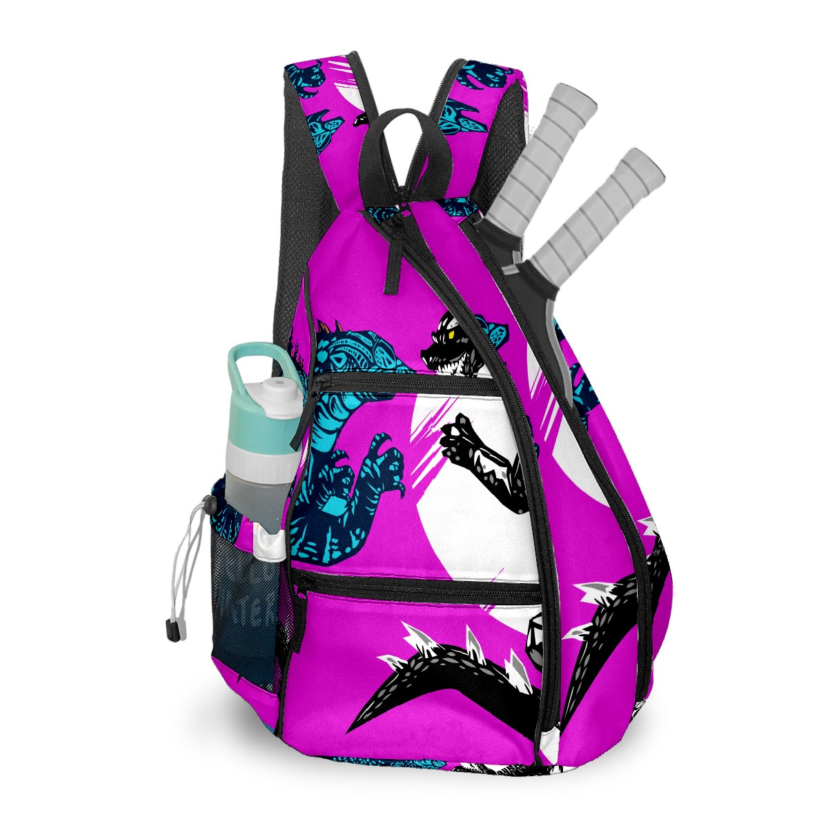 Multifunctional Pickleball Bag,Large Capacity Sports Pickleball Racket Bag, Water Bottle Holder and Fence Hook,Suitable for Both Men Women -Two Godzilla Dinosaur Fight Yellow Purple