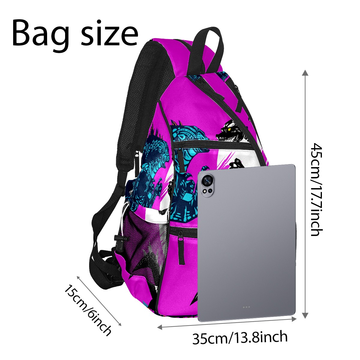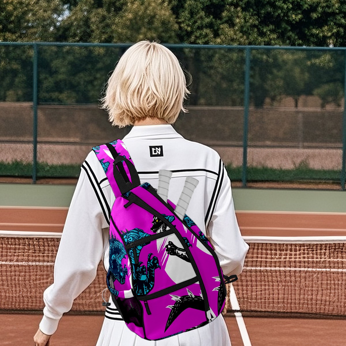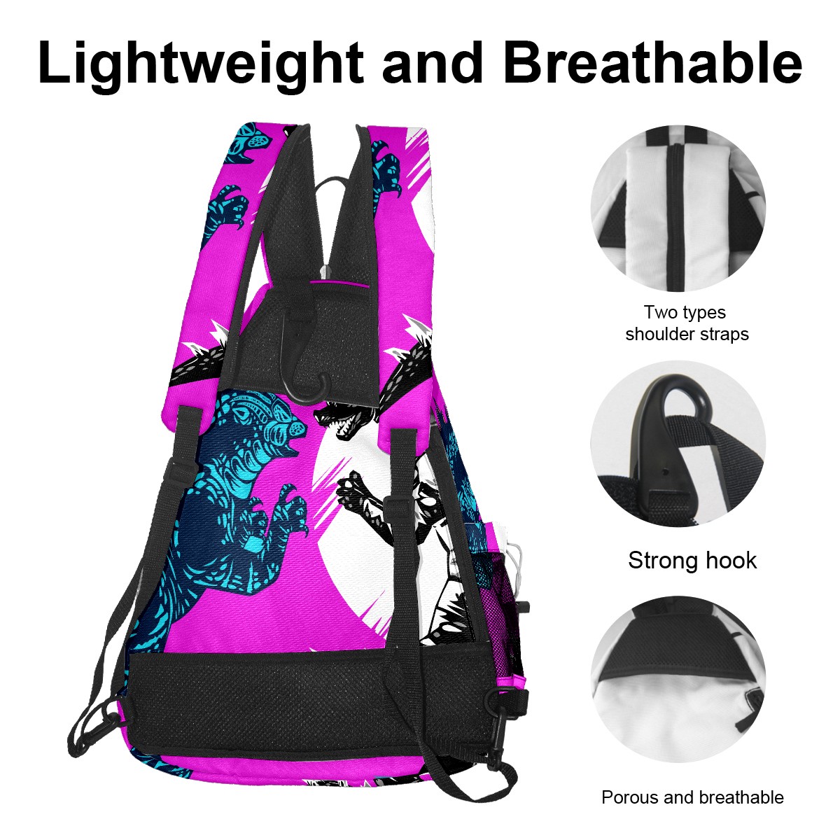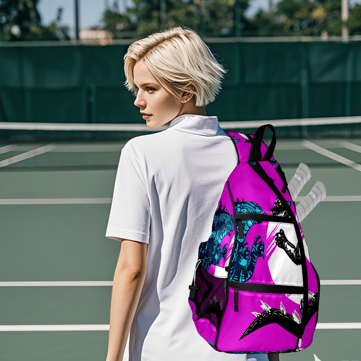 Multifunctional Pickleball Bag,Large Capacity Sports Pickleball Racket Bag, Water Bottle Holder and Fence Hook,Suitable for Both Men Women -Two Godzilla Dinosaur Fight Yellow Purple