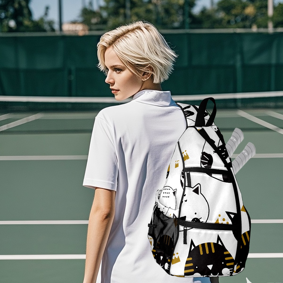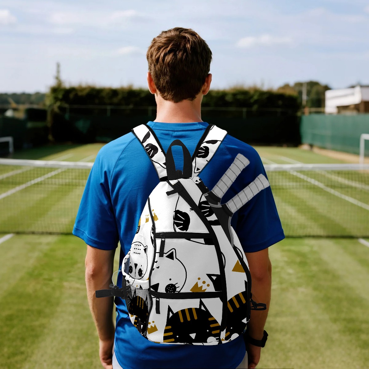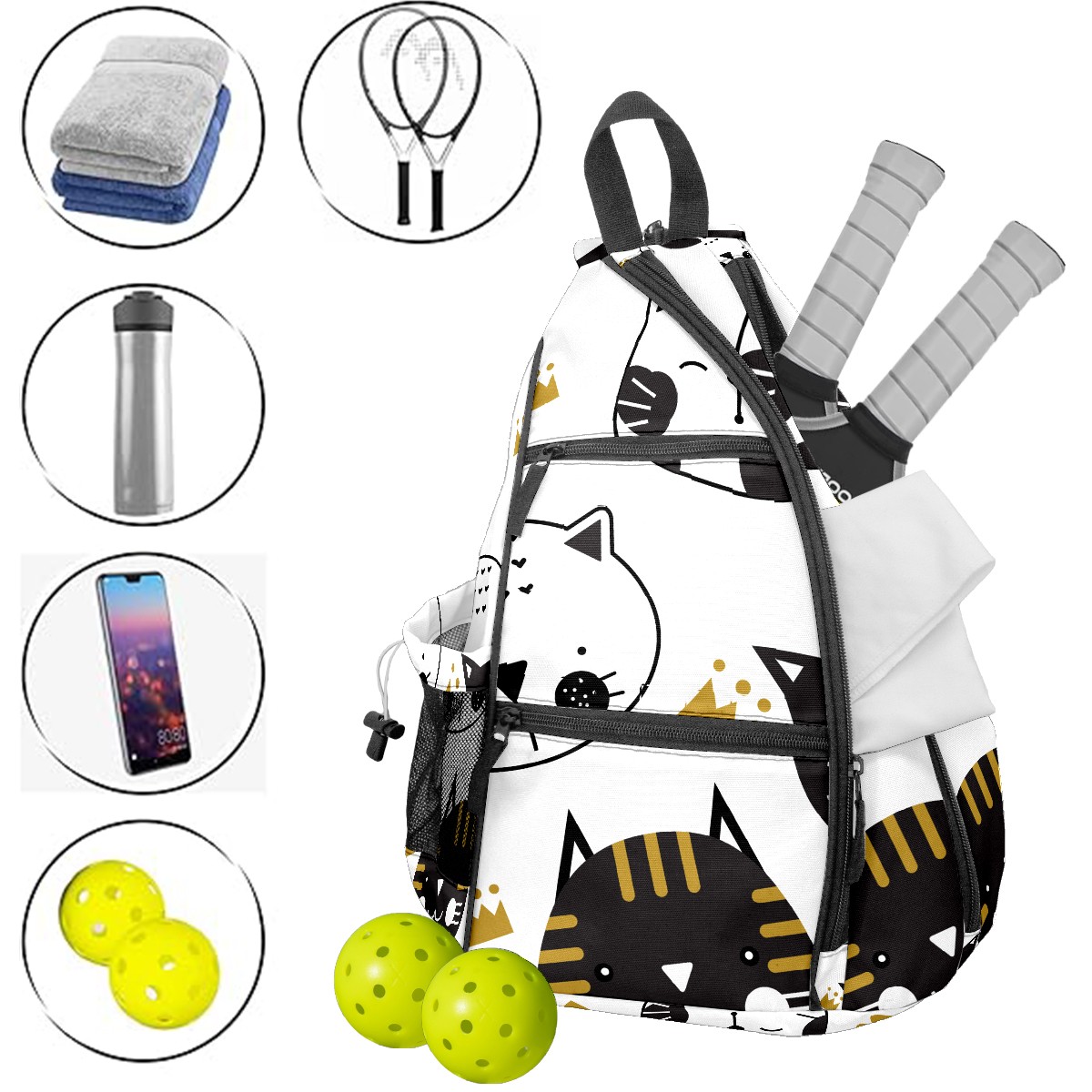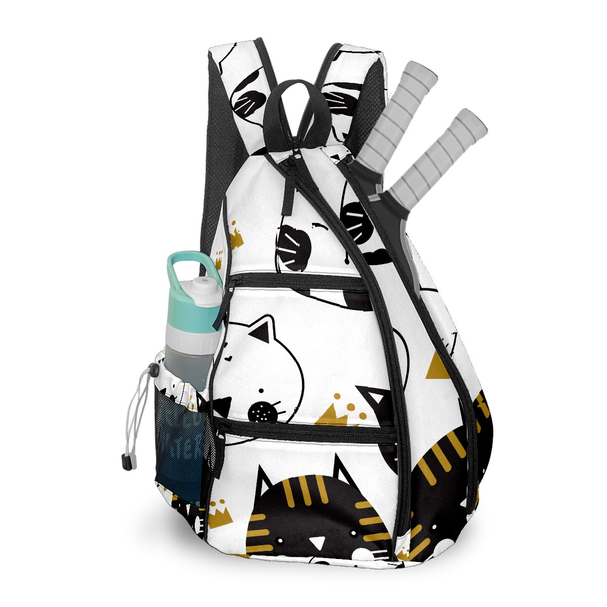 Multifunctional Pickleball Bag,Large Capacity Sports Pickleball Racket Bag, Water Bottle Holder and Fence Hook,Suitable for Both Men Women -Black And White Cats
