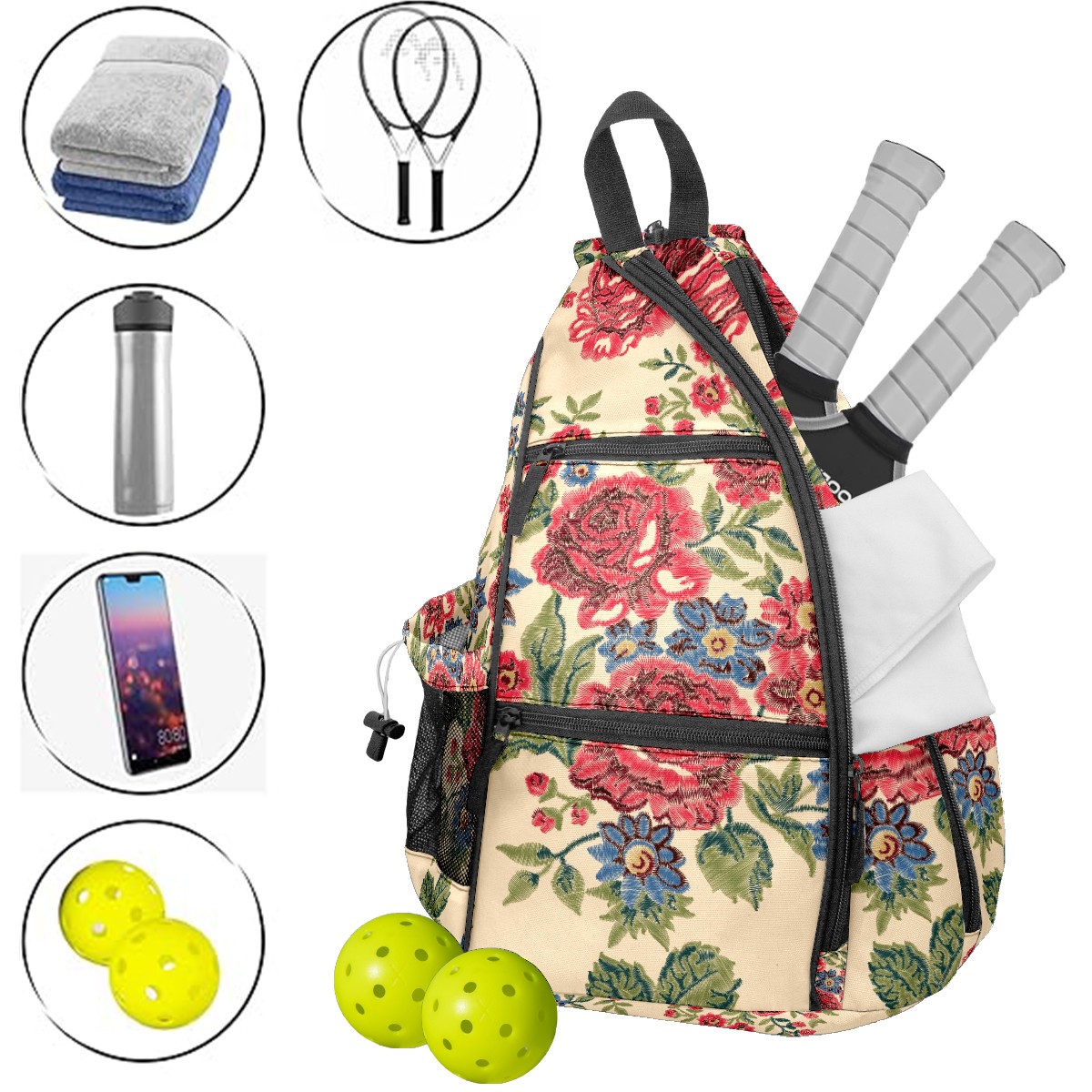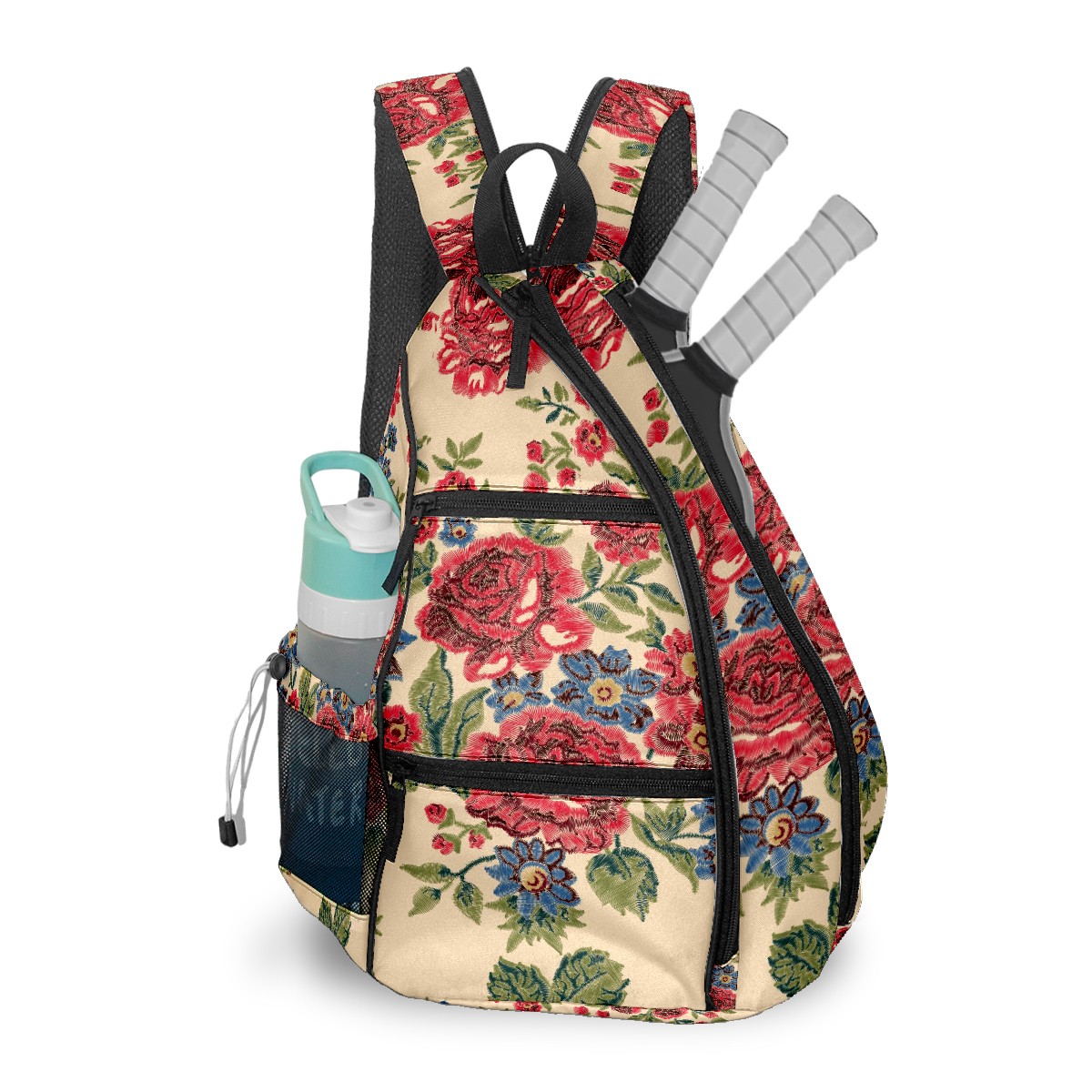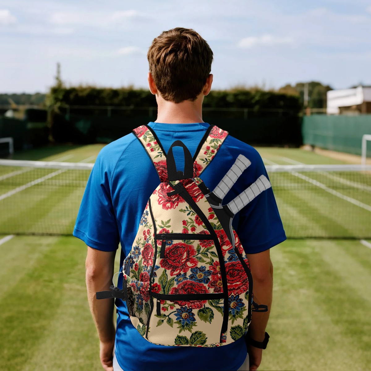 Multifunctional Pickleball Bag,Large Capacity Sports Pickleball Racket Bag, Water Bottle Holder and Fence Hook,Suitable for Both Men Women -Blue And Red Flower