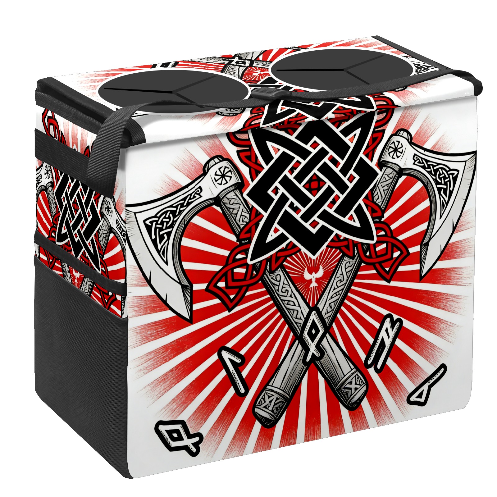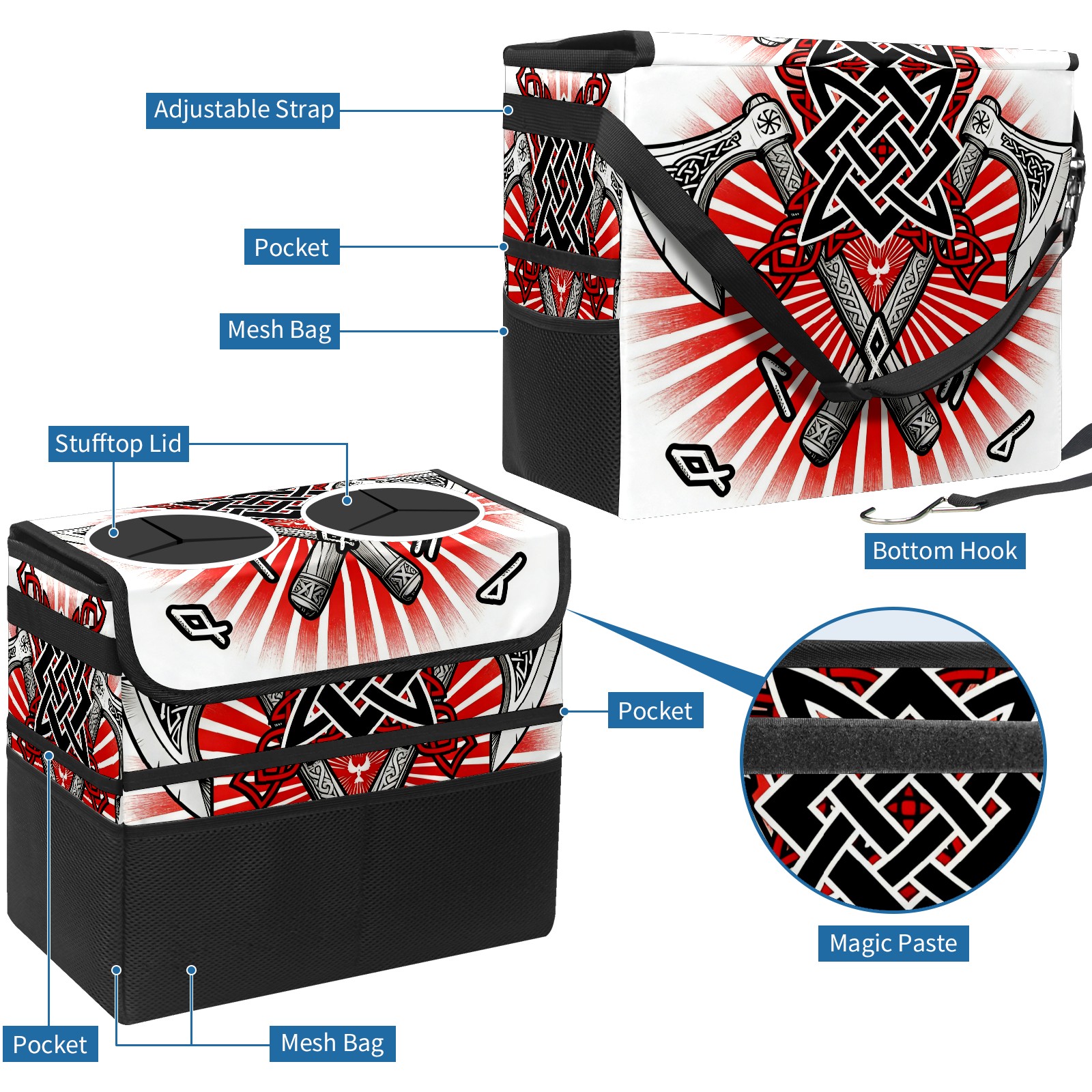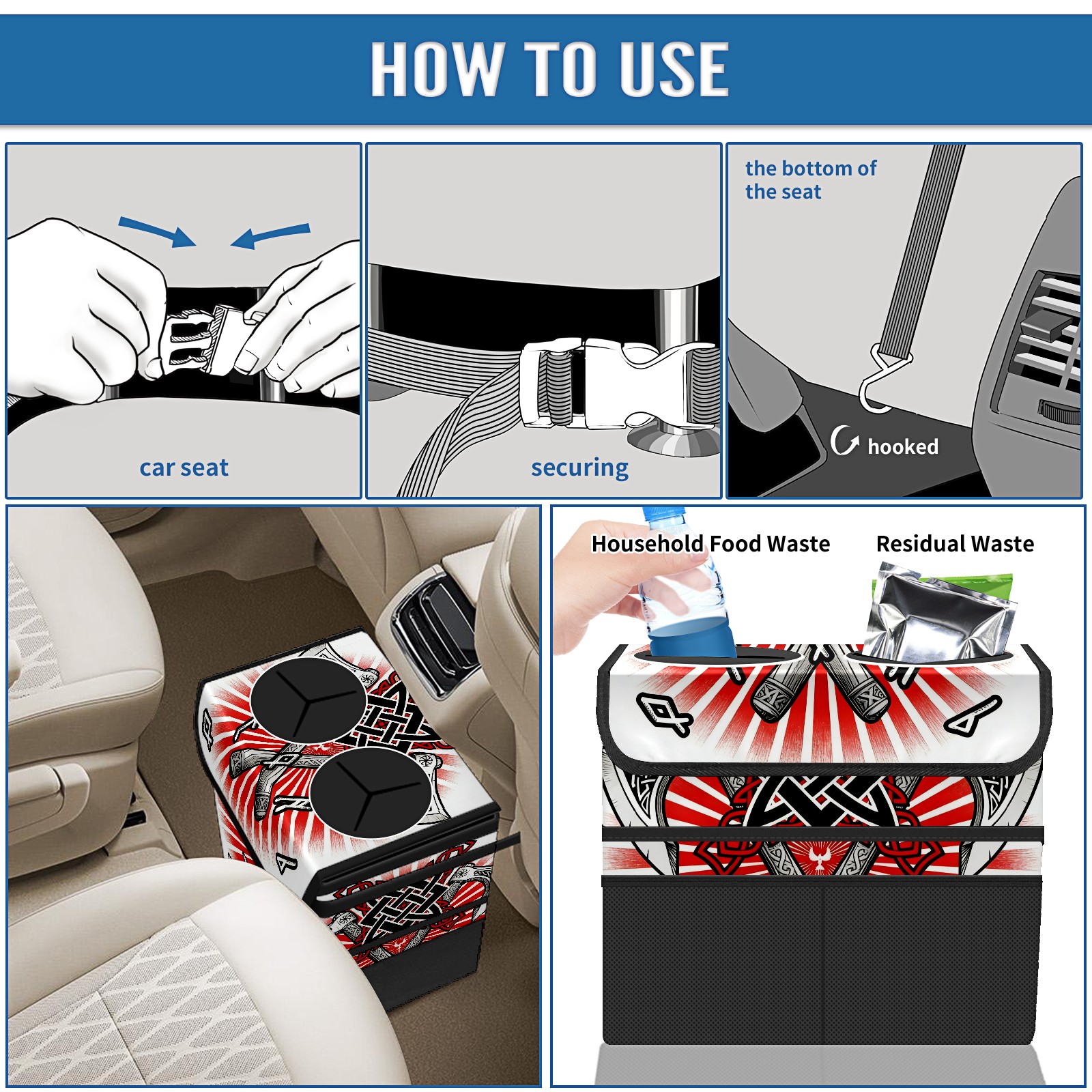 Car Trash Can with Lid, Portable Hanging Automotive Garbage Bin for Vehicles, Leakproof Waste Bag Container for SUV Truck Van Interior Auto Travel Road Trips(Cool Axes Red)