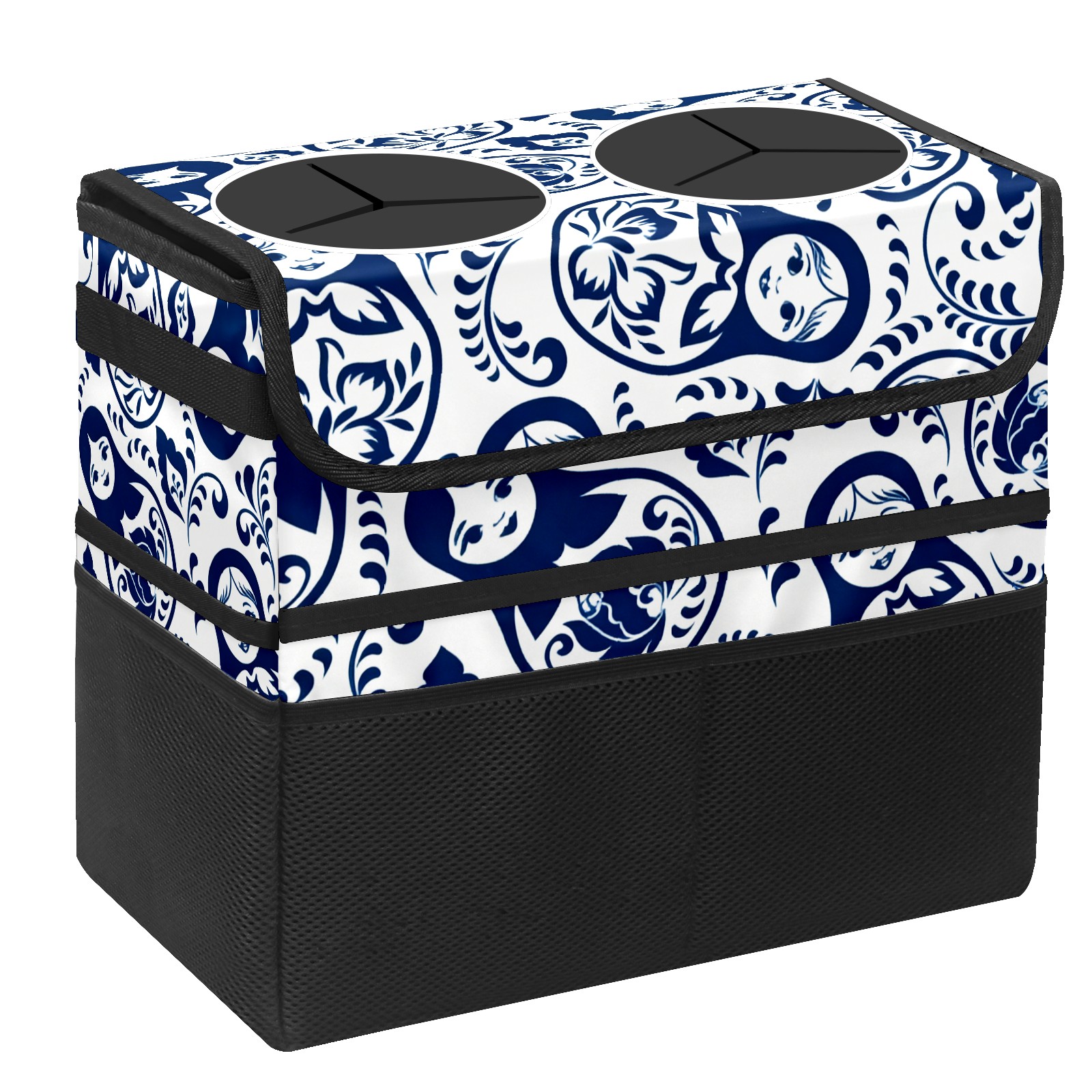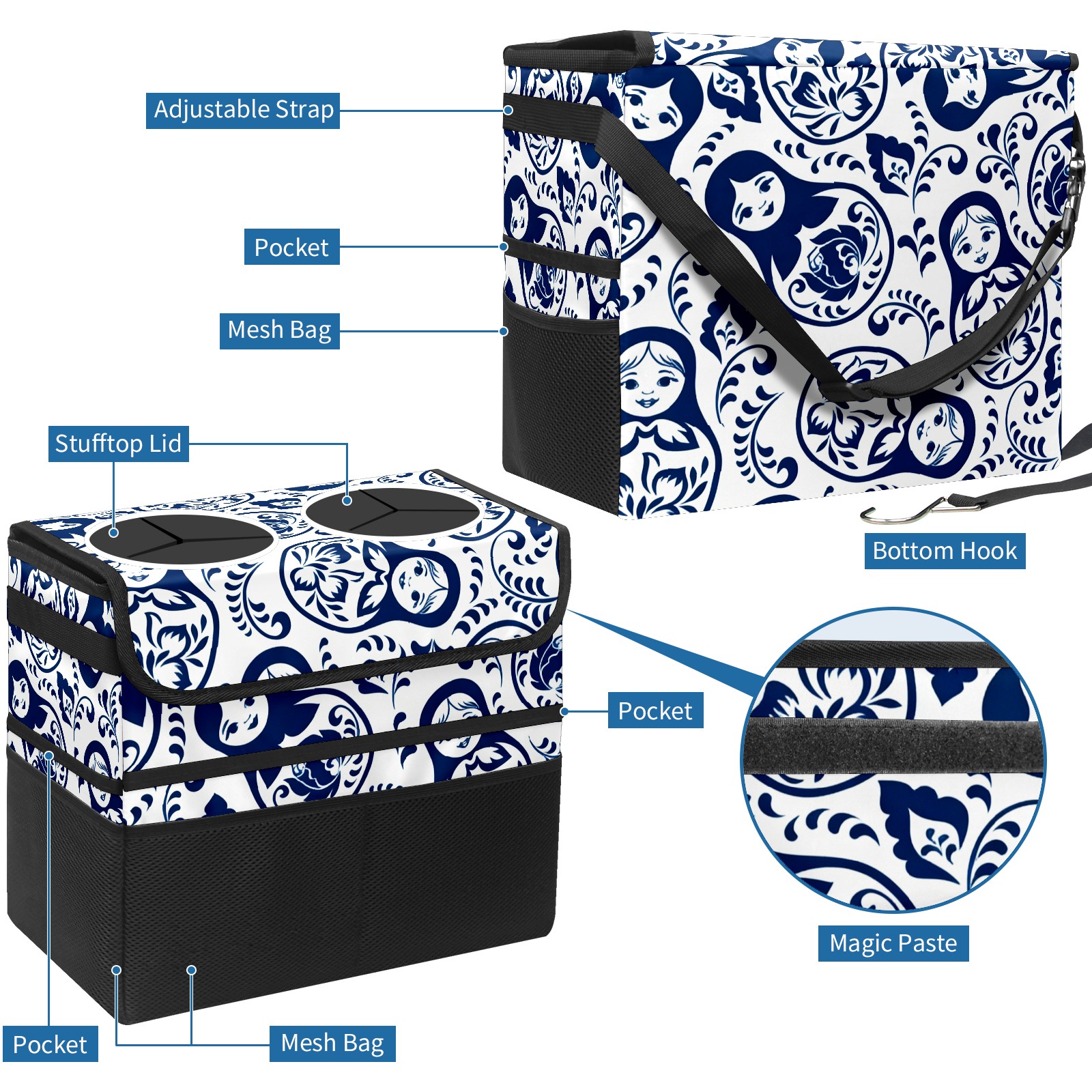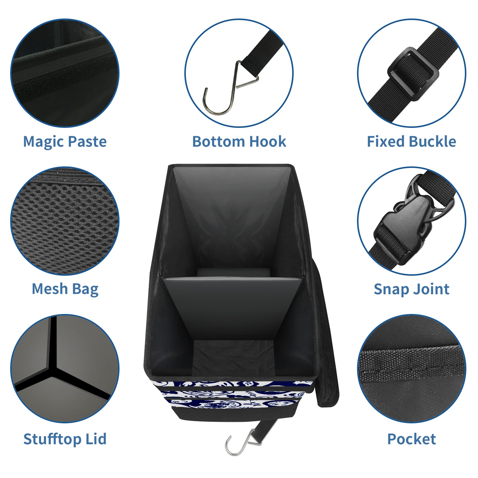 Car Trash Can with Lid, Portable Hanging Automotive Garbage Bin for Vehicles, Leakproof Waste Bag Container for SUV Truck Van Interior Auto Travel Road Trips(Elegant Patterns Blue)