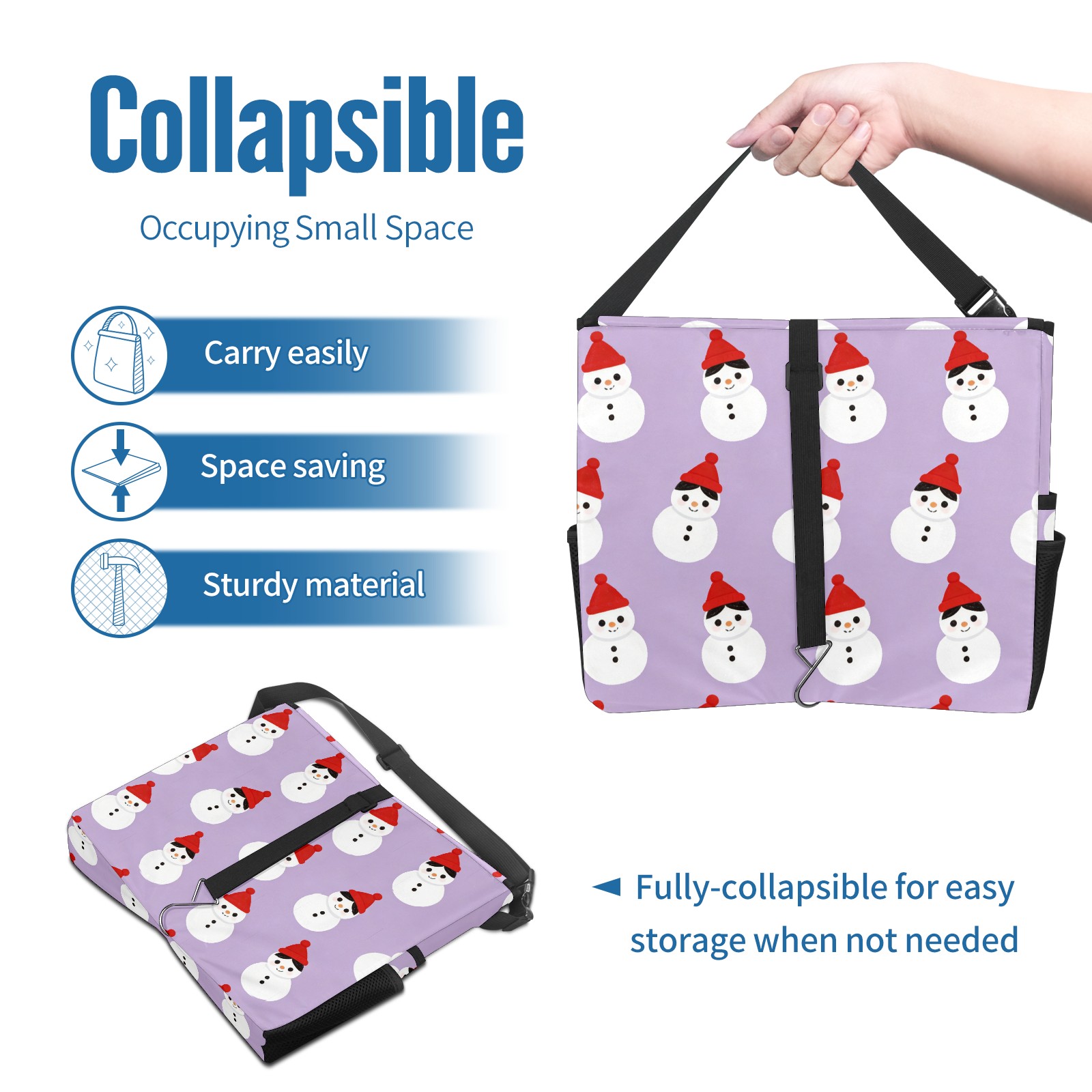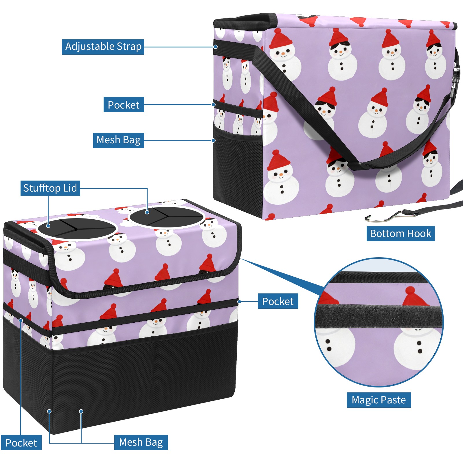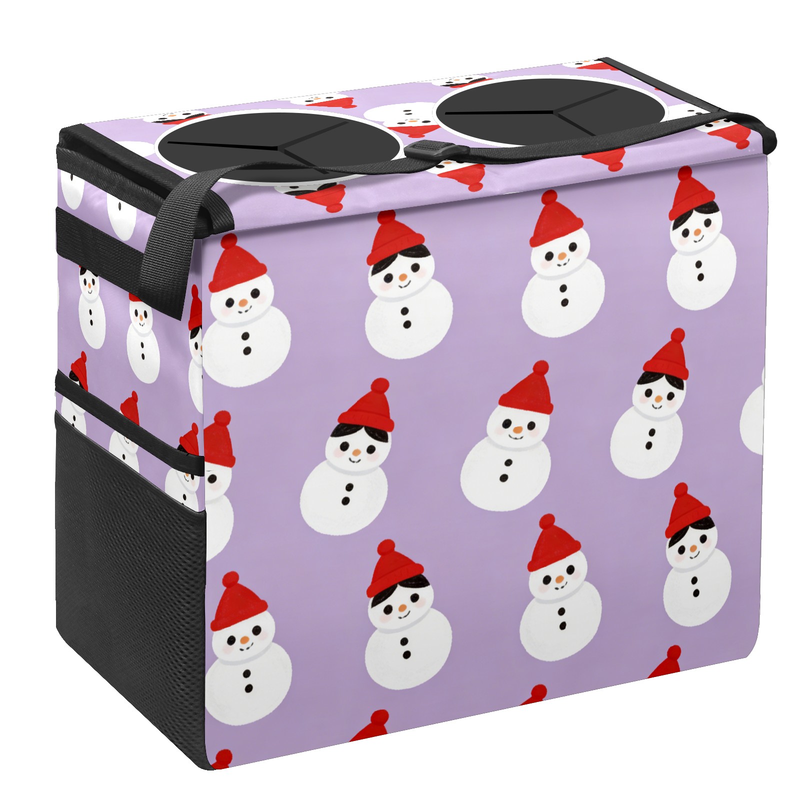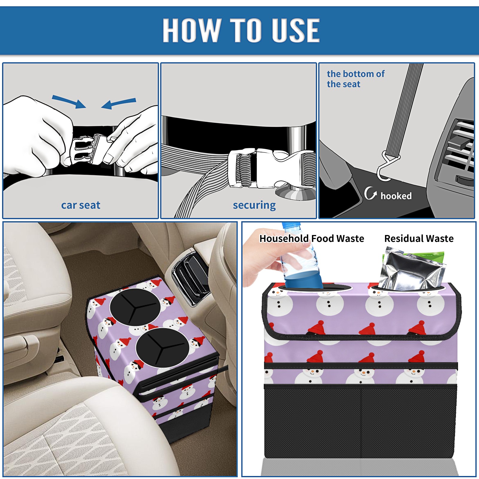Car Trash Can with Lid, Portable Hanging Automotive Garbage Bin for Vehicles, Leakproof Waste Bag Container for SUV Truck Van Interior Auto Travel Road Trips(Cozy Snowmen Purple)
