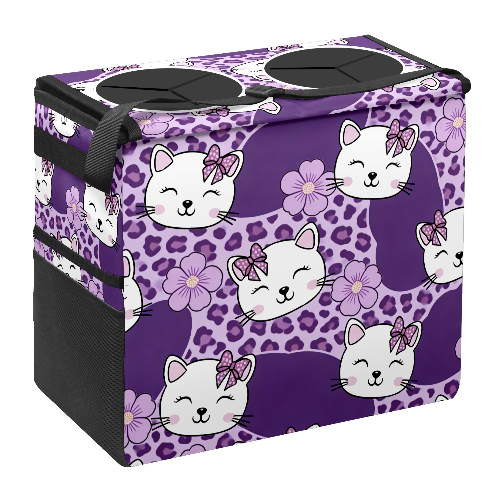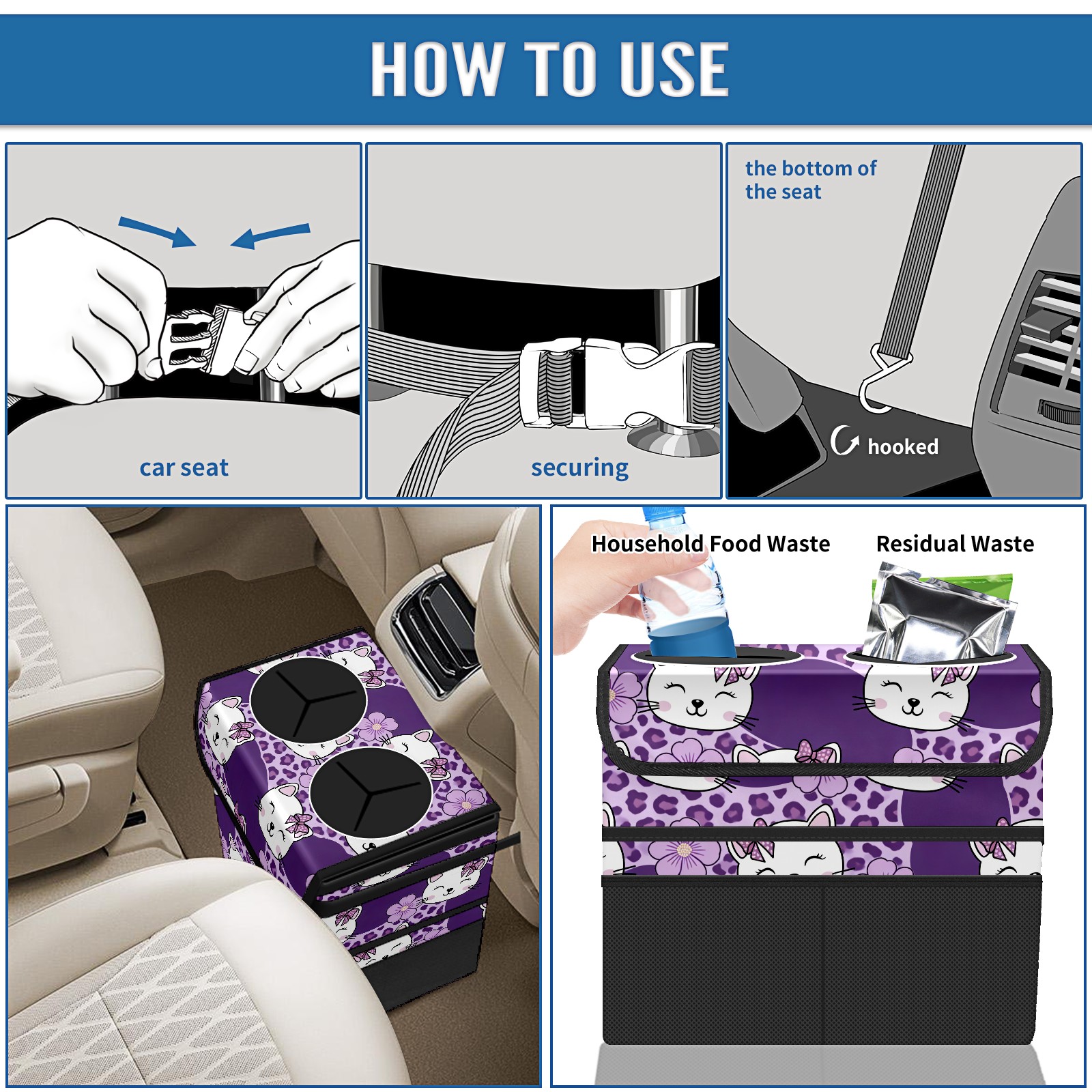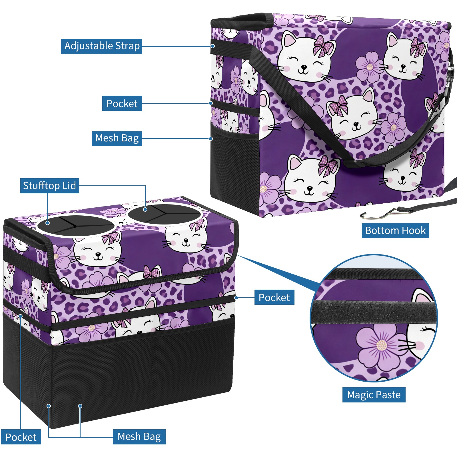 Car Trash Can with Lid, Portable Hanging Automotive Garbage Bin for Vehicles, Leakproof Waste Bag Container for SUV Truck Van Interior Auto Travel Road Trips(Cat Purple)