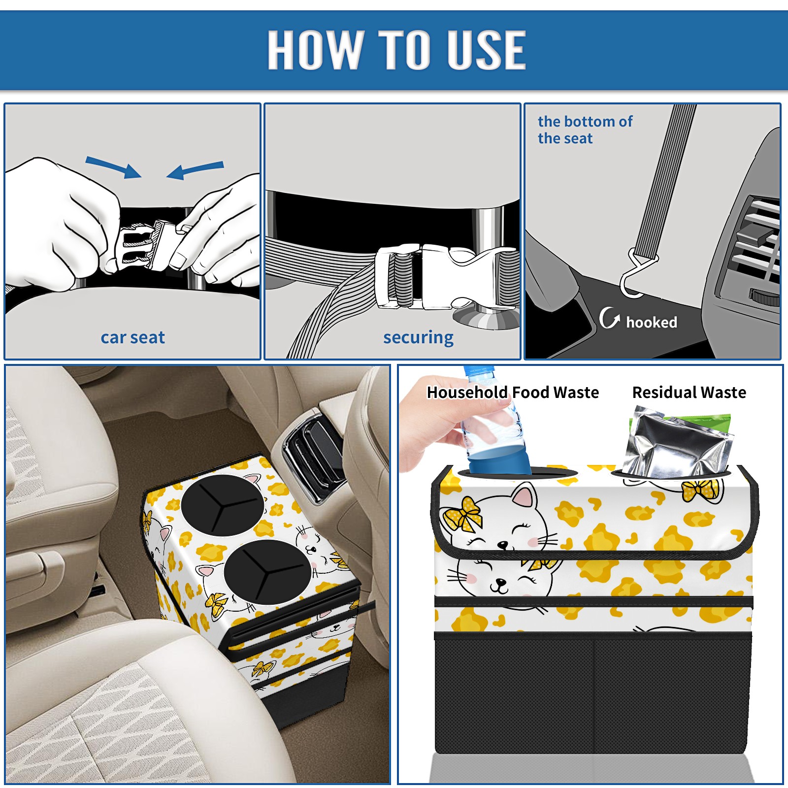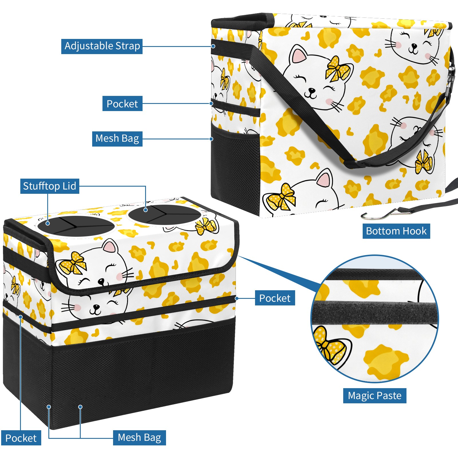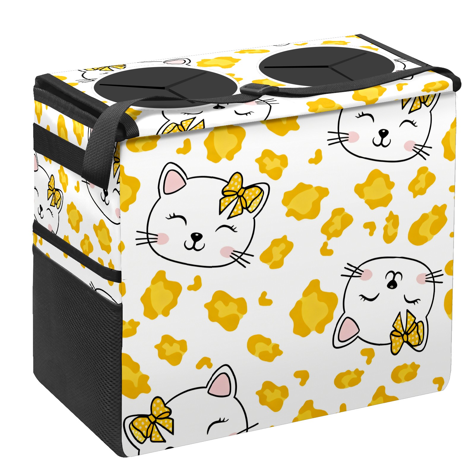 Car Trash Can with Lid, Portable Hanging Automotive Garbage Bin for Vehicles, Leakproof Waste Bag Container for SUV Truck Van Interior Auto Travel Road Trips(Hello Cat Yellow)