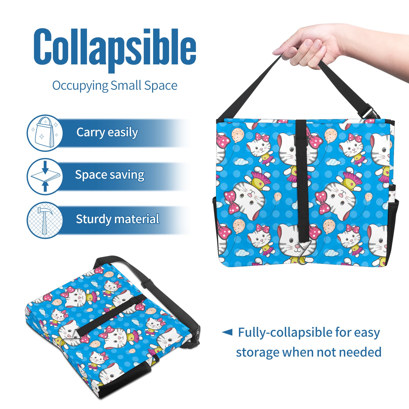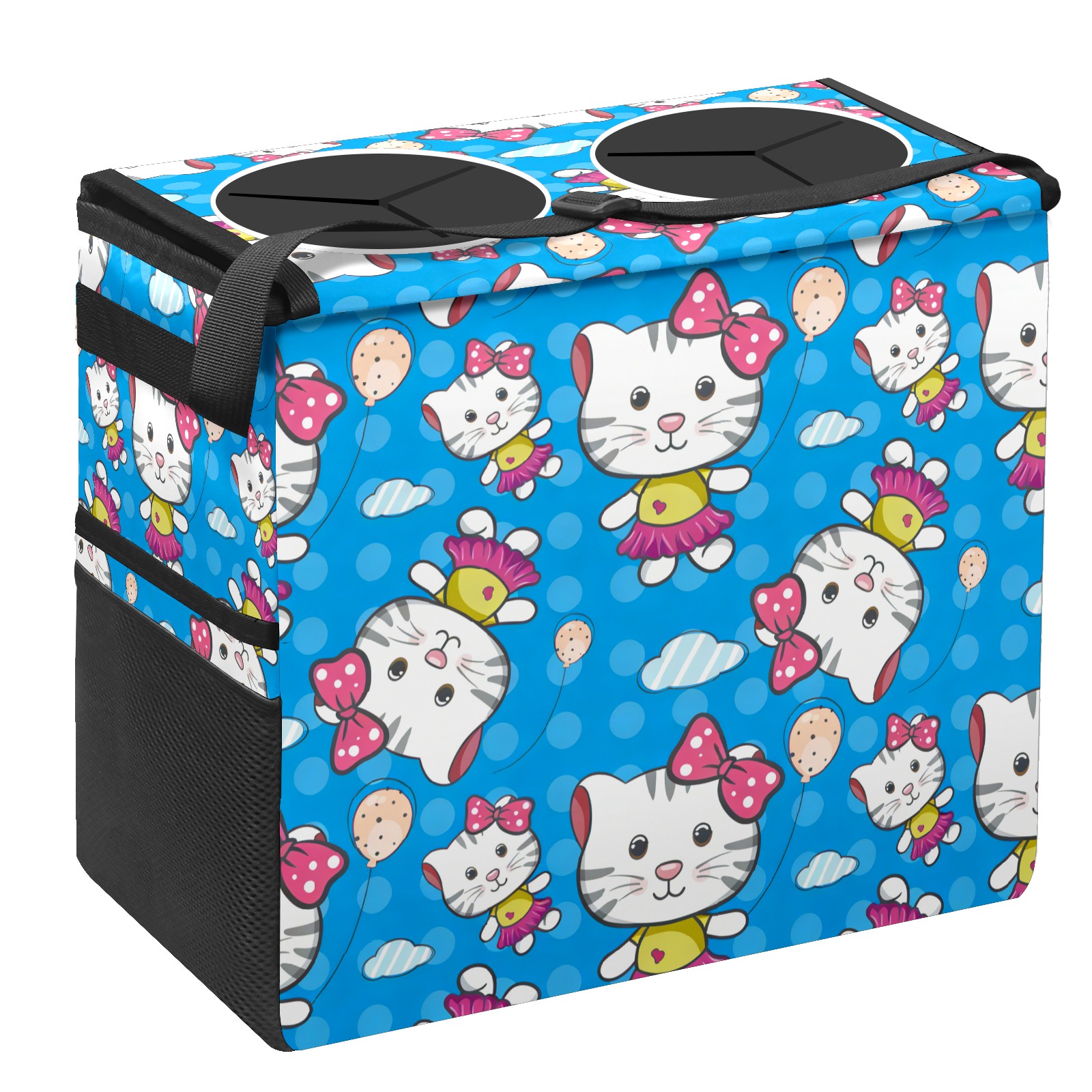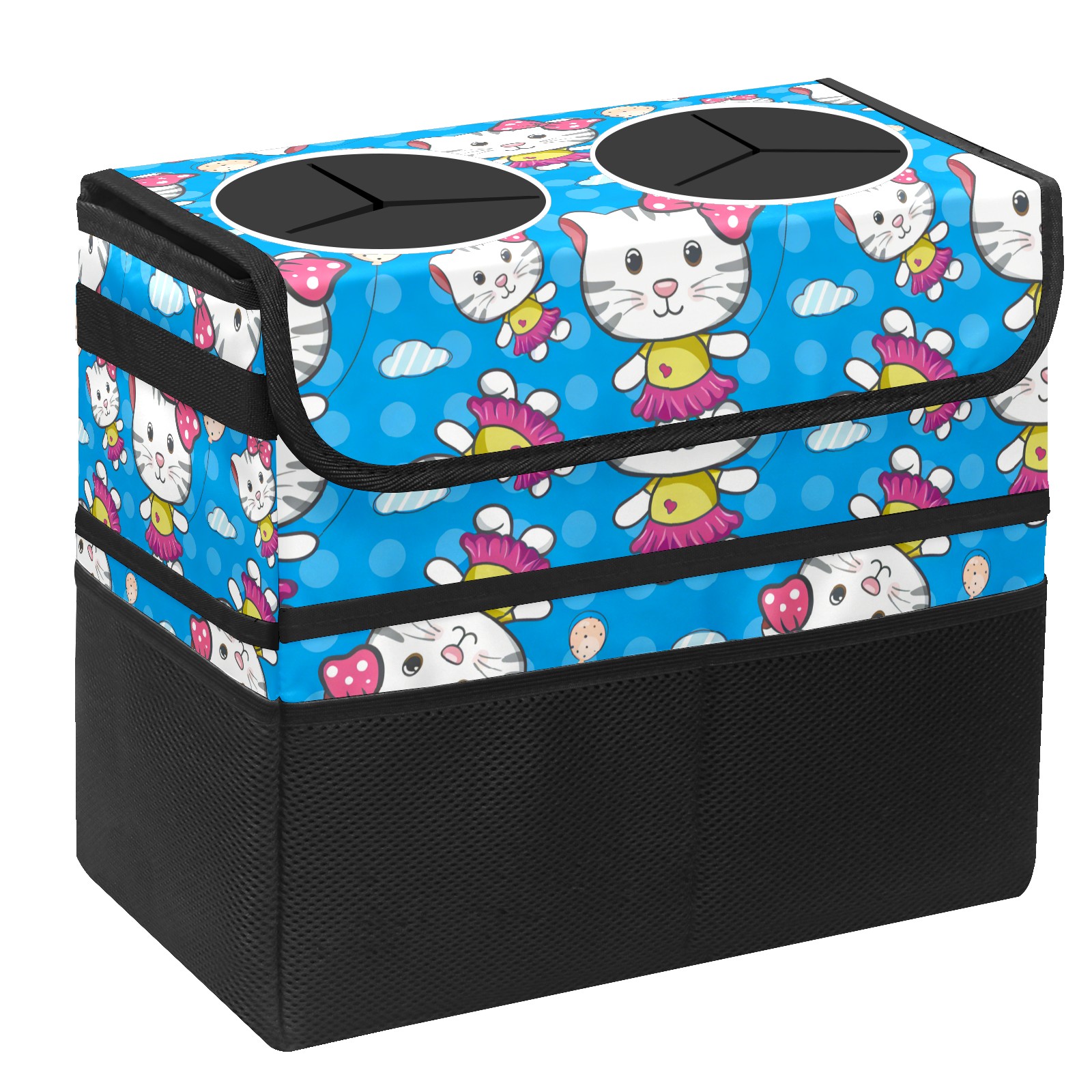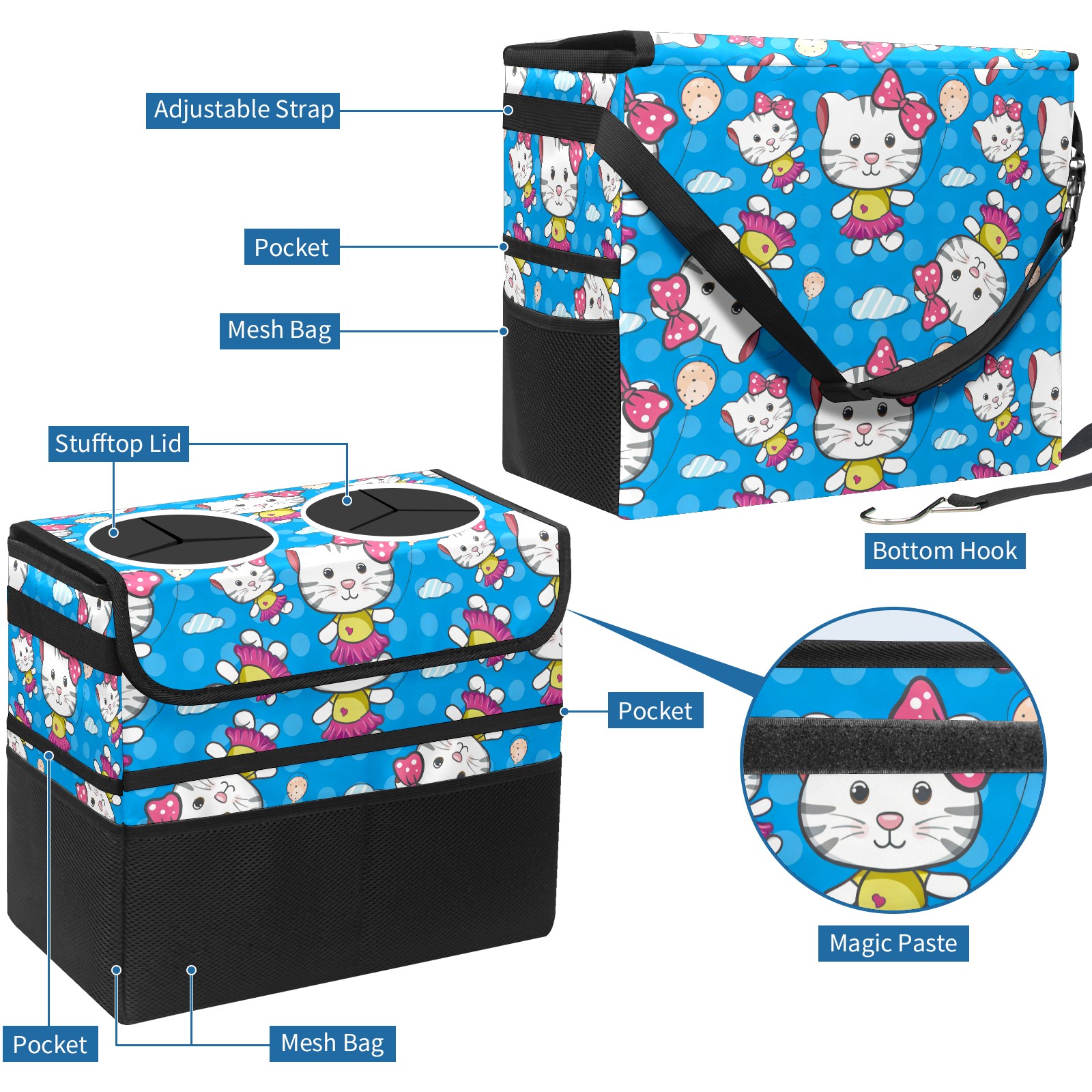 Car Trash Can with Lid, Portable Hanging Automotive Garbage Bin for Vehicles, Leakproof Waste Bag Container for SUV Truck Van Interior Auto Travel Road Trips(Hello Cat Blue)