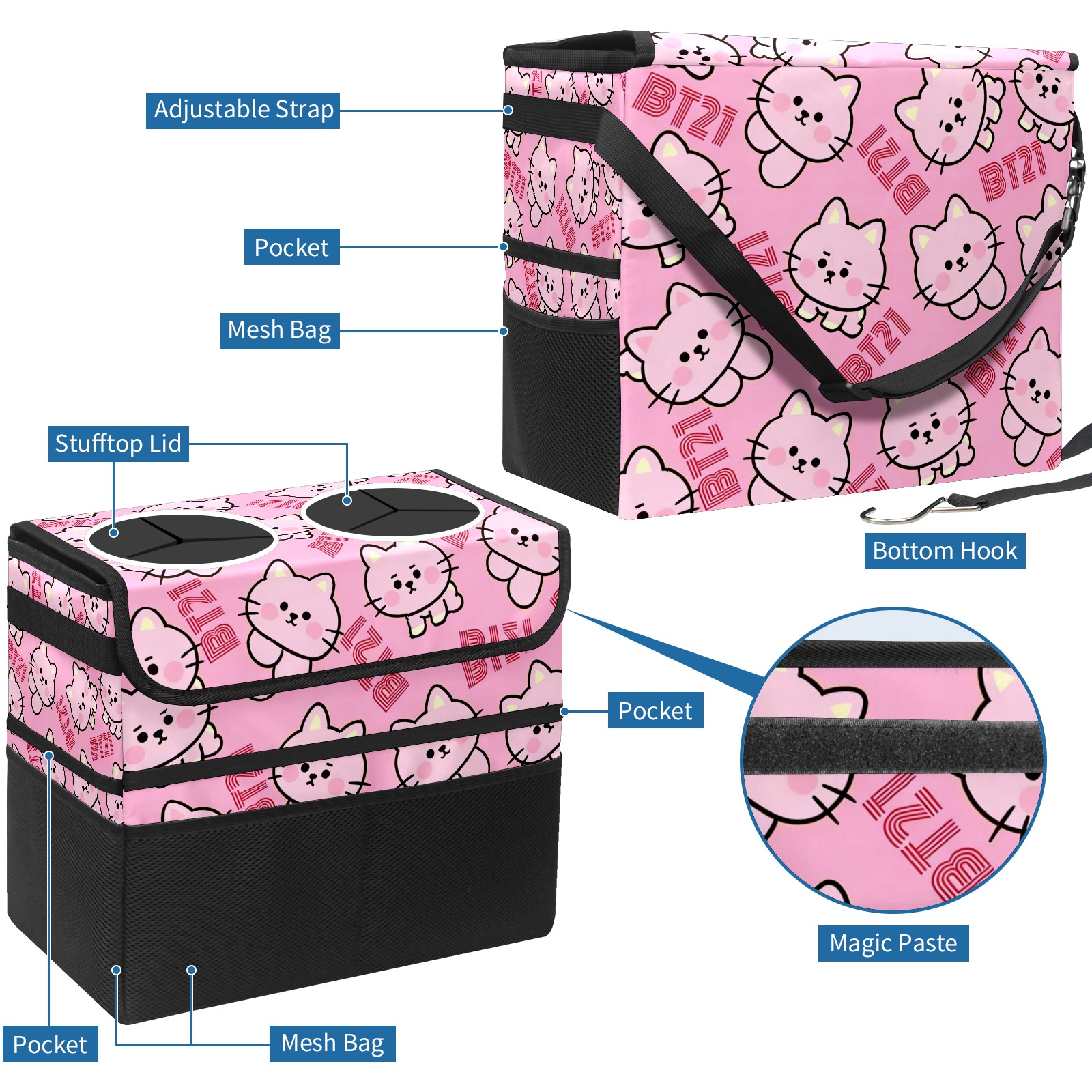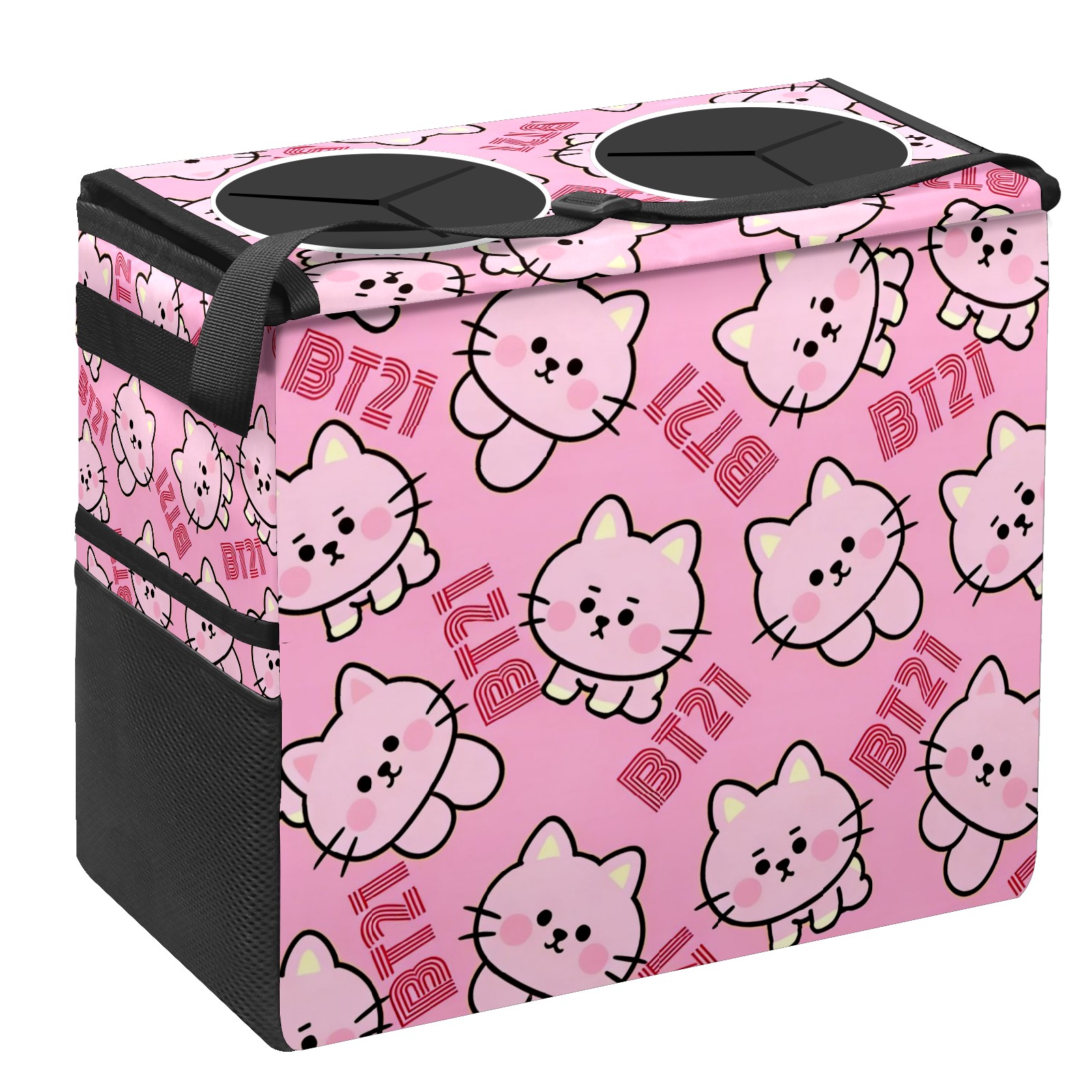 Car Trash Can with Lid, Portable Hanging Automotive Garbage Bin for Vehicles, Leakproof Waste Bag Container for SUV Truck Van Interior Auto Travel Road Trips(Blush Kitties)