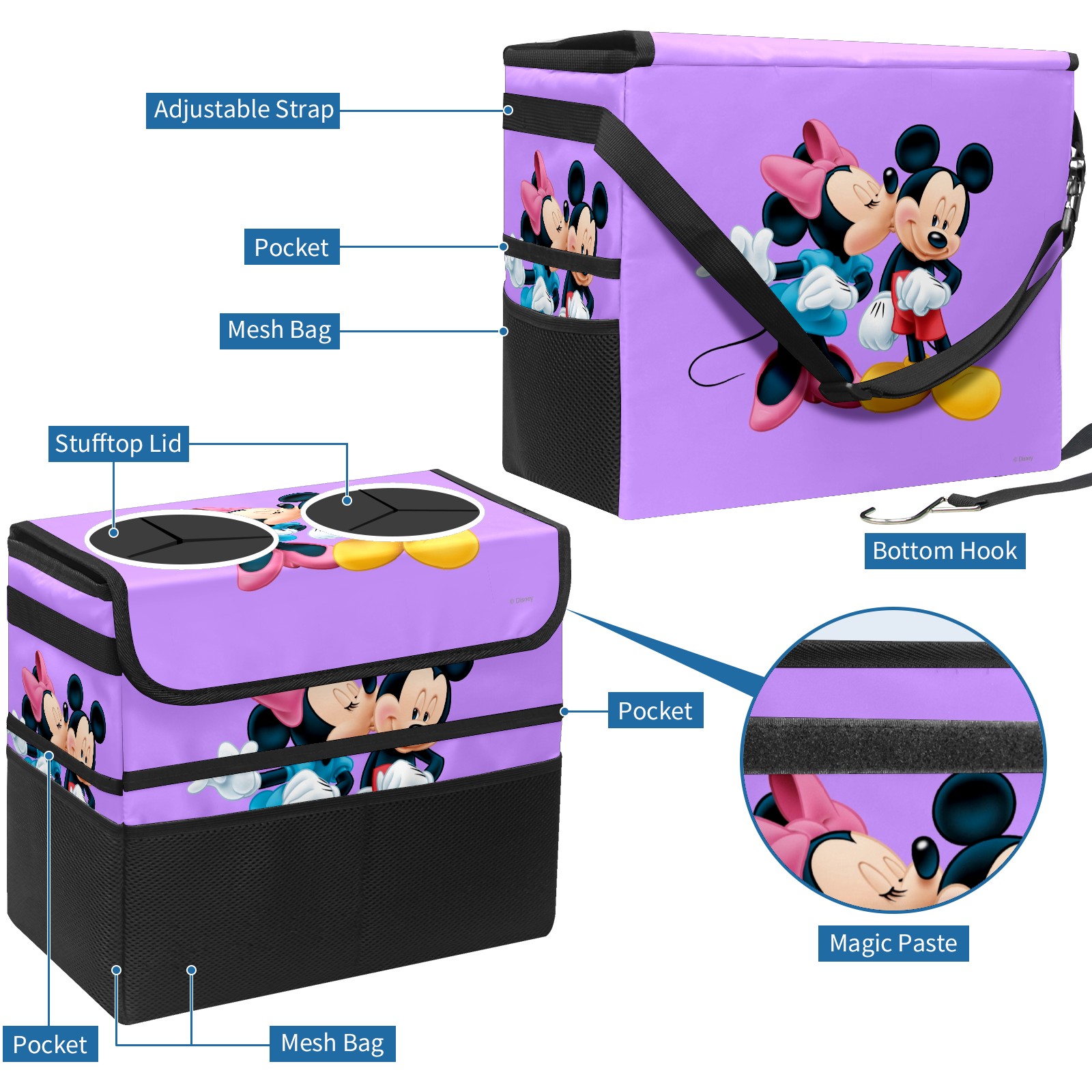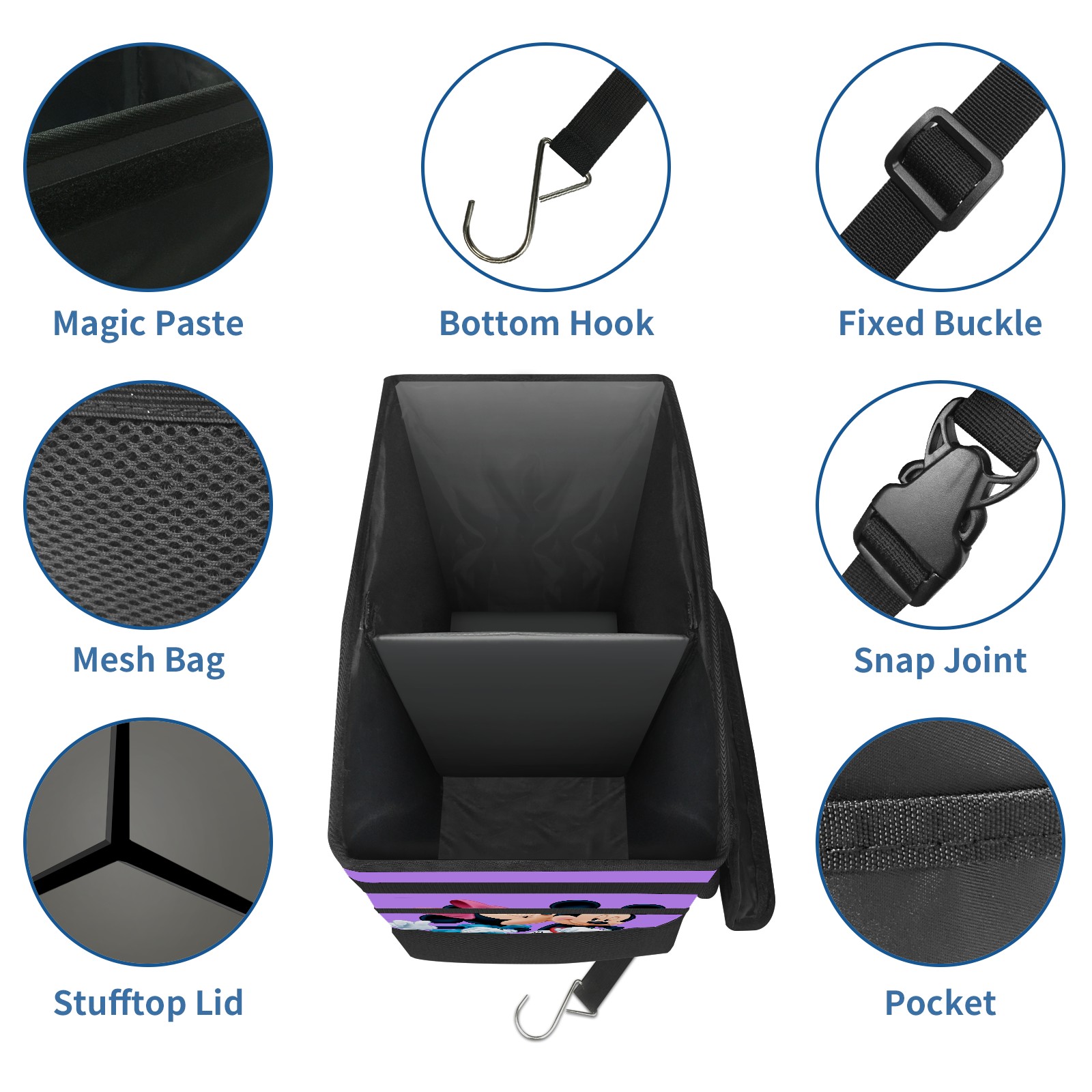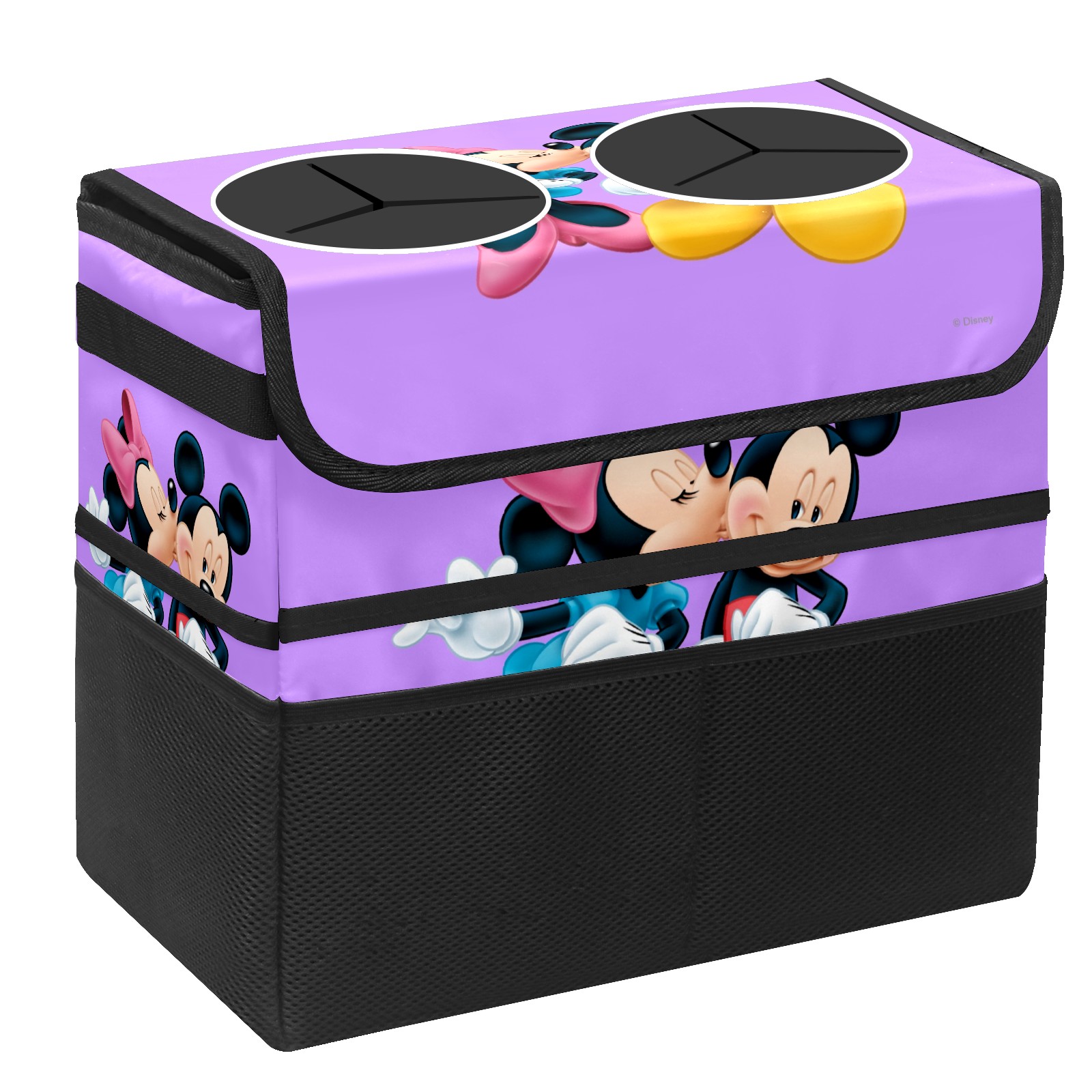 Car Trash Can with Lid, Portable Hanging Automotive Garbage Bin for Vehicles, Leakproof Waste Bag Container for SUV Truck Van Interior Auto Travel Road Trips(Minnie Kissing Mickey Mouse Purple)