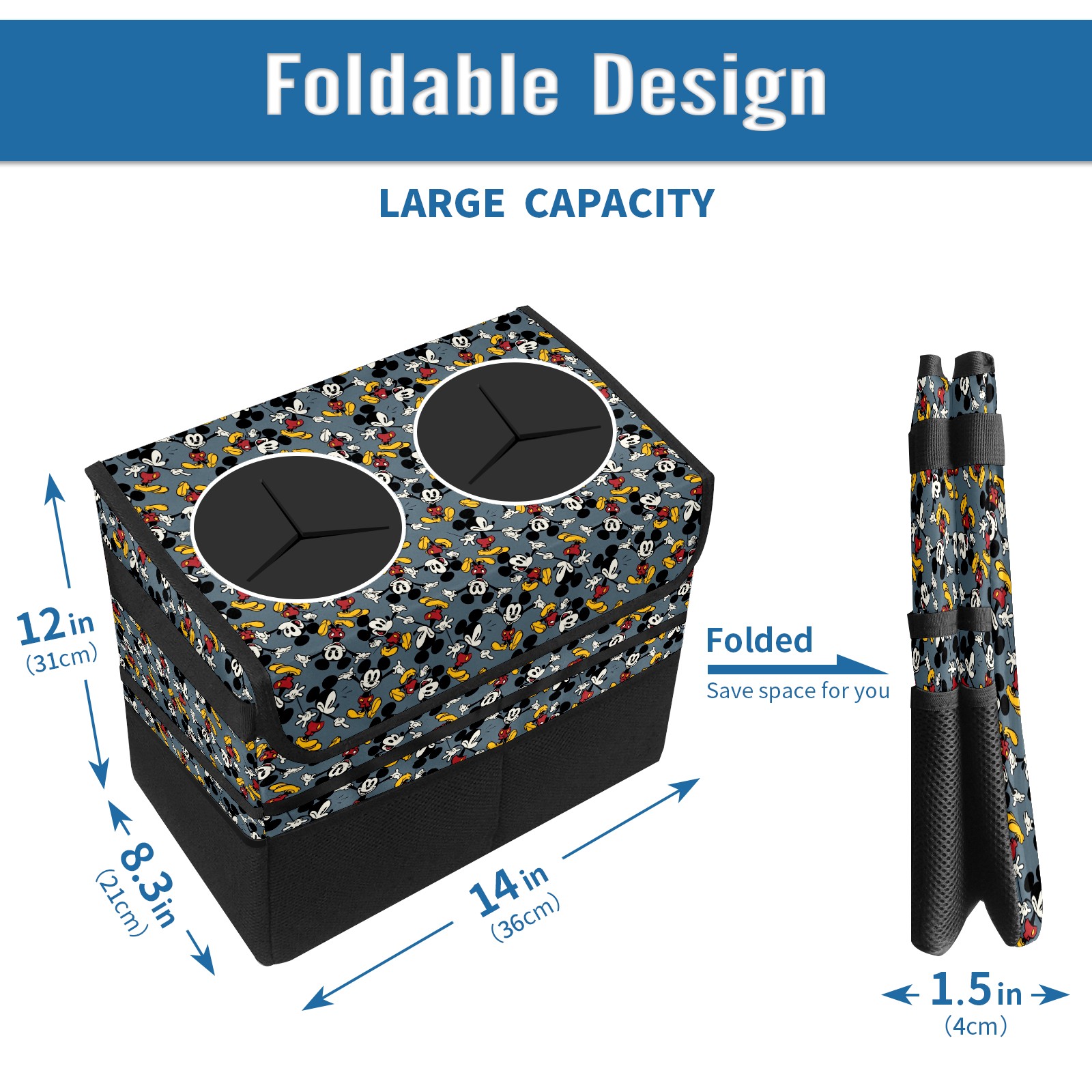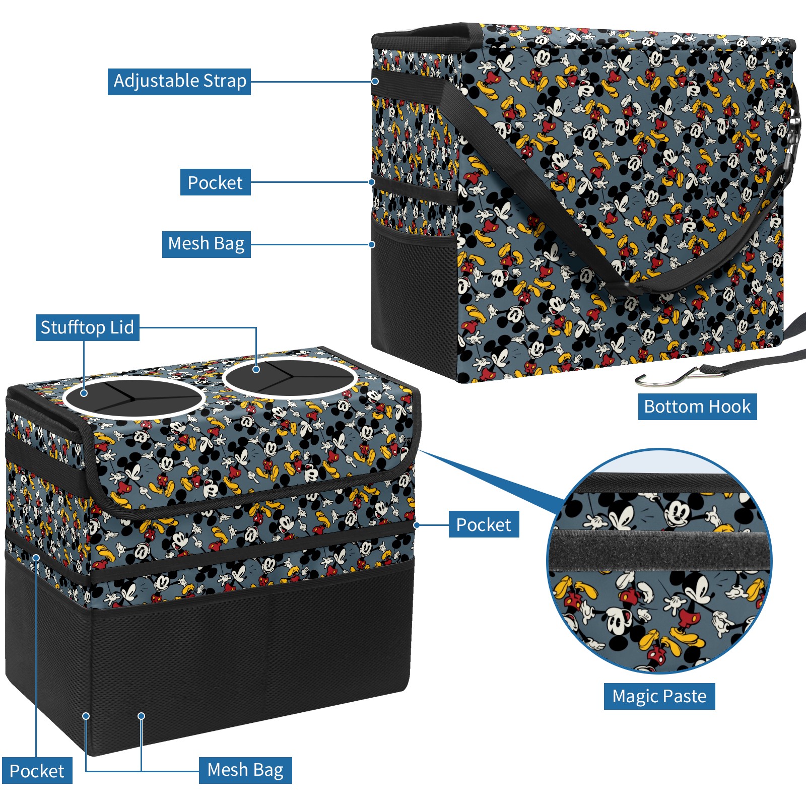 Car Trash Can with Lid, Portable Hanging Automotive Garbage Bin for Vehicles, Leakproof Waste Bag Container for SUV Truck Van Interior Auto Travel Road Trips(Cute Funny Mickey Mouse Pattern)