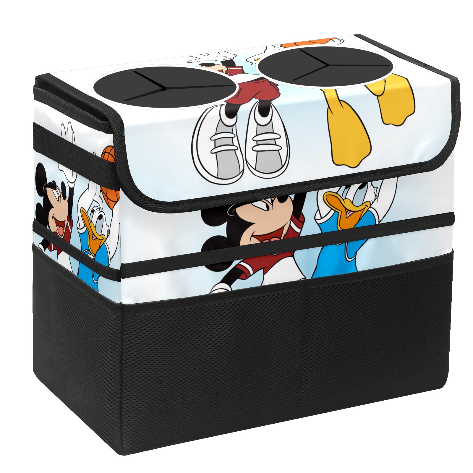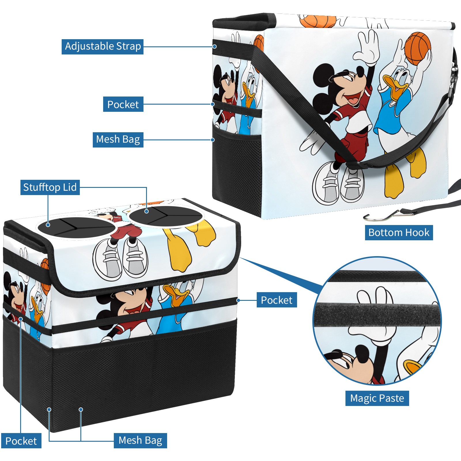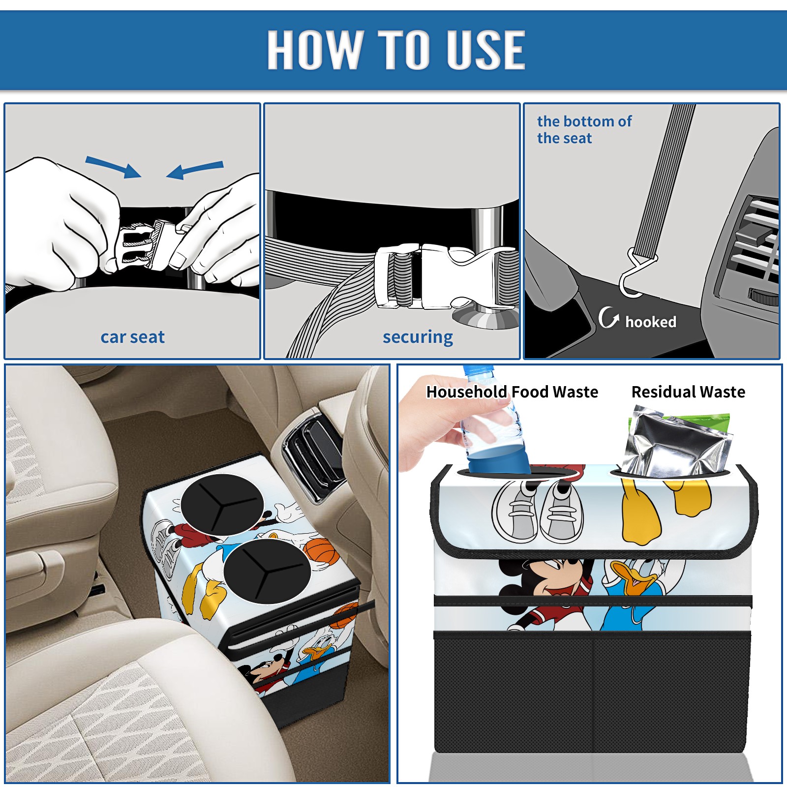 Car Trash Can with Lid, Portable Hanging Automotive Garbage Bin for Vehicles, Leakproof Waste Bag Container for SUV Truck Van Interior Auto Travel Road Trips(Mickey Mouse And Donald Duck)