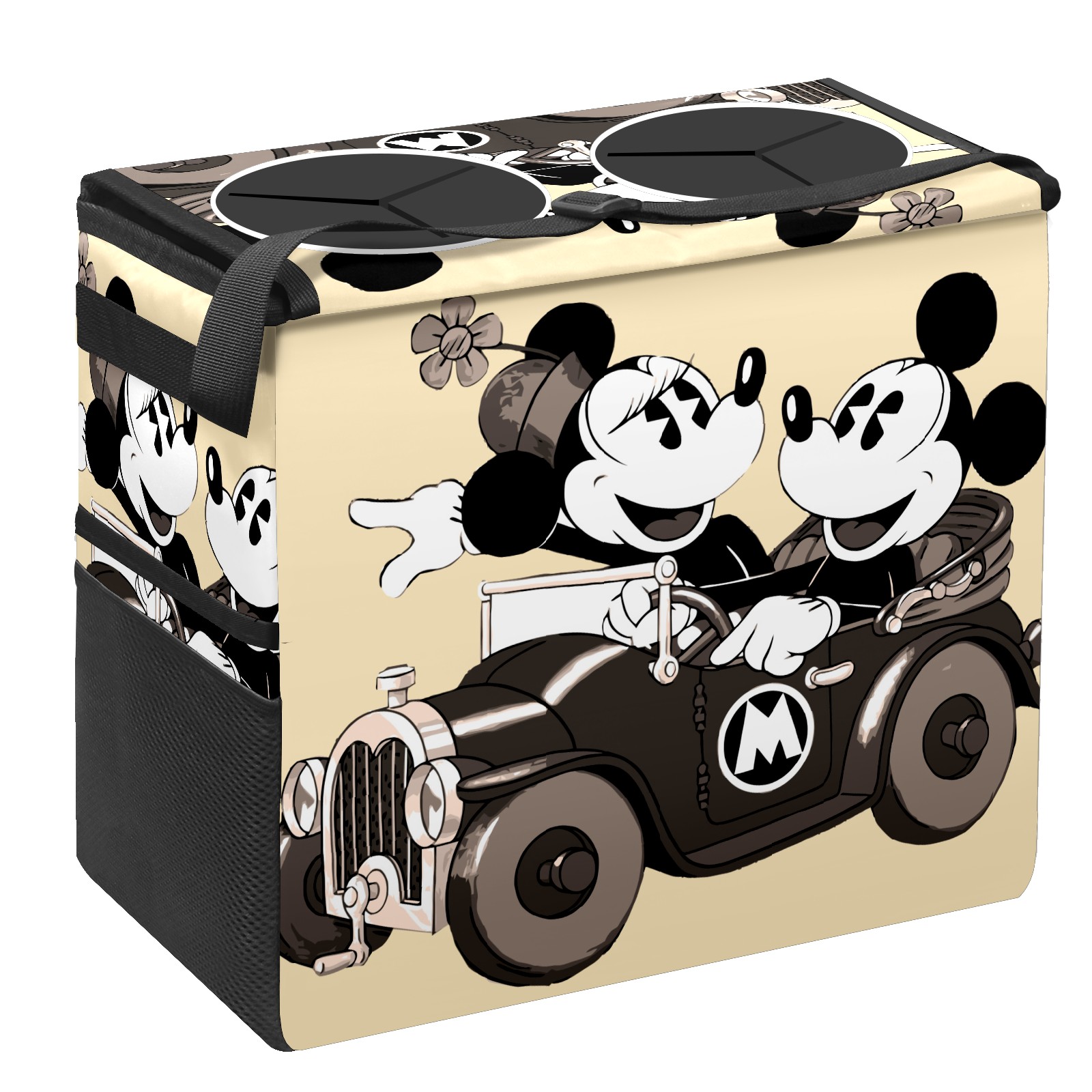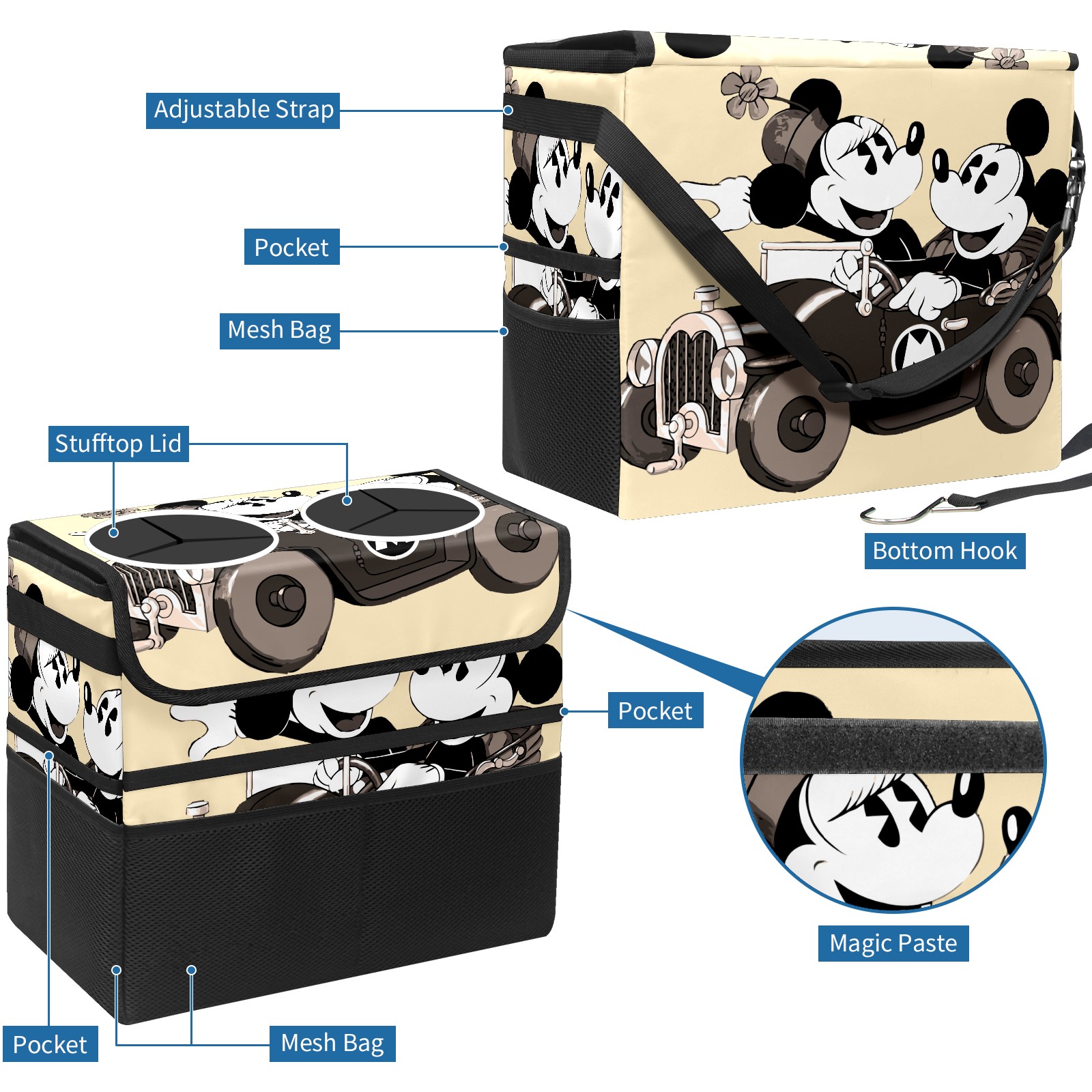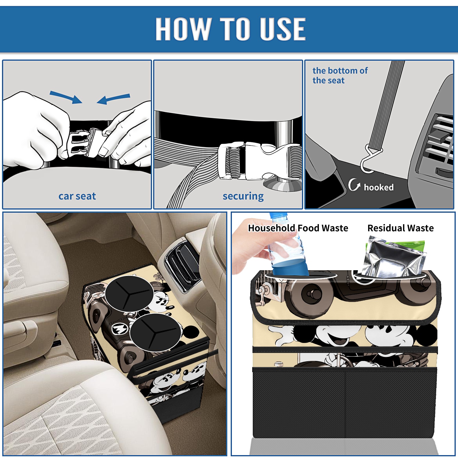 Car Trash Can with Lid, Portable Hanging Automotive Garbage Bin for Vehicles, Leakproof Waste Bag Container for SUV Truck Van Interior Auto Travel Road Trips(Retro-Cartoon Mickey Mouse)