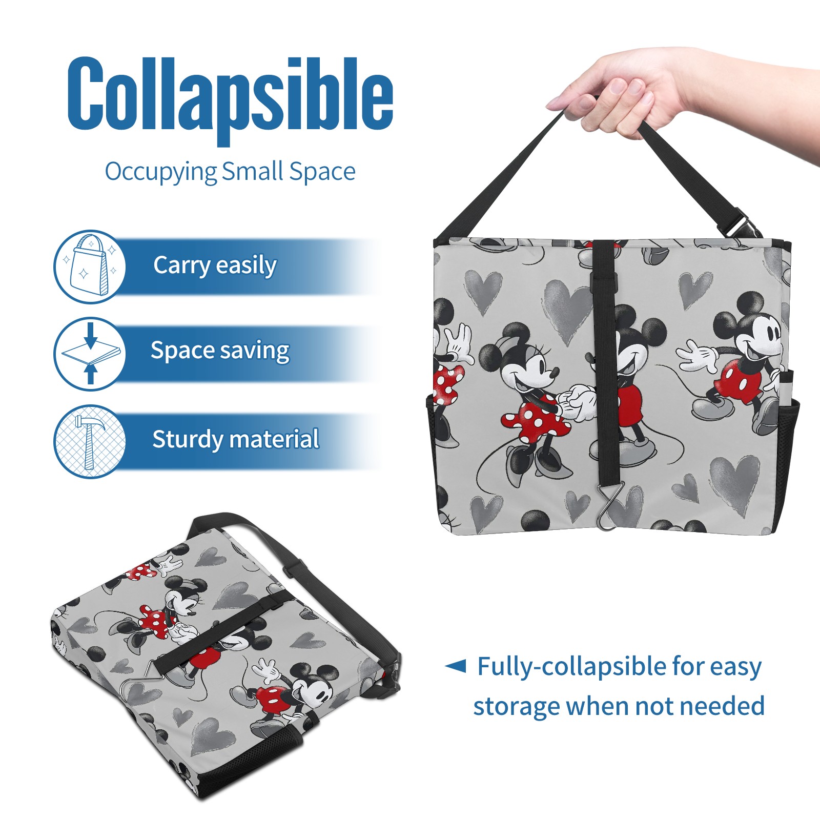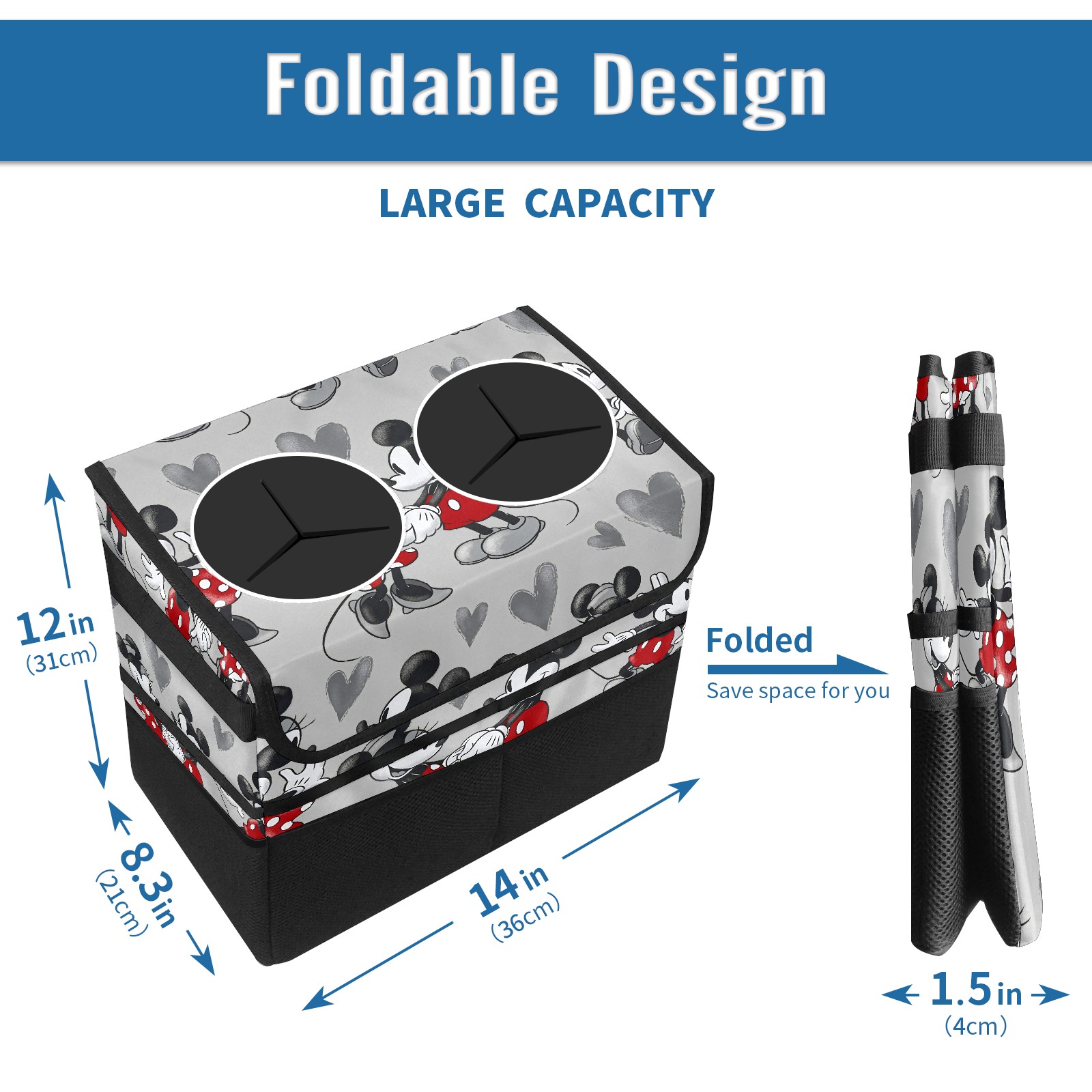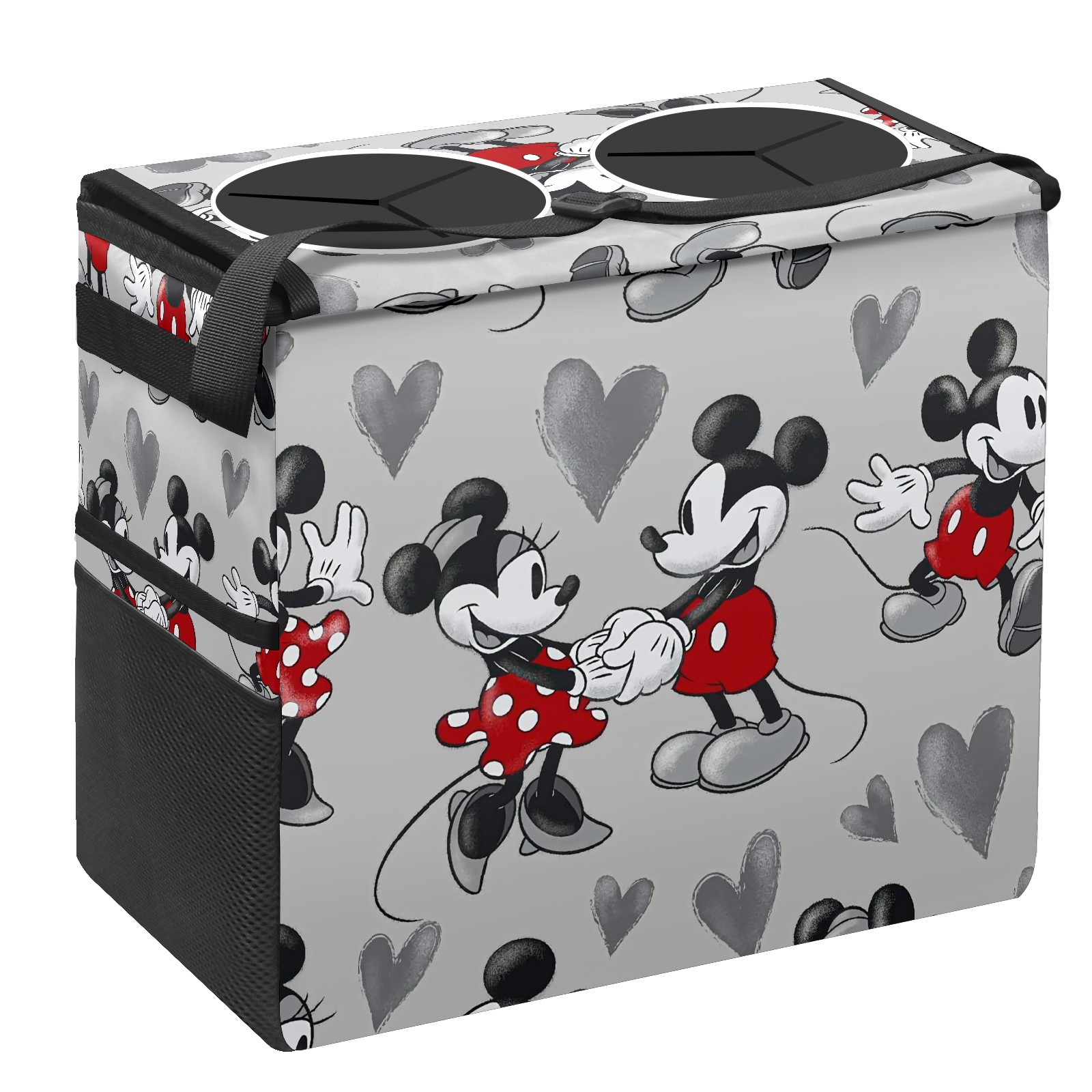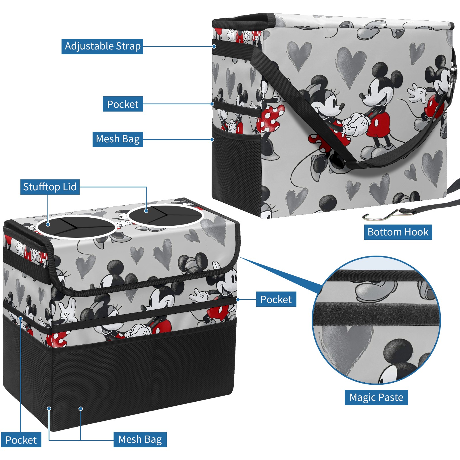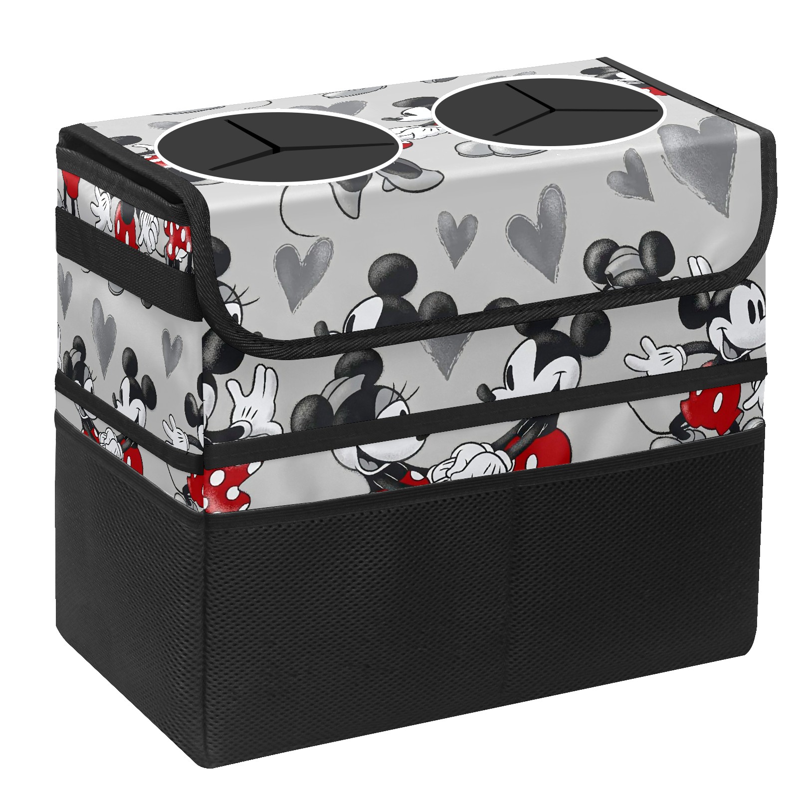 Car Trash Can with Lid, Portable Hanging Automotive Garbage Bin for Vehicles, Leakproof Waste Bag Container for SUV Truck Van Interior Auto Travel Road Trips(Mickey Mouse Grey Love Heart)