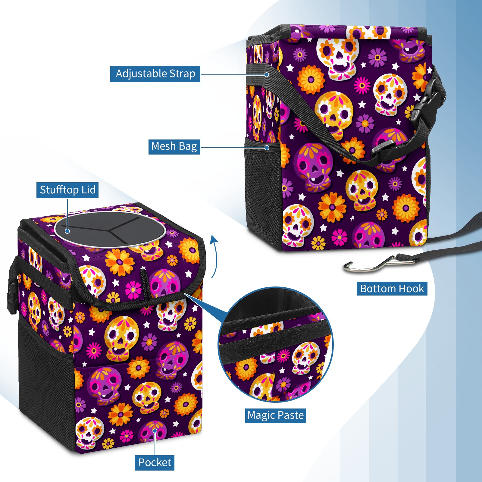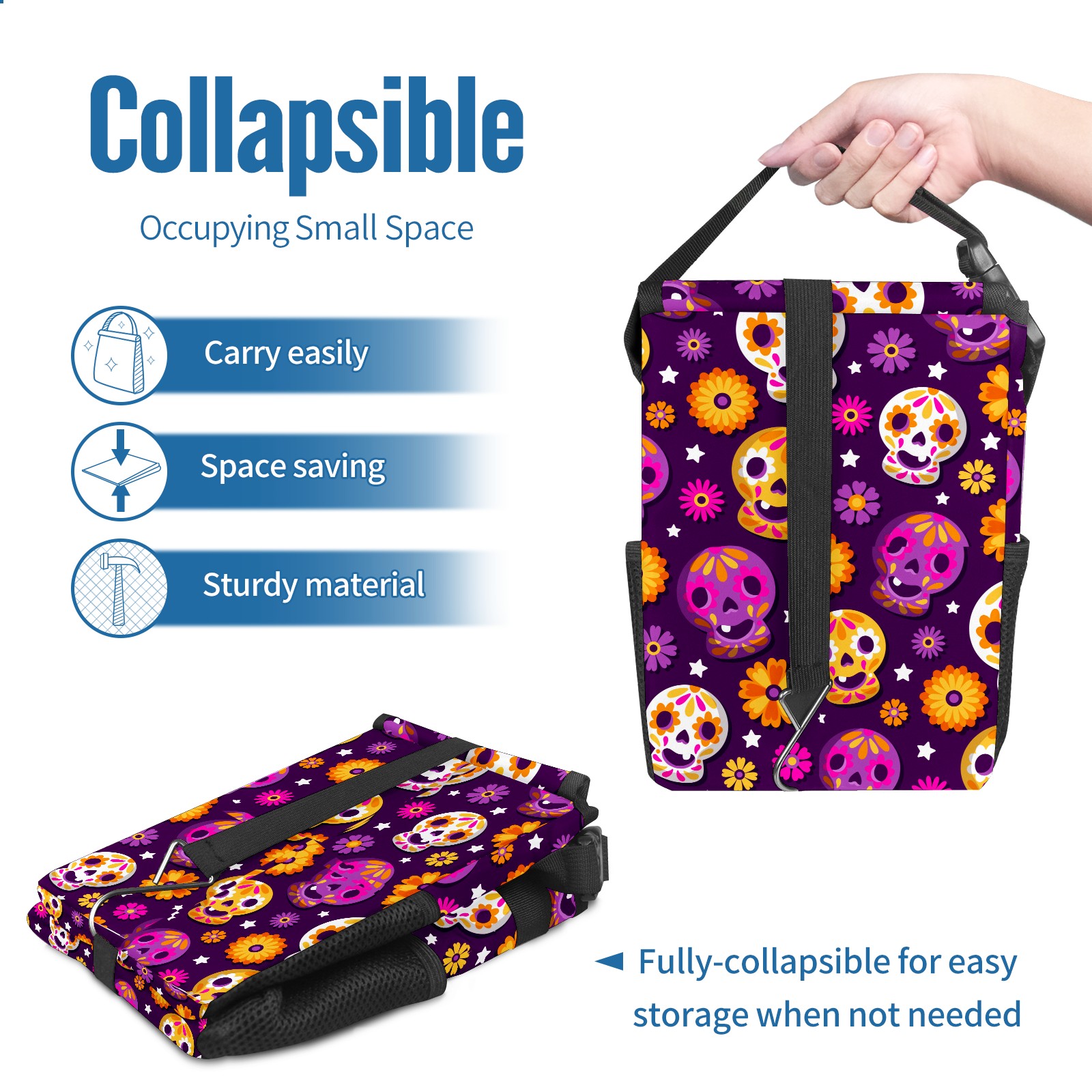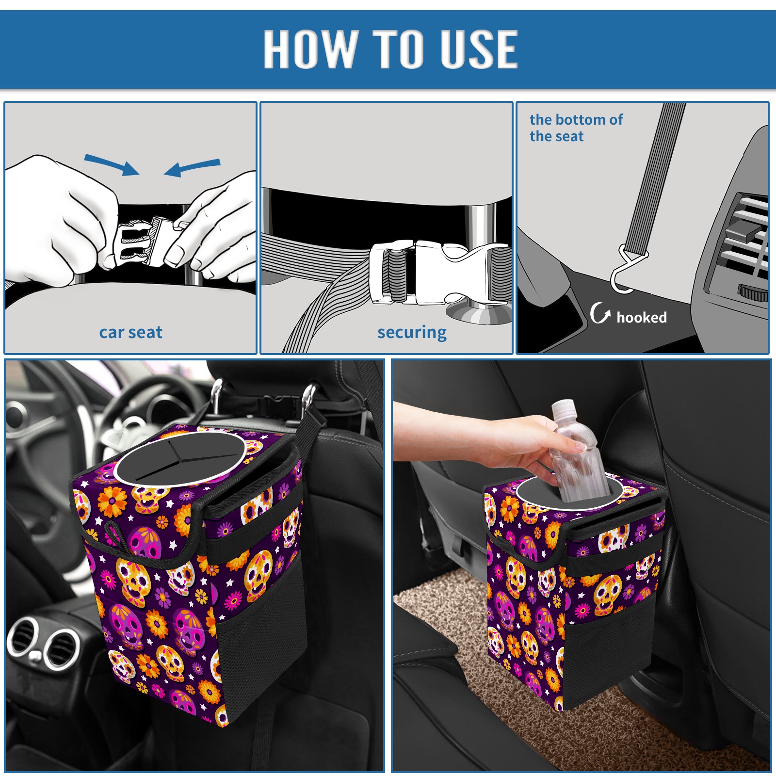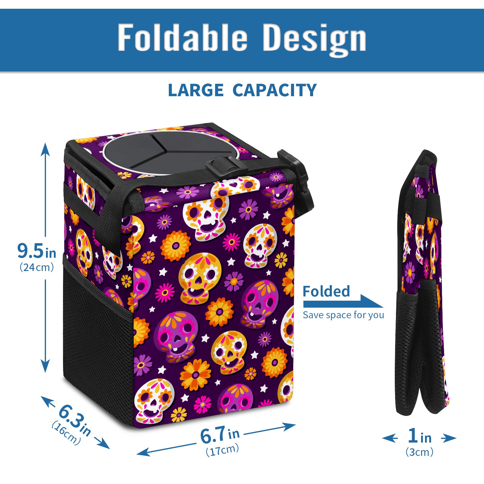 Car Garbage Can — Multi-functional, Lightweight Portable, Reusable Vehicle Trash Can, Waterproof with Sufficient Storage Capacity Flower Skull