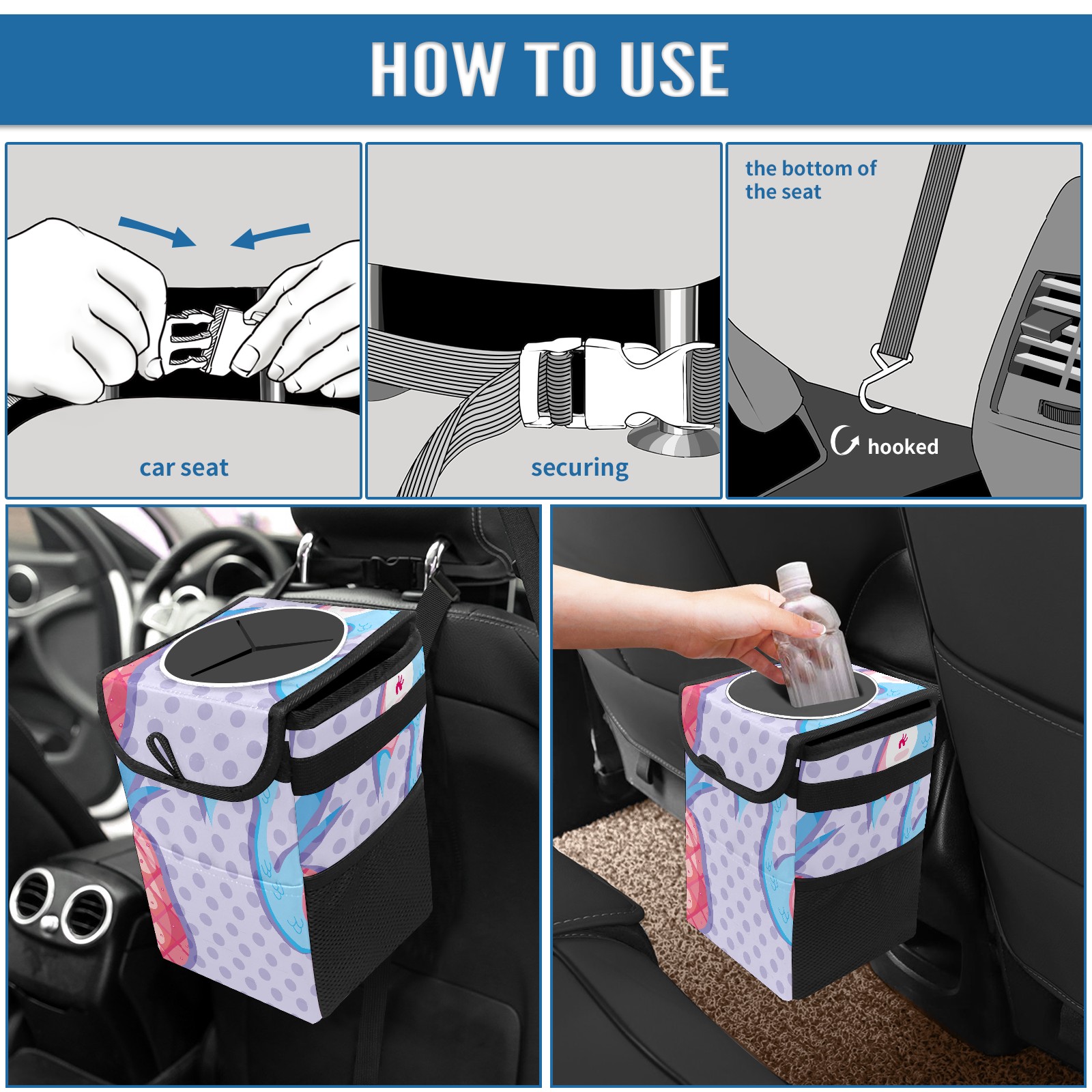 • <p>Keep your car neat with this practical car trash can—built for durability, versatility, and on-the-go convenience! Crafted from quality twill fabric with a waterproof lining, it prevents leaks, keeping seats/floors clean. Clean easily: empty directly or secure a disposable bag with side clips. Adjustable pull cord fits floor, seat, or headrest. 9.5x6.3x6.7 inches, ample space for daily trash, folds flat for storage. More than a trash can, it doubles as a storage bag for cups, toys, docs, and small gadgets—must-have car interior accessory. Installs in seconds on seats, console, or gear shift; adjustable straps keep it stable, no slipping on bumpy roads. Perfect gift for new car owners!</p>