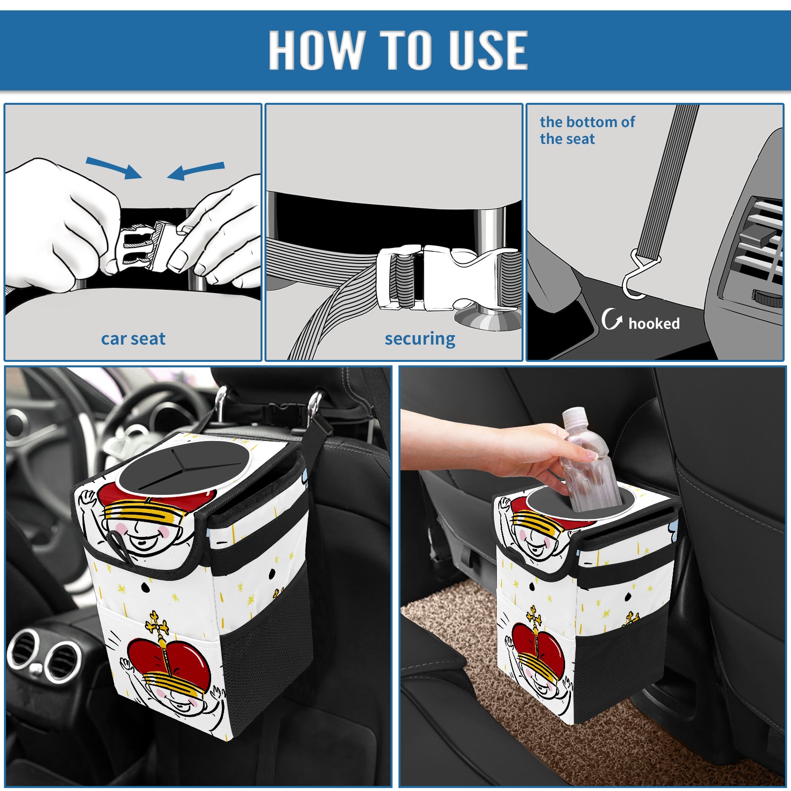 • <p>Keep your car neat with this practical car trash can—built for durability, versatility, and on-the-go convenience! Crafted from quality twill fabric with a waterproof lining, it prevents leaks, keeping seats/floors clean. Clean easily: empty directly or secure a disposable bag with side clips. Adjustable pull cord fits floor, seat, or headrest. 9.5x6.3x6.7 inches, ample space for daily trash, folds flat for storage. More than a trash can, it doubles as a storage bag for cups, toys, docs, and small gadgets—must-have car interior accessory. Installs in seconds on seats, console, or gear shift; adjustable straps keep it stable, no slipping on bumpy roads. Perfect gift for new car owners!</p>