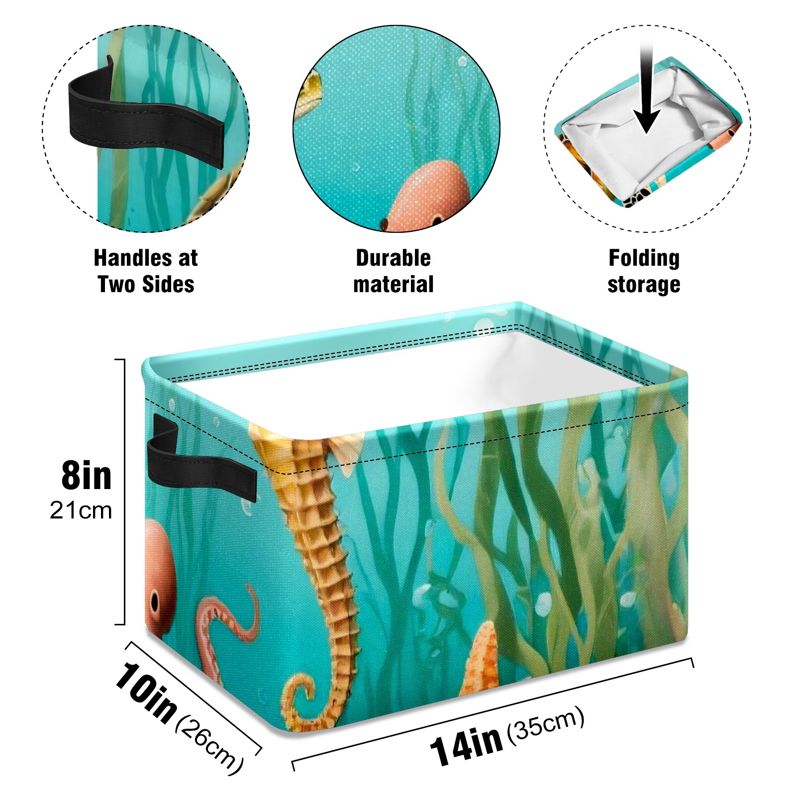 【Материал】Оксфордская ткань из полиэстера 600D; ручки изготовлены из полиэстера. 【Описание материала】Внешняя ткань: Оксфордская ткань полотняного переплетения высокой плотности 300D (ПВХ); Подкладка: белая ткань 750D; Ручки: черная композитная ткань 290T. 【Размер】26x35x21 см (10x14x8 дюймов) 【Описание продукта】Эта корзина для хранения с ручками с обеих сторон предлагает достаточно места для хранения предметов разных размеров, что делает ее подходящей для различных случаев, таких как дом, офис и школа. Ручки с обеих сторон закреплены гвоздями для долговечности. Прочный металлический каркас окружает корзину, поддерживая ее форму. Складная корзина для хранения: Наши корзины для хранения легко складываются, когда не используются. Эти ящики для хранения изготовлены из легко моющейся оксфордской ткани и при необходимости могут быть аккуратно протерты мягким мылом и водой. Из-за внутреннего металлического каркаса и жесткого дна машинная стирка не рекомендуется. 【Подходящие сценарии использования】Дом, офис и школа 【Инструкции по стирке】Рекомендуется ручная стирка; избегайте длительного воздействия прямых солнечных лучей.