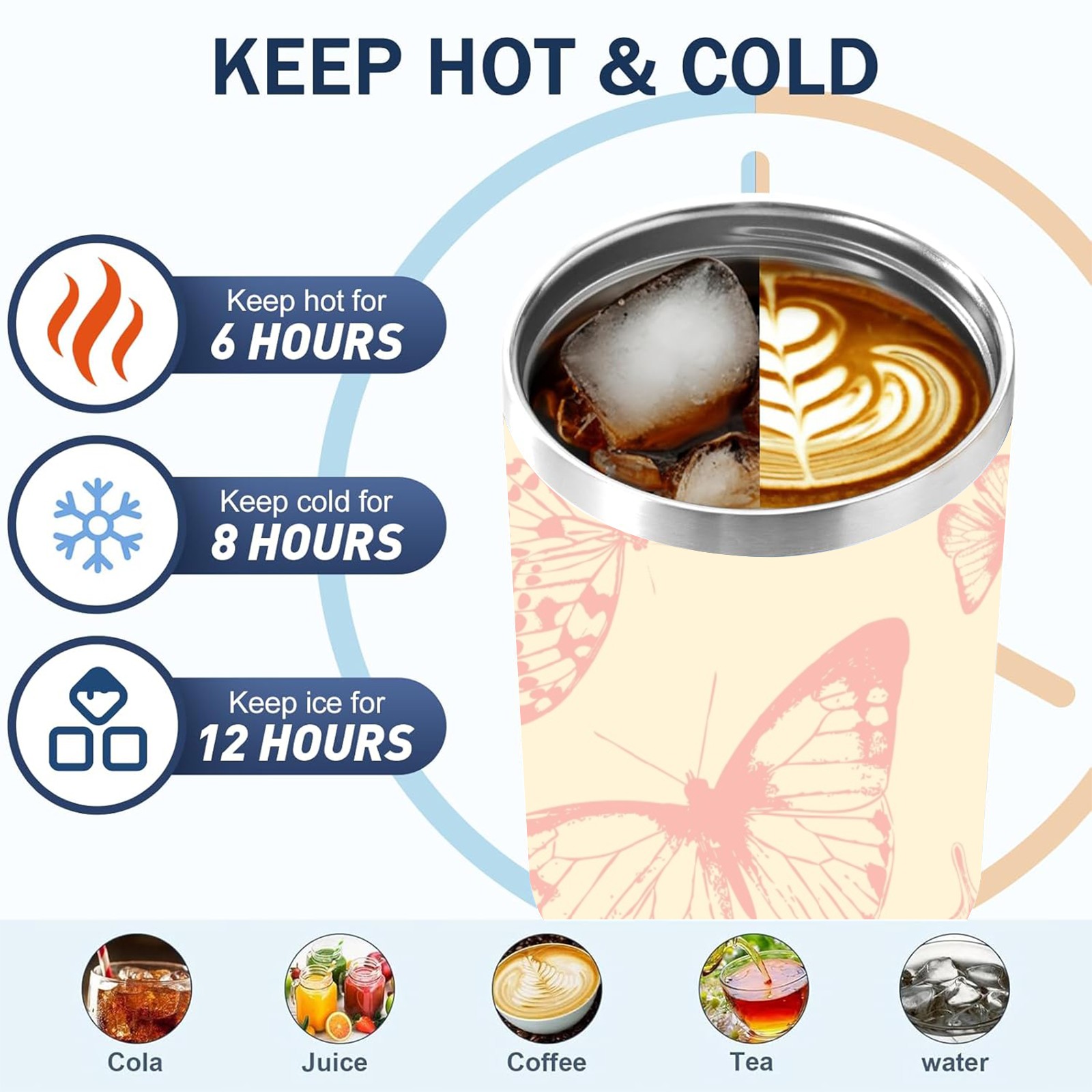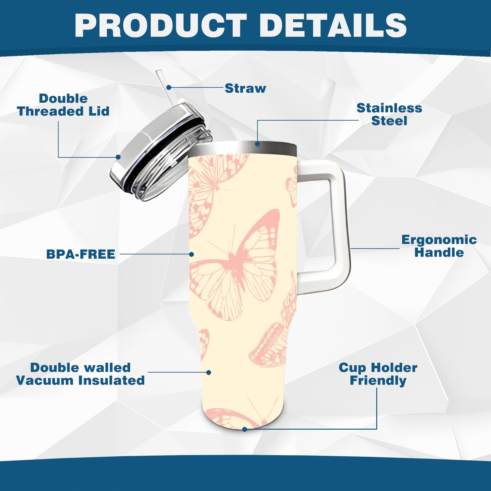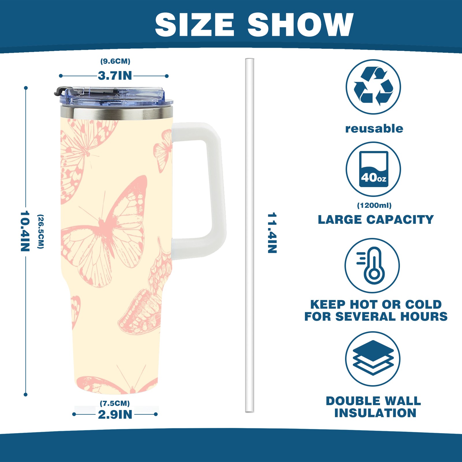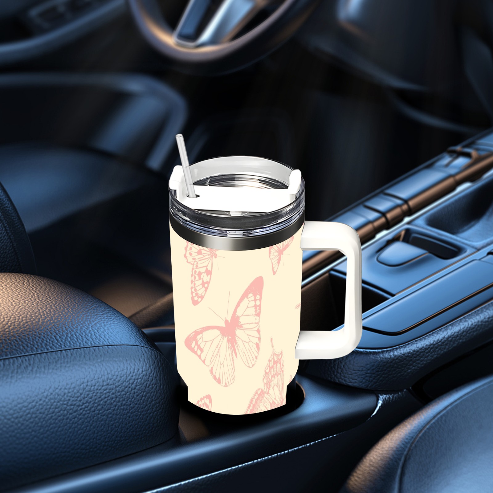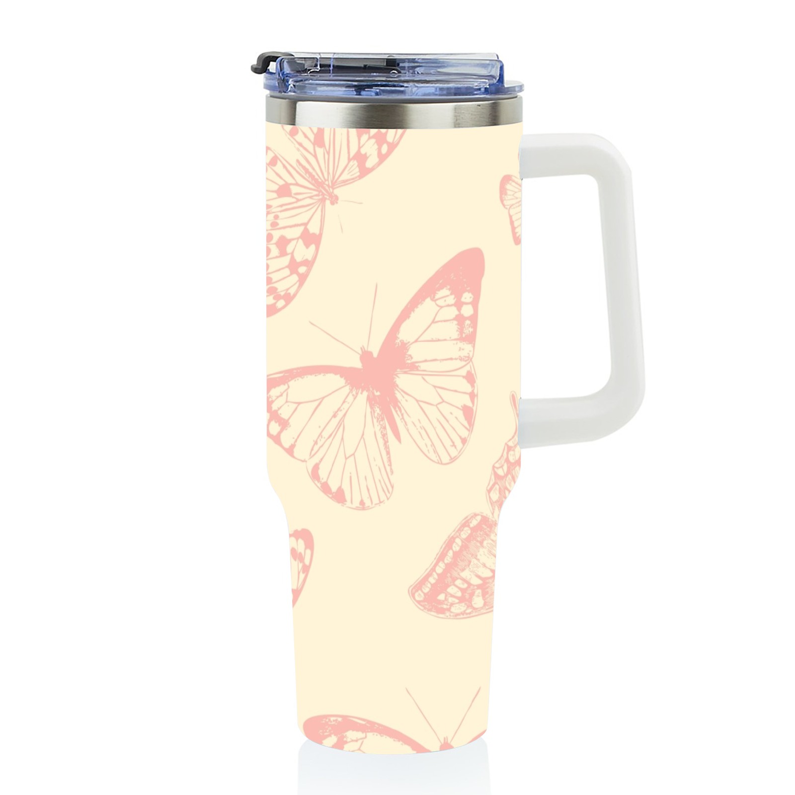 40oz Butterflies Vintage Seamless thermos with lid and straw, leak-proof stainless steel, with handle, spill-proof bottle, convenient for travel(pink)