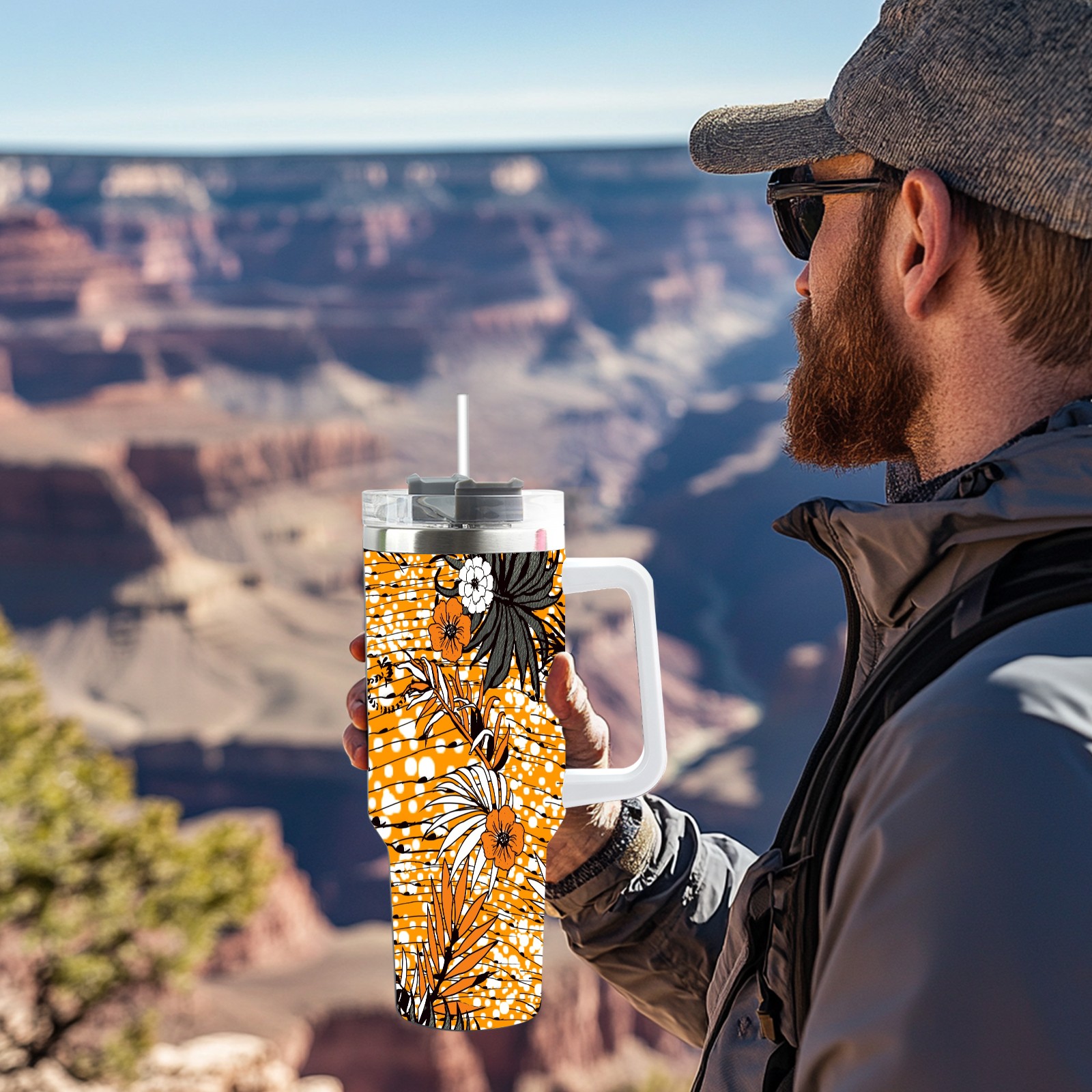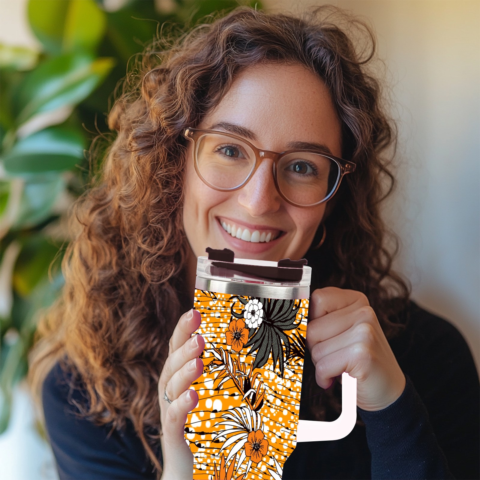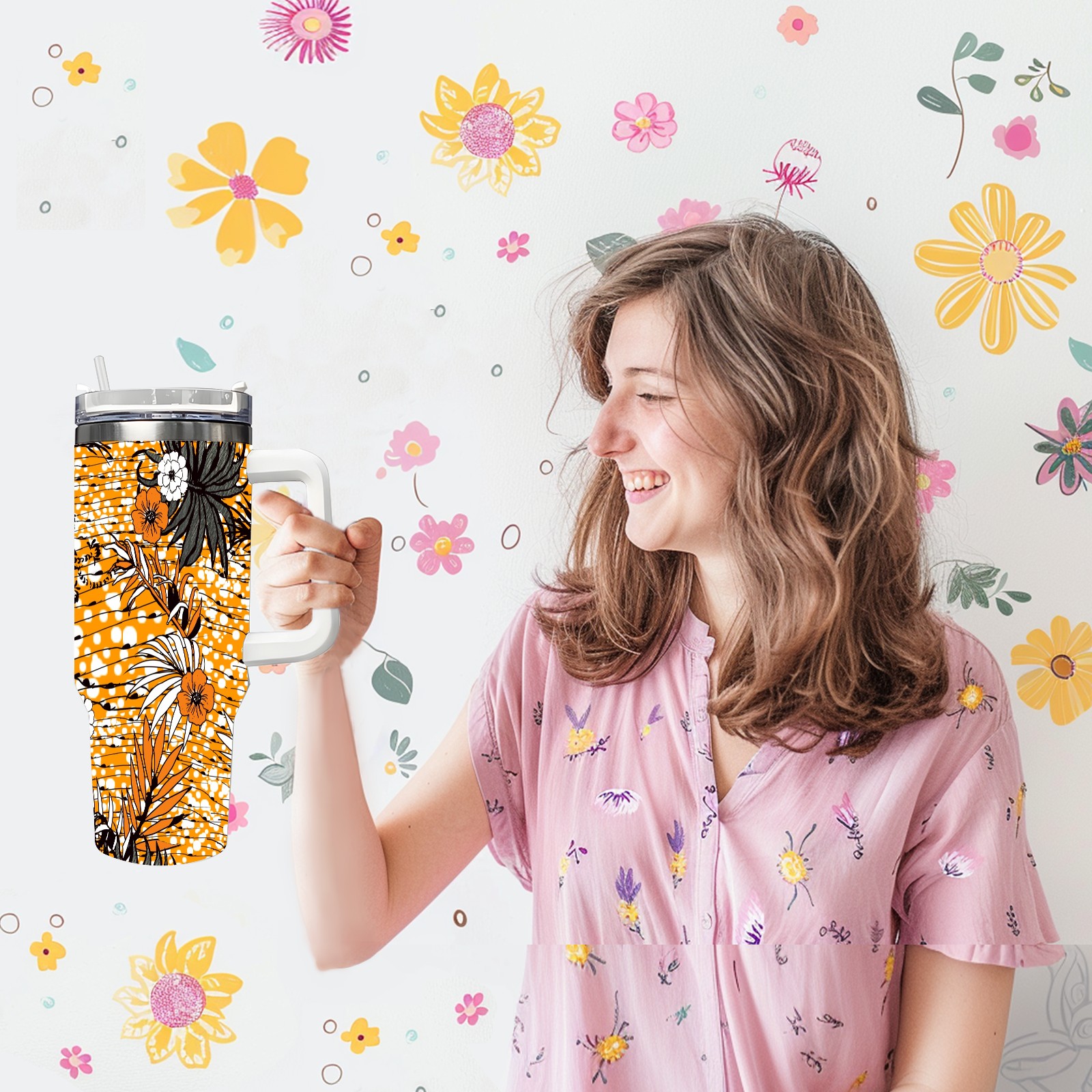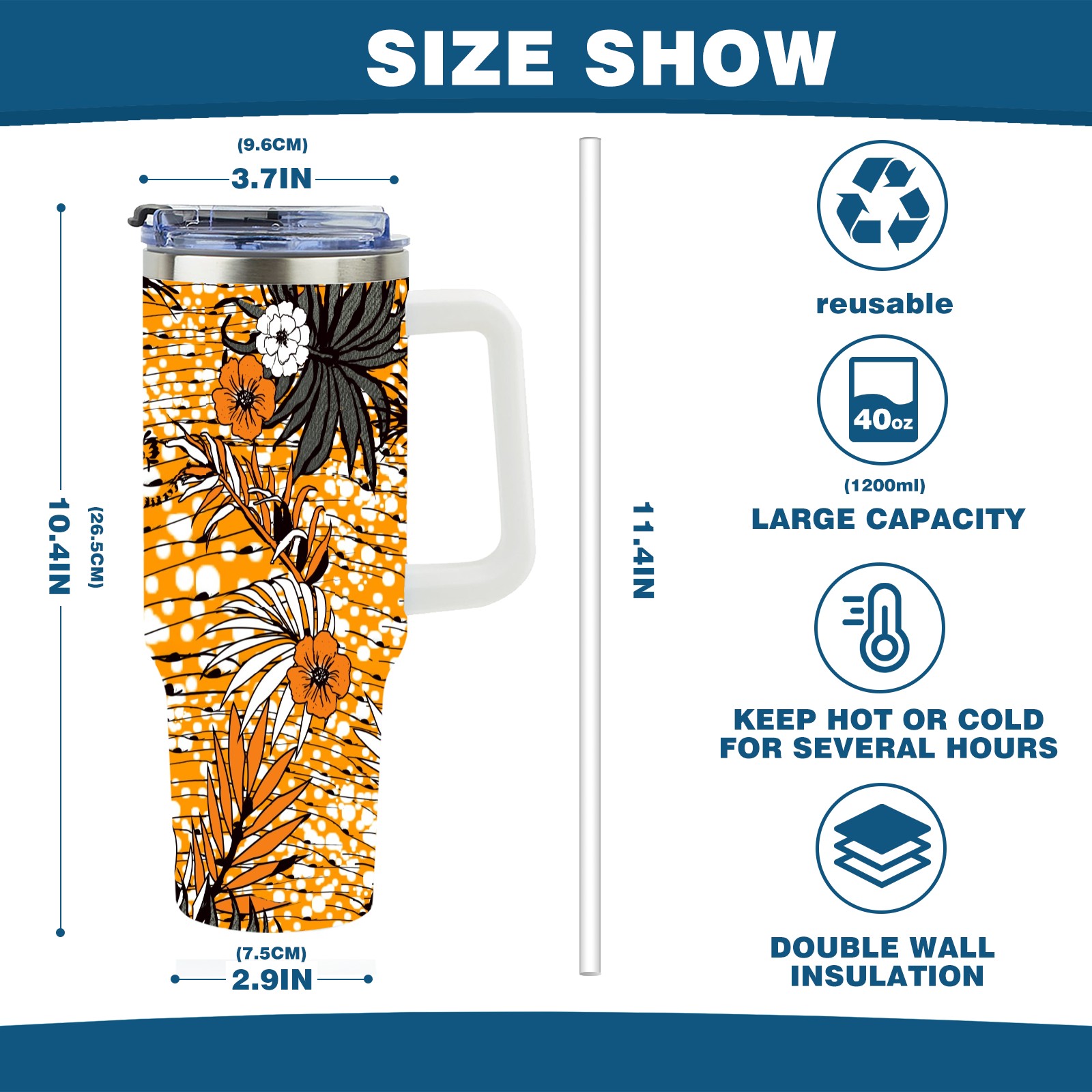 40oz Leaf Flower Seamless thermos with lid and straw, leak-proof stainless steel, with handle, spill-proof bottle, convenient for travel(pink)