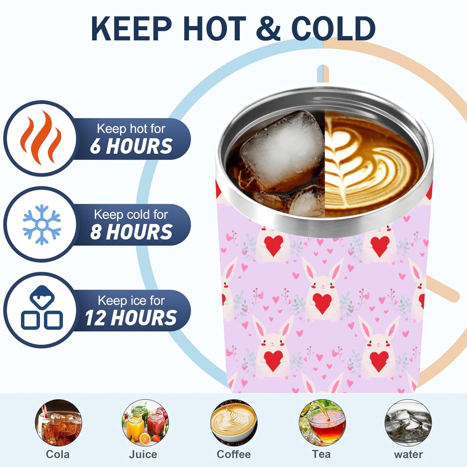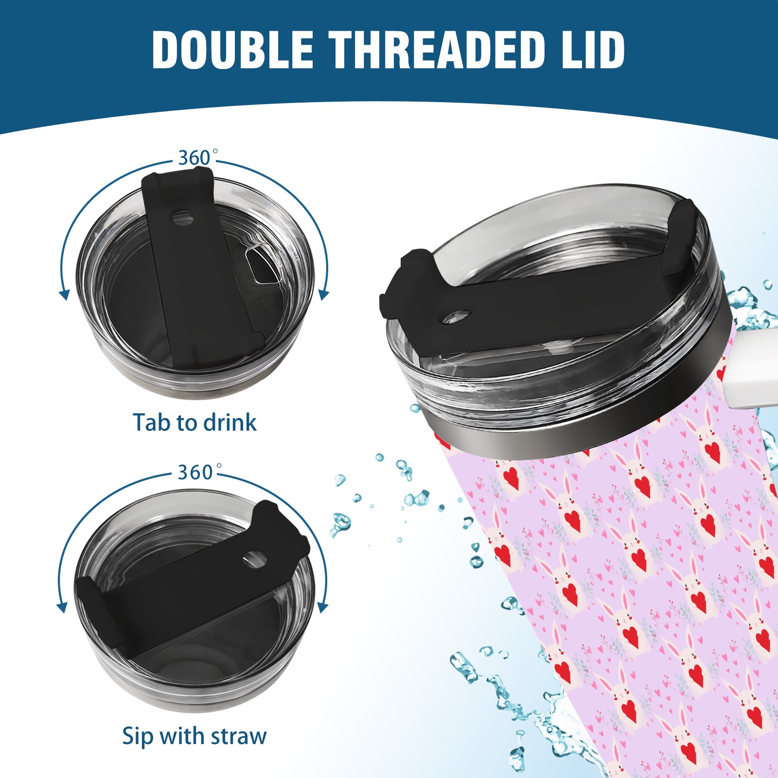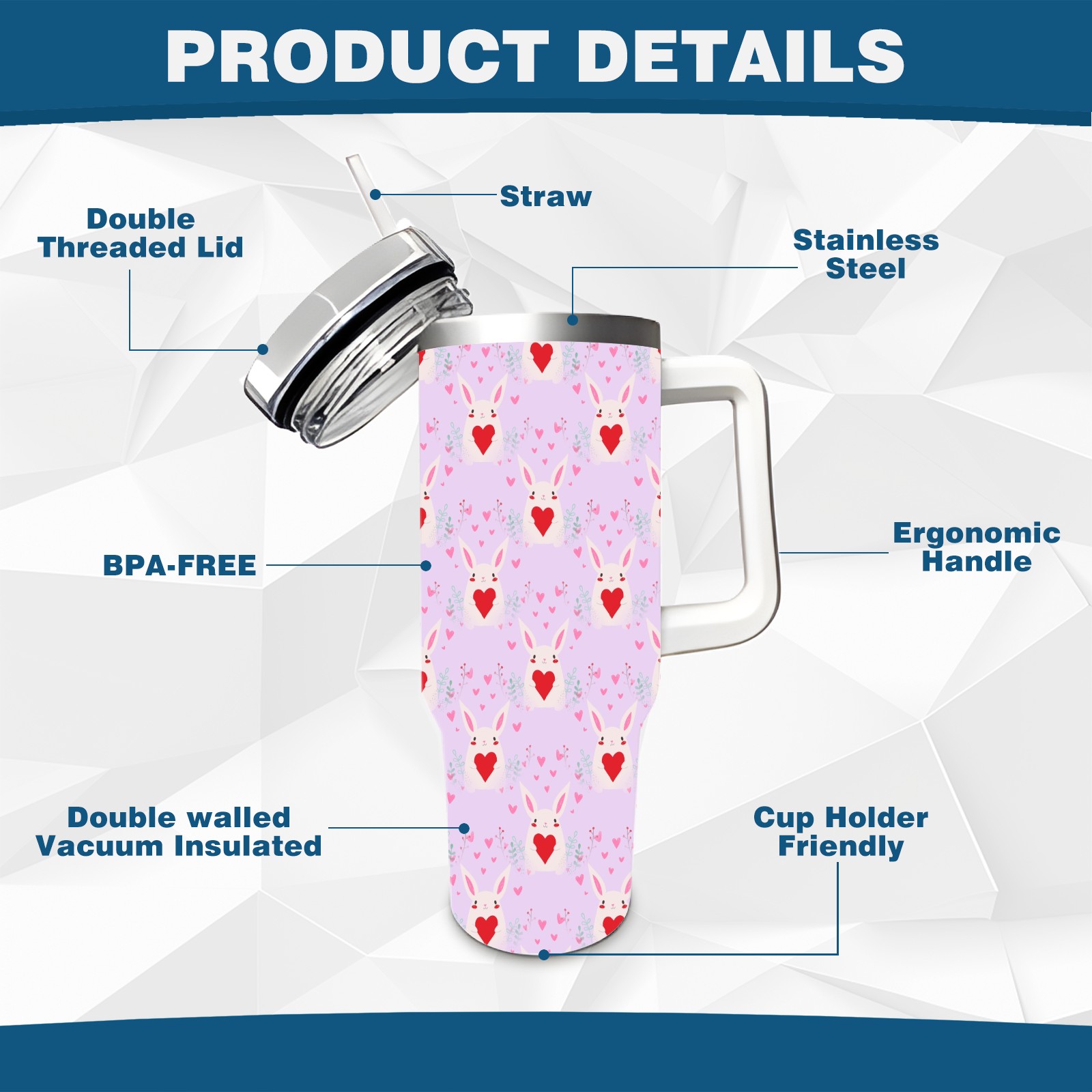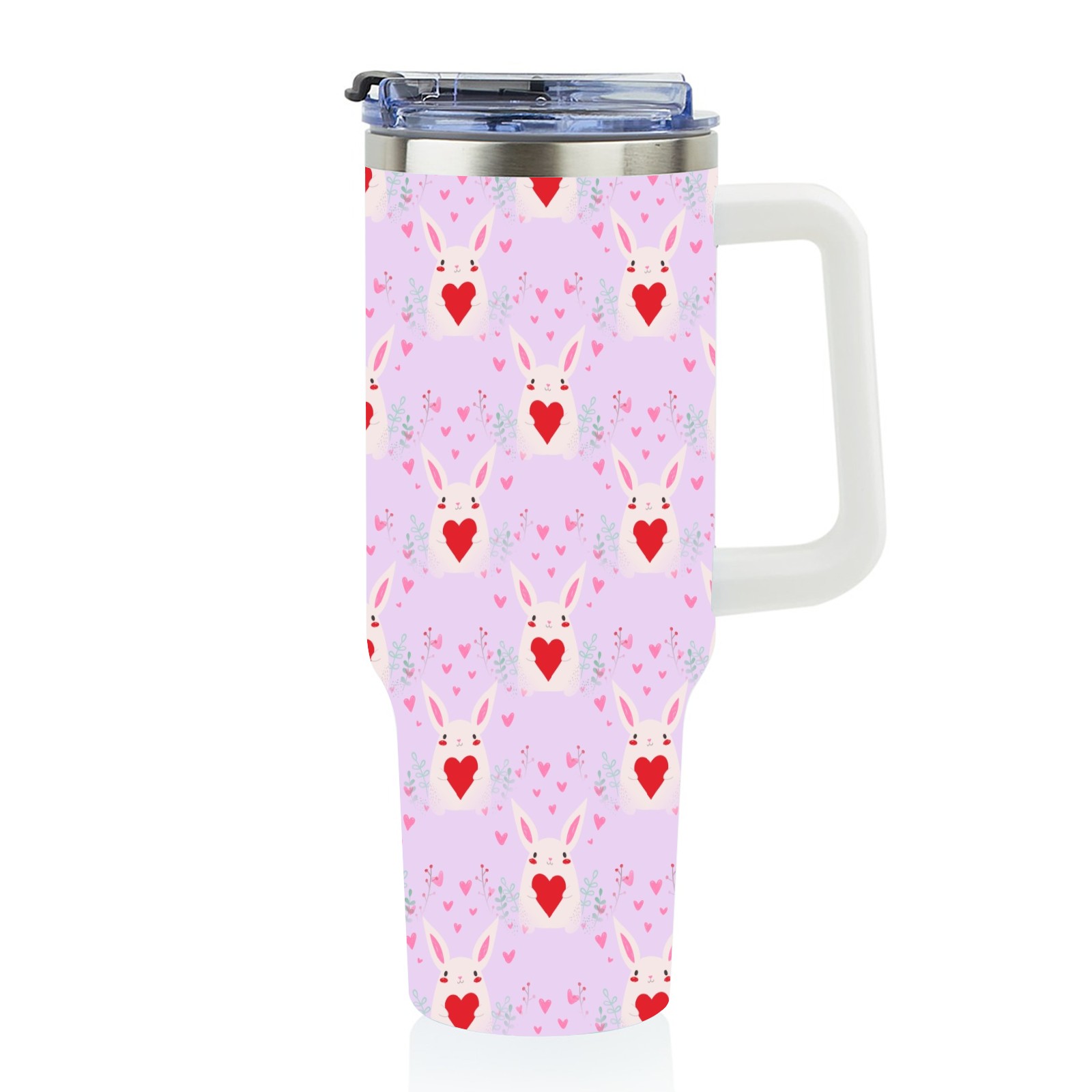40oz Bunny Heart Seamless thermos with lid and straw, leak-proof stainless steel, with handle, spill-proof bottle, convenient for travel(pink)