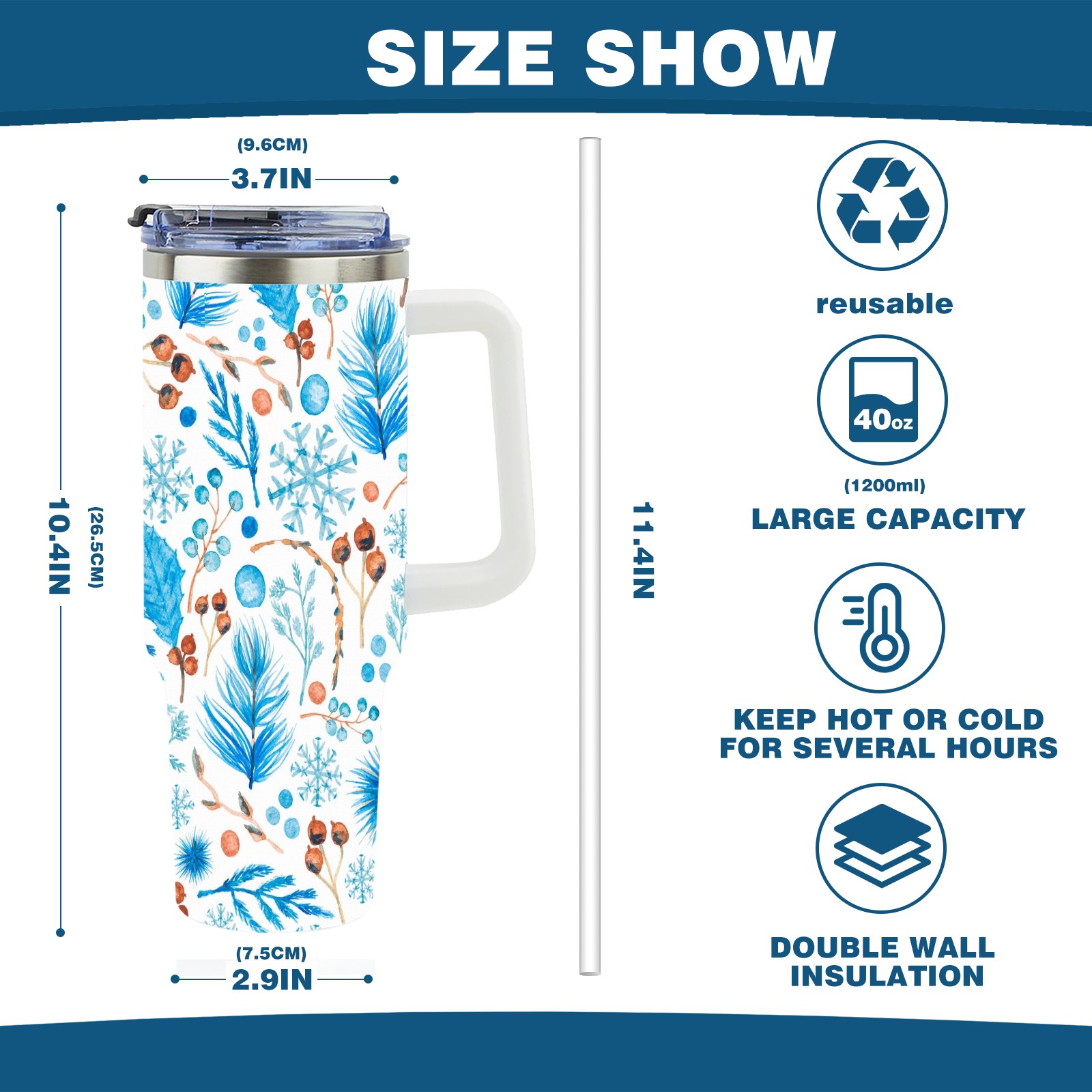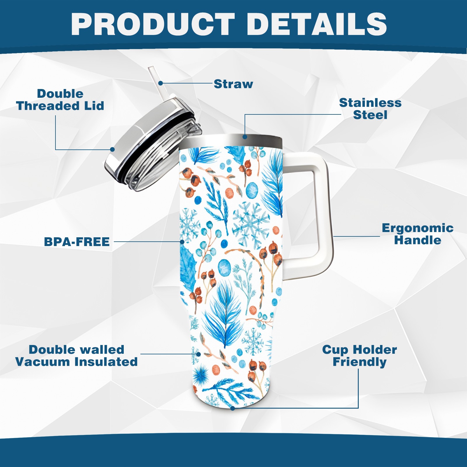• <p>This multi-functional insulated water bottle features a simple and practical design, suitable for various daily scenarios. The ergonomic handle allows for easy one-handed drinking, and the detachable handle can be adjusted or removed as needed, making it convenient for commuting, exercising, or carrying to meetings. Made of high-quality stainless steel, it is BPA-free and features double-walled vacuum insulation technology that keeps drinks cold for 8 hours and hot for 6 hours, ensuring you can enjoy your beverage at the perfect temperature anytime, anywhere. The 40-ounce Christmas edition comes with a sliding lid, silicone straw, and a non-slip design. Accessories are dishwasher safe, and the narrow bottom and wide mouth design perfectly fits car cup holders. The exclusive flip-top straw lid is environmentally friendly and durable, with a one-touch leak-proof closure and two drinking modes: sip and gulp. A dust cover provides effective protection. This bottle is suitable for travel, office work, sports, camping, and other occasions, making it a thoughtful gift for friends and family.</p>