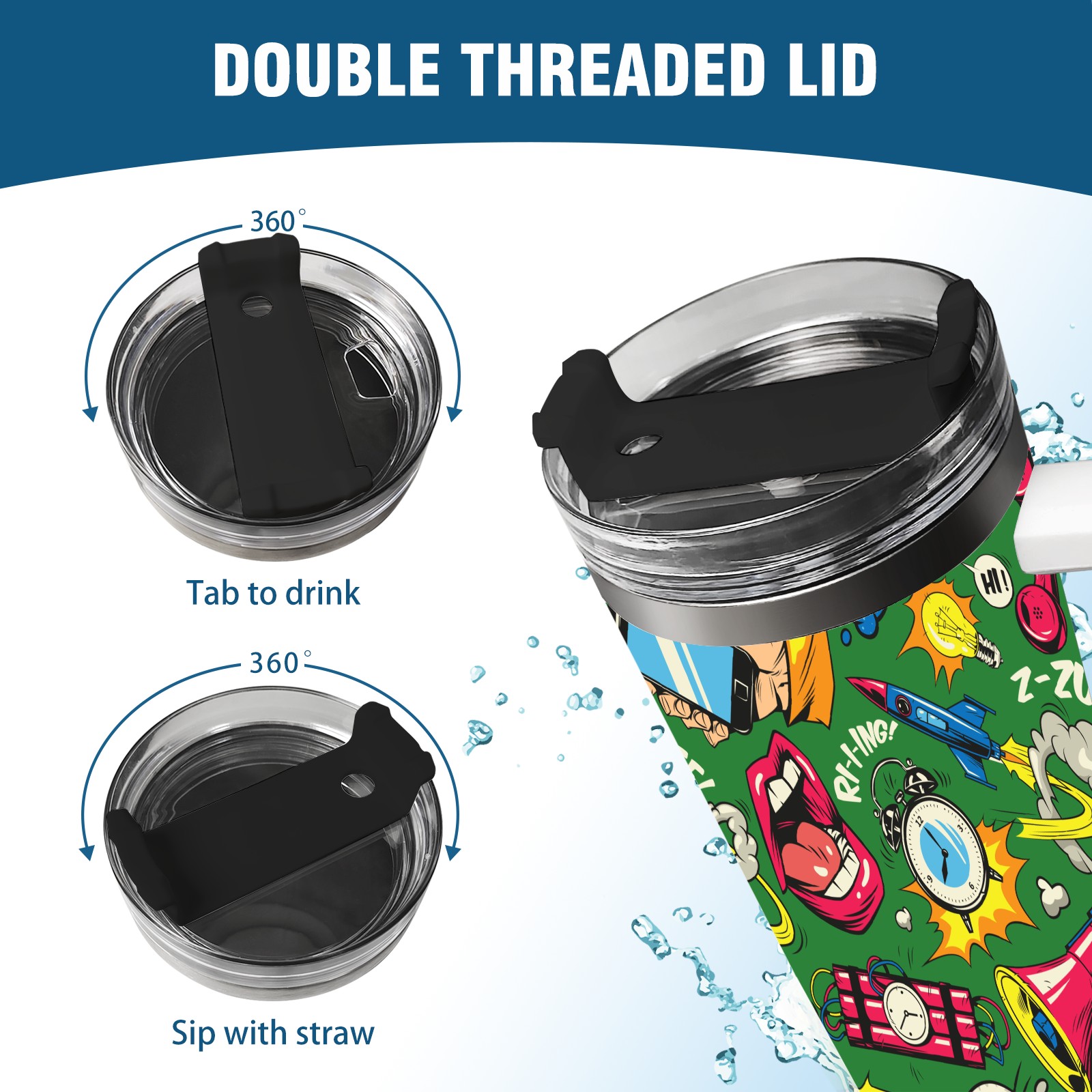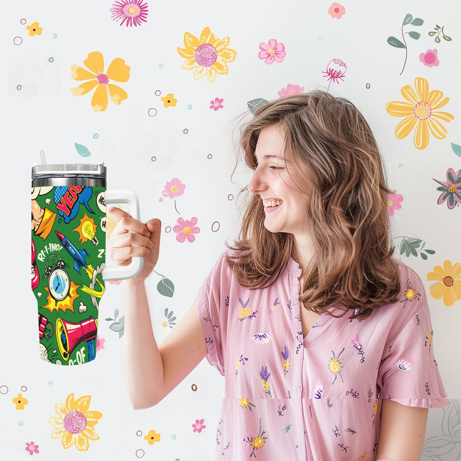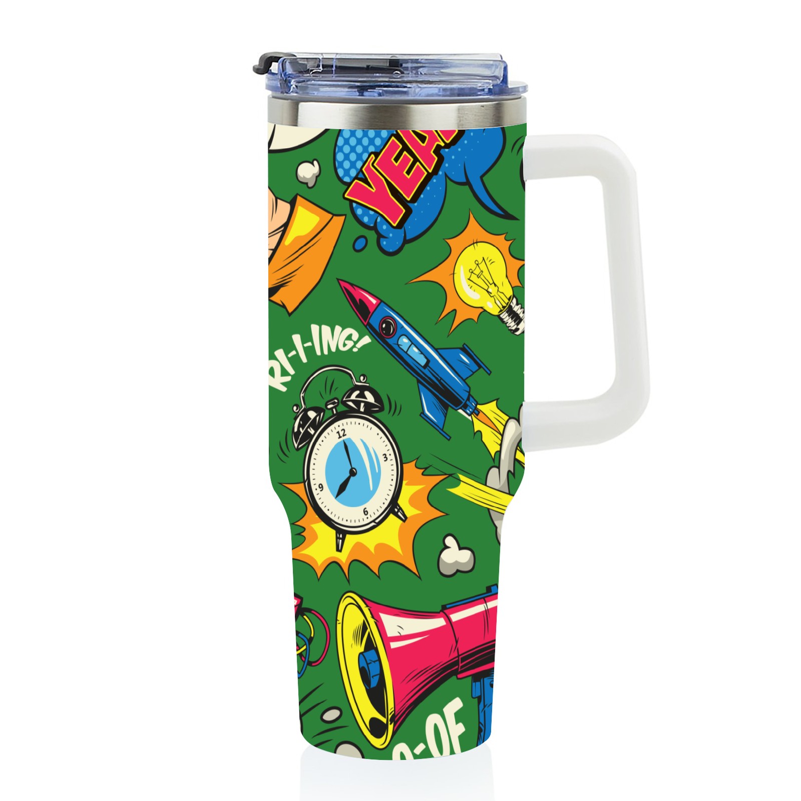 40oz Pop Art Seamless thermos with lid and straw, leak-proof stainless steel, with handle, spill-proof bottle, convenient for travel(pink)