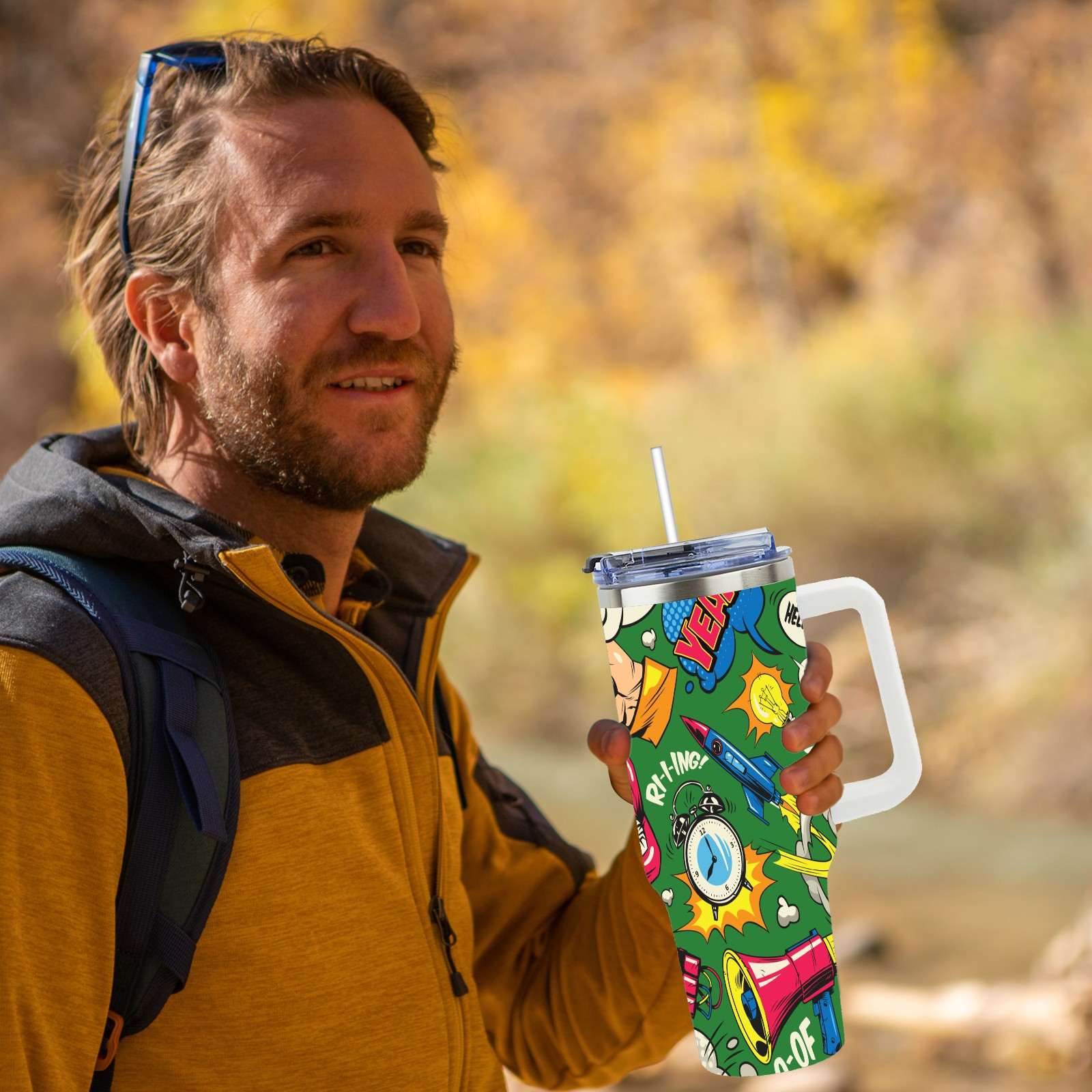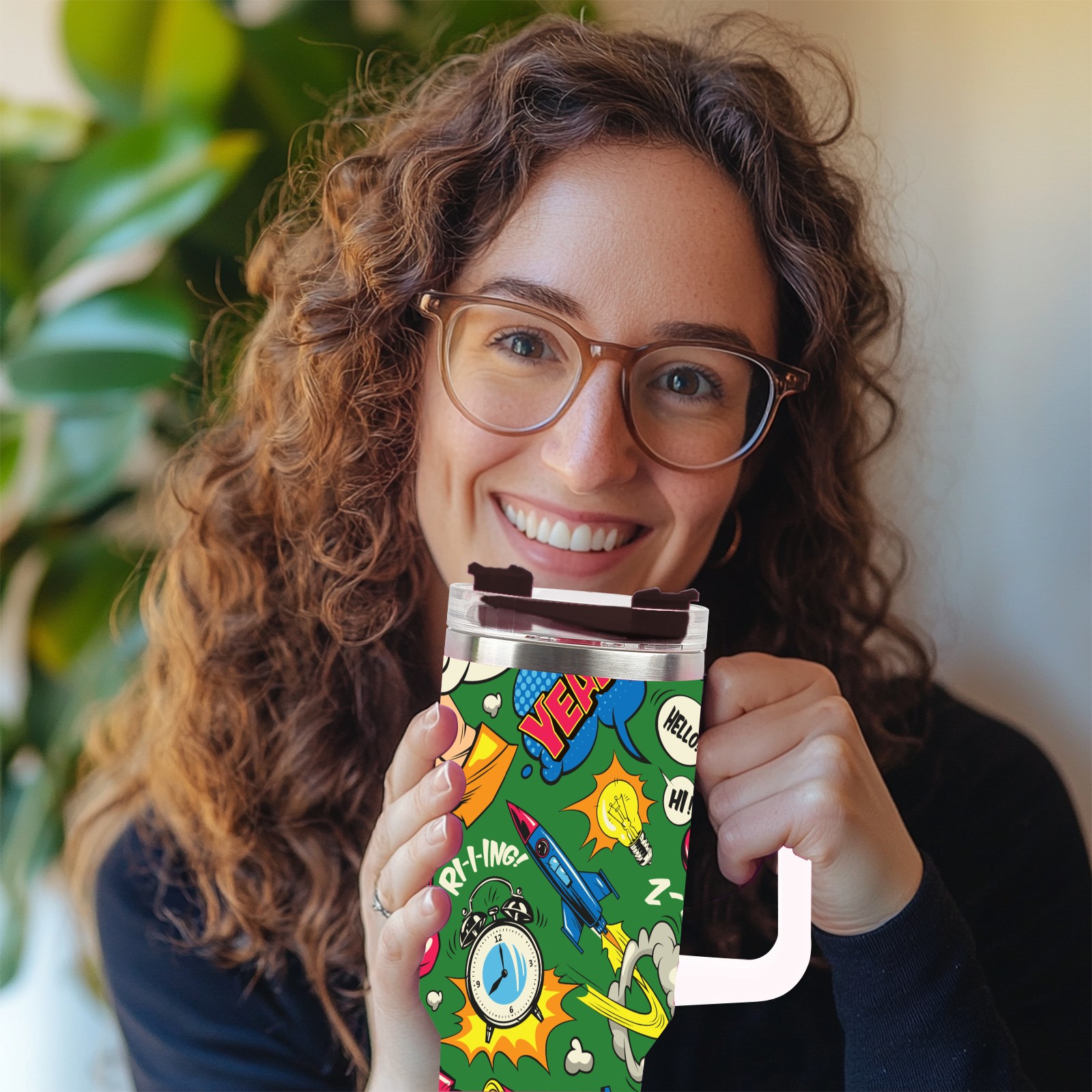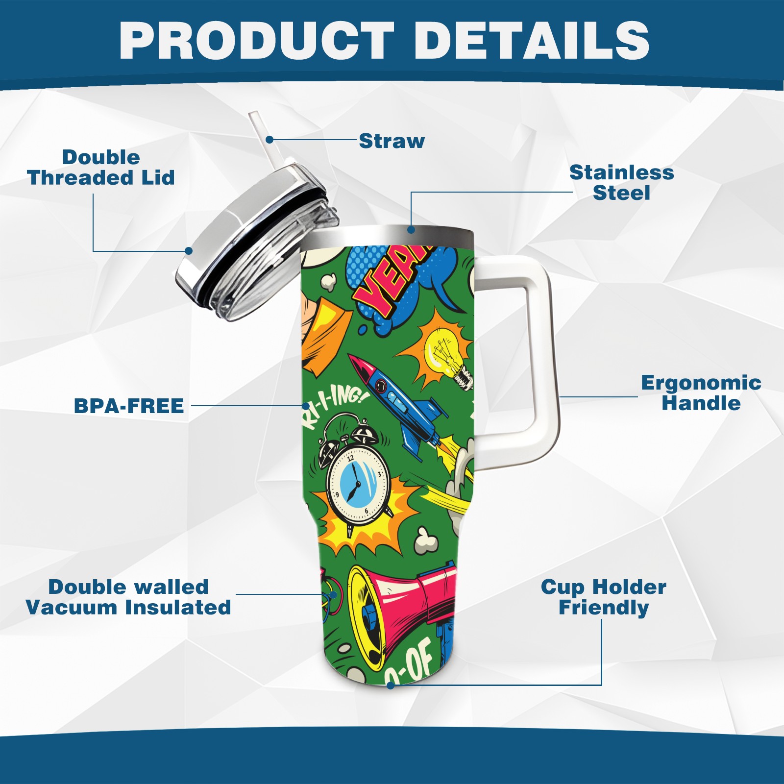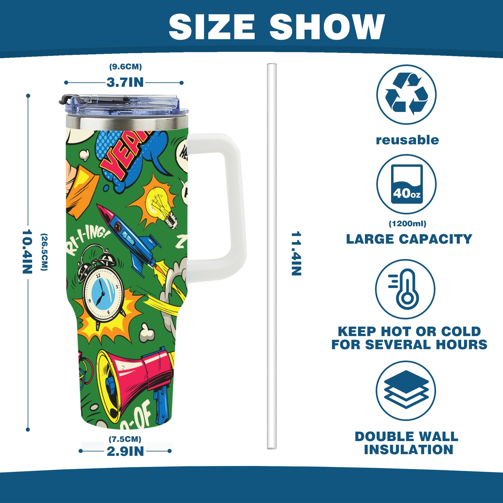 40oz Pop Art Seamless thermos with lid and straw, leak-proof stainless steel, with handle, spill-proof bottle, convenient for travel(pink)