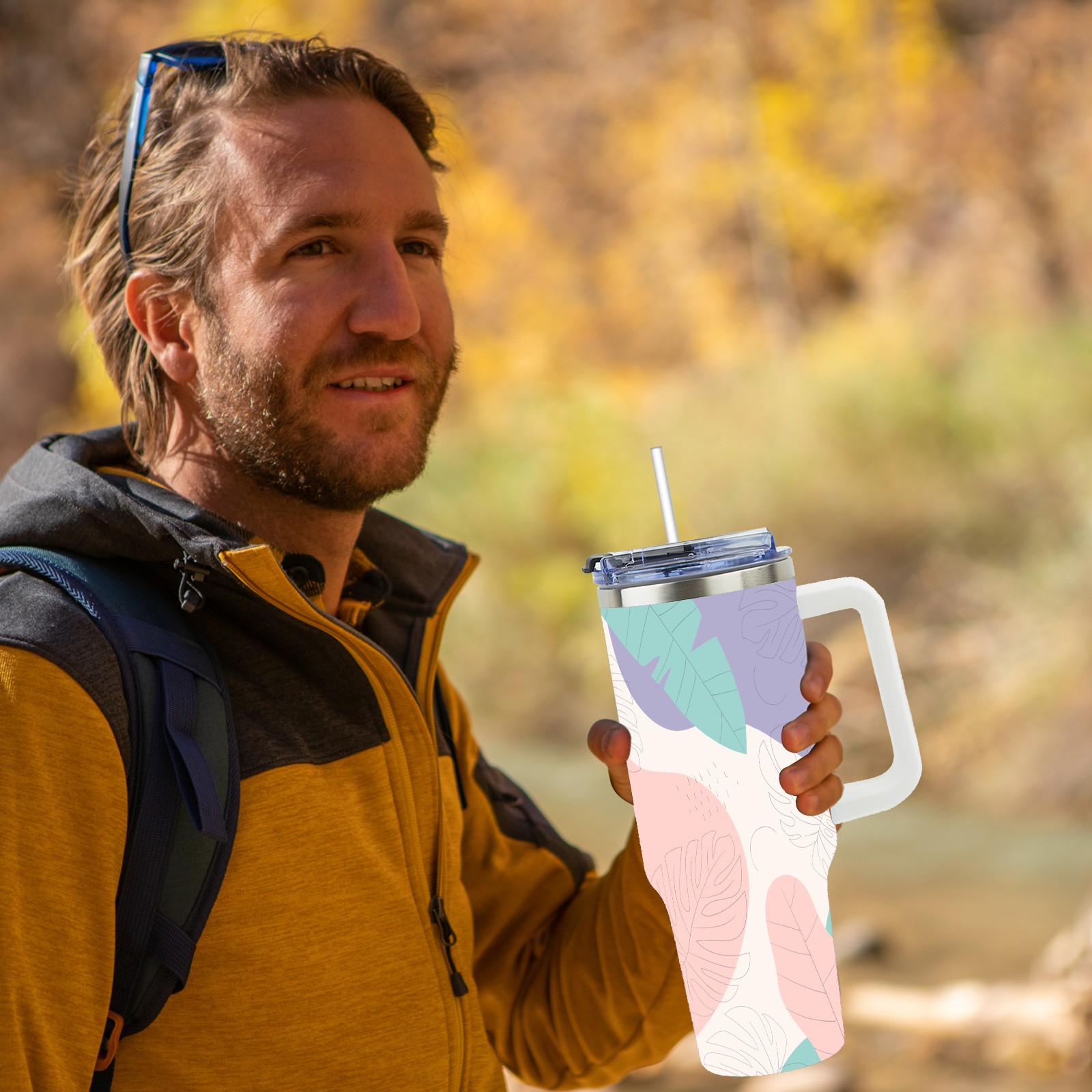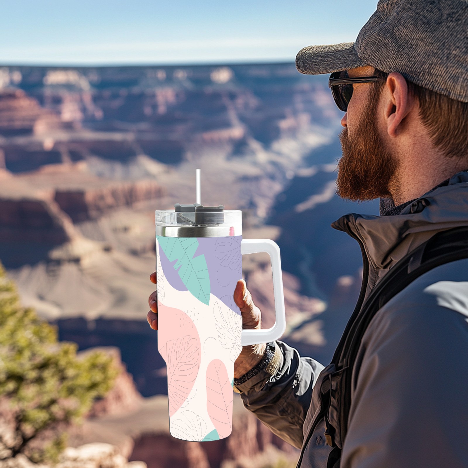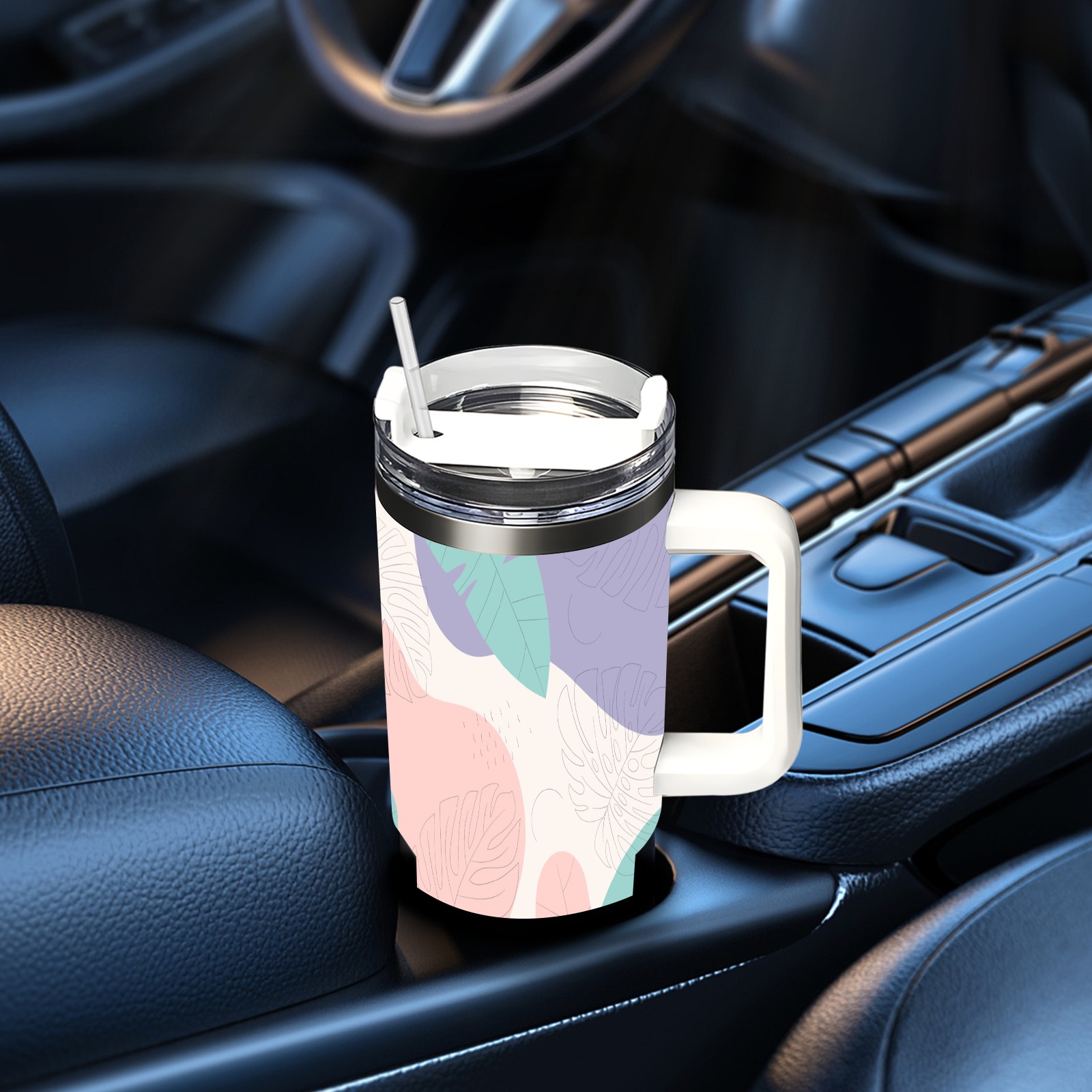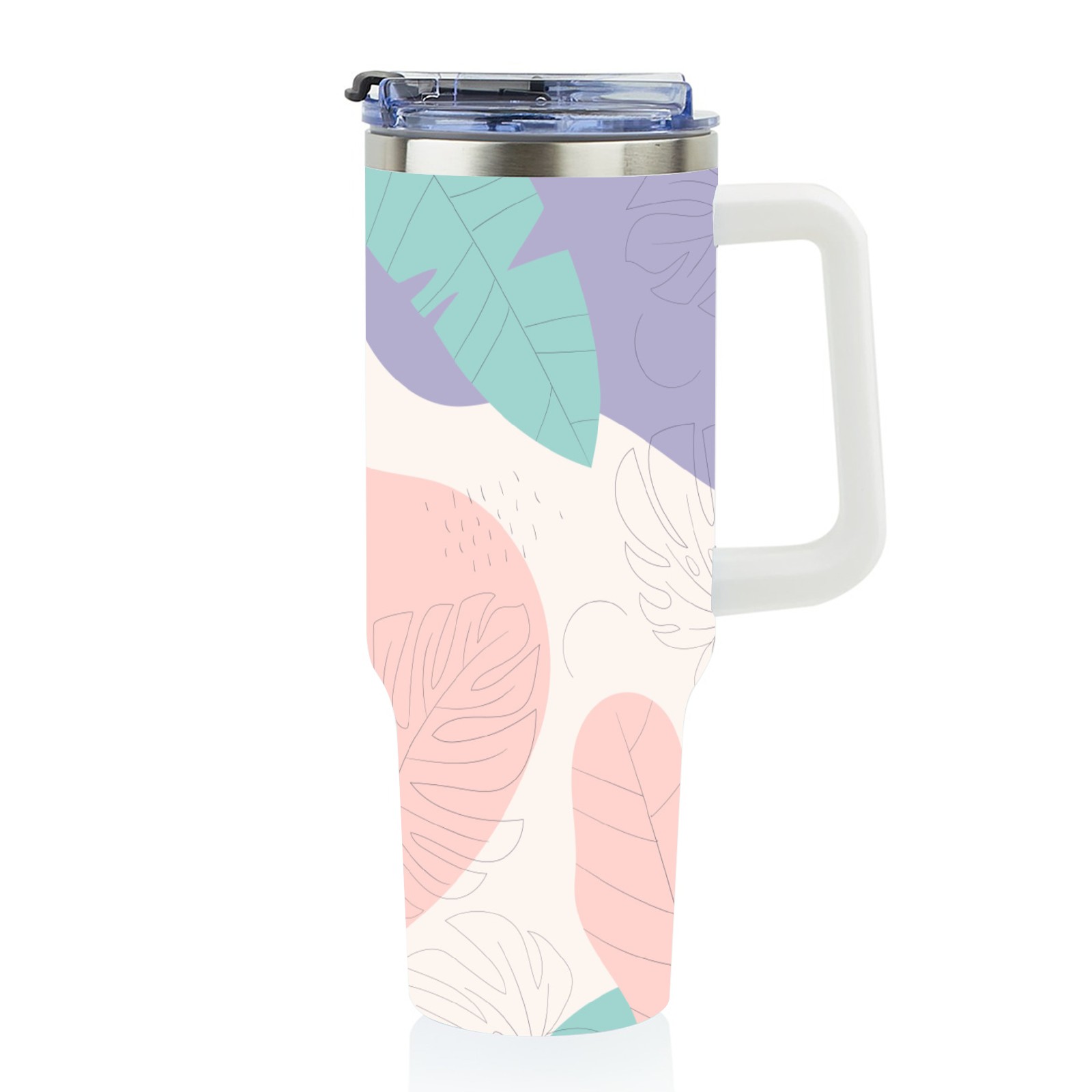 40oz Leaves Colorful Seamless thermos with lid and straw, leak-proof stainless steel, with handle, spill-proof bottle, convenient for travel(pink)