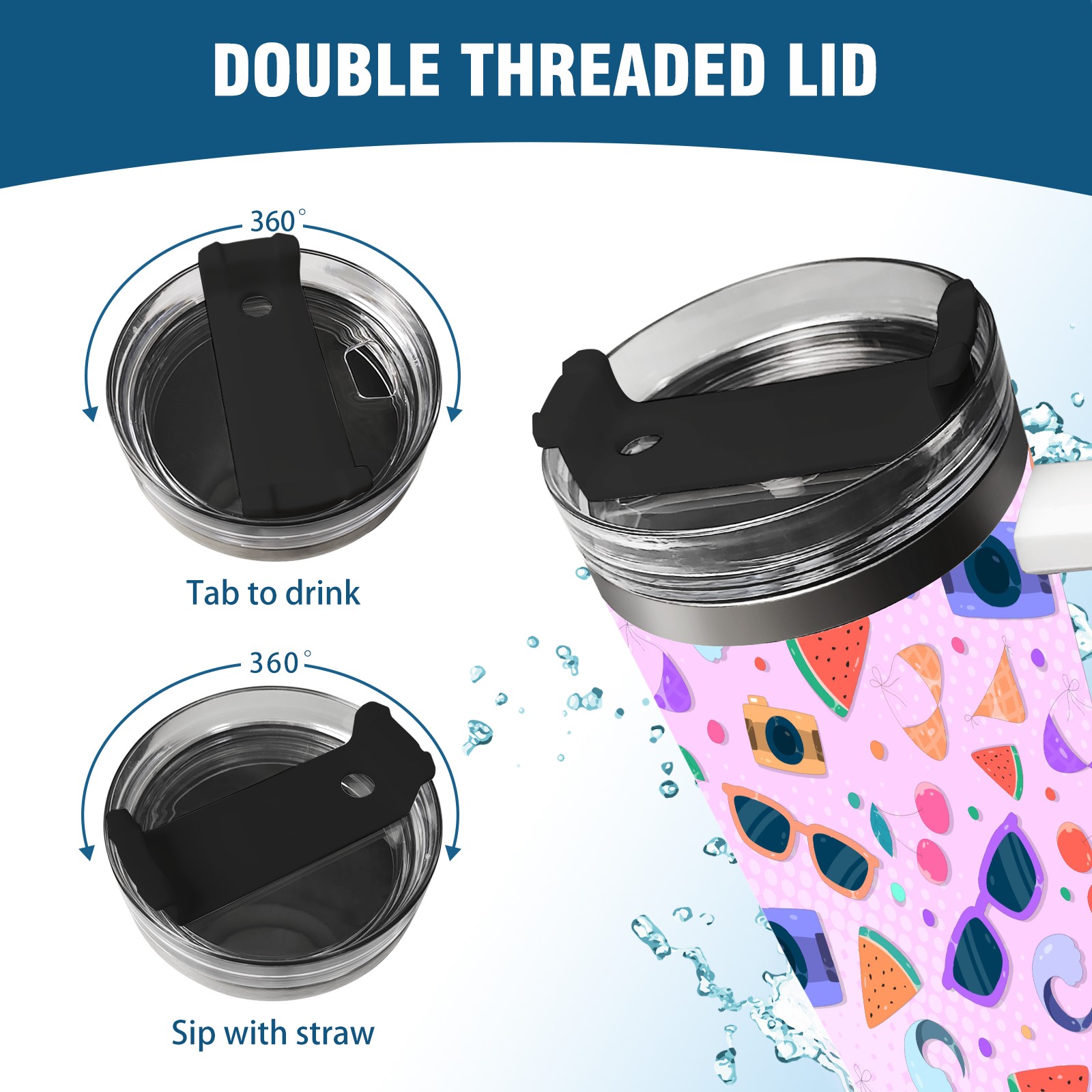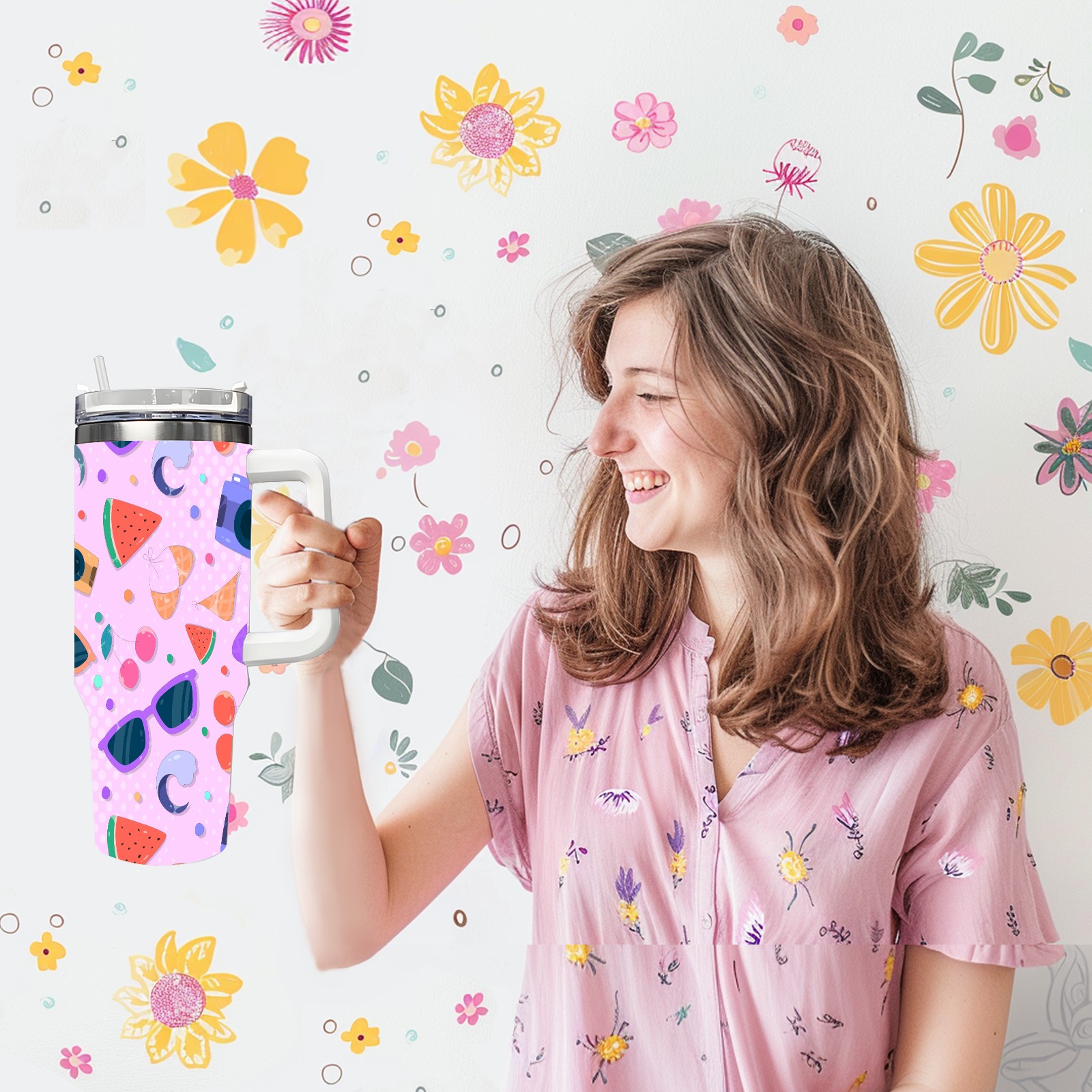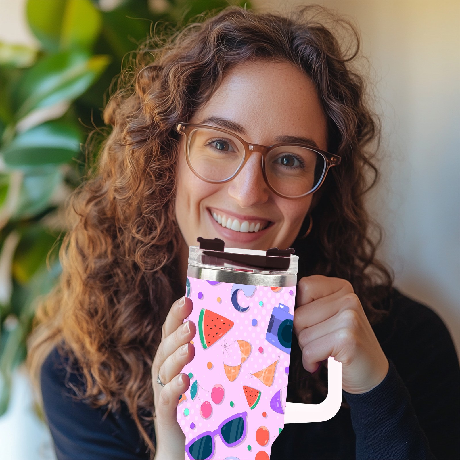 40oz Camera Sunglasses Seamless thermos with lid and straw, leak-proof stainless steel, with handle, spill-proof bottle, convenient for travel(pink)