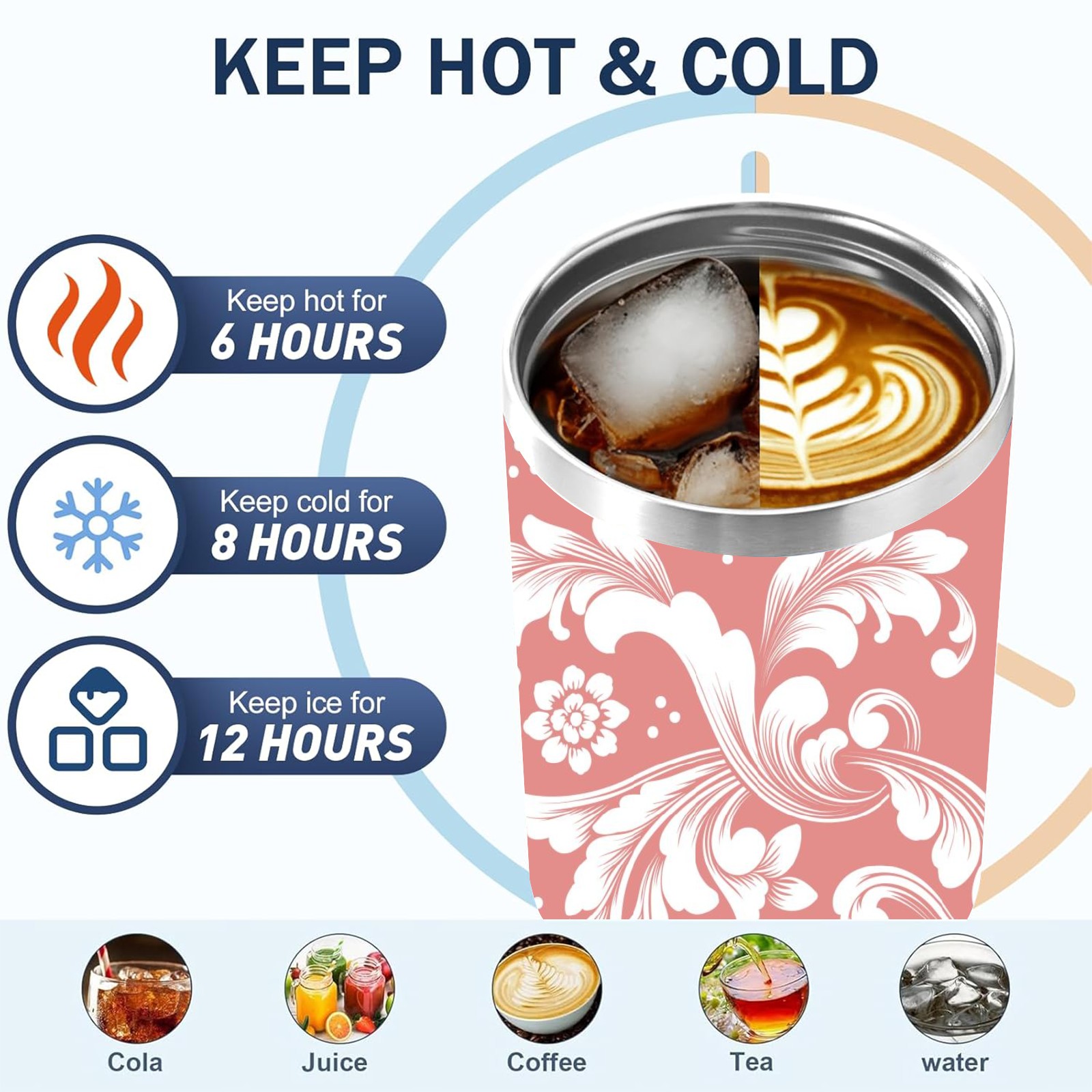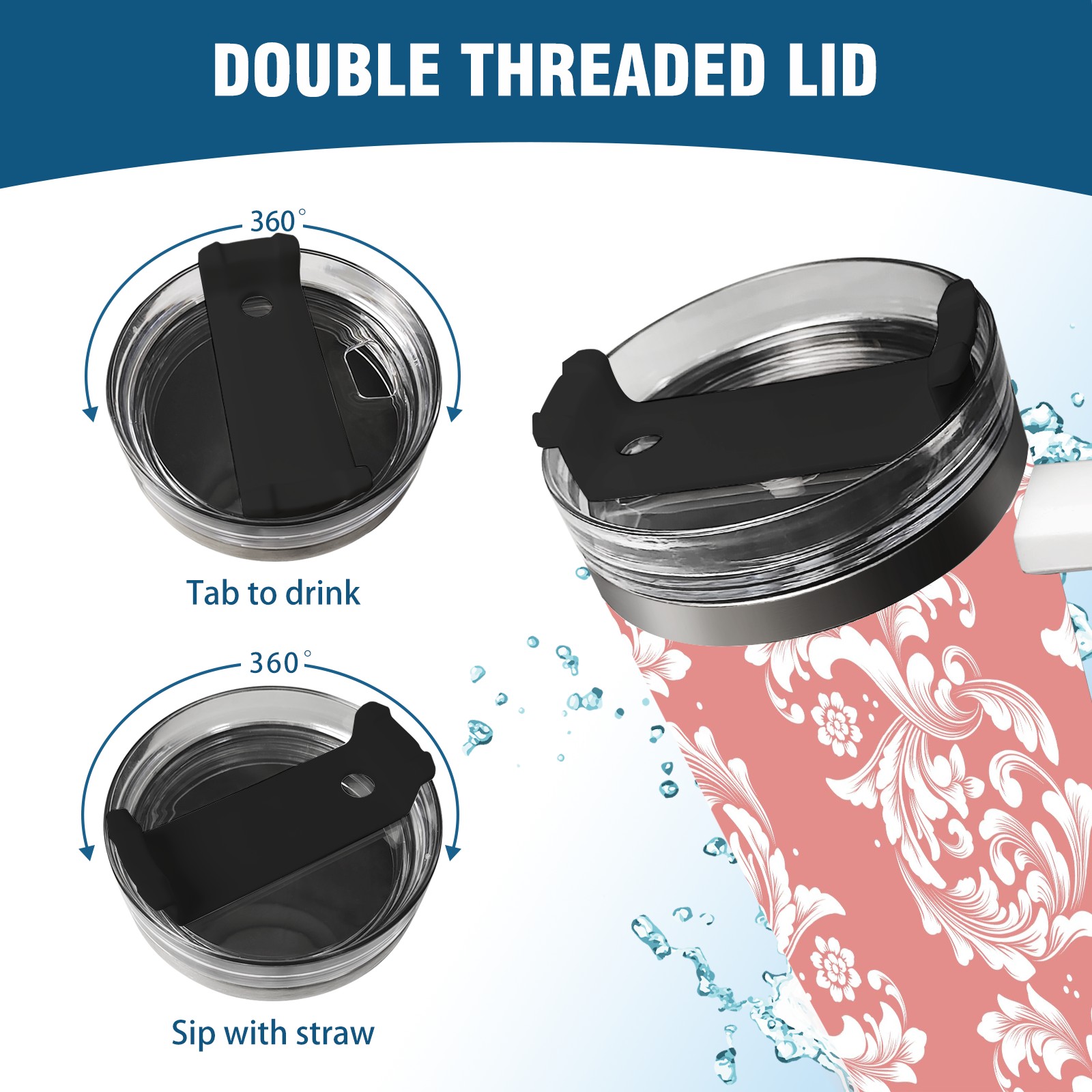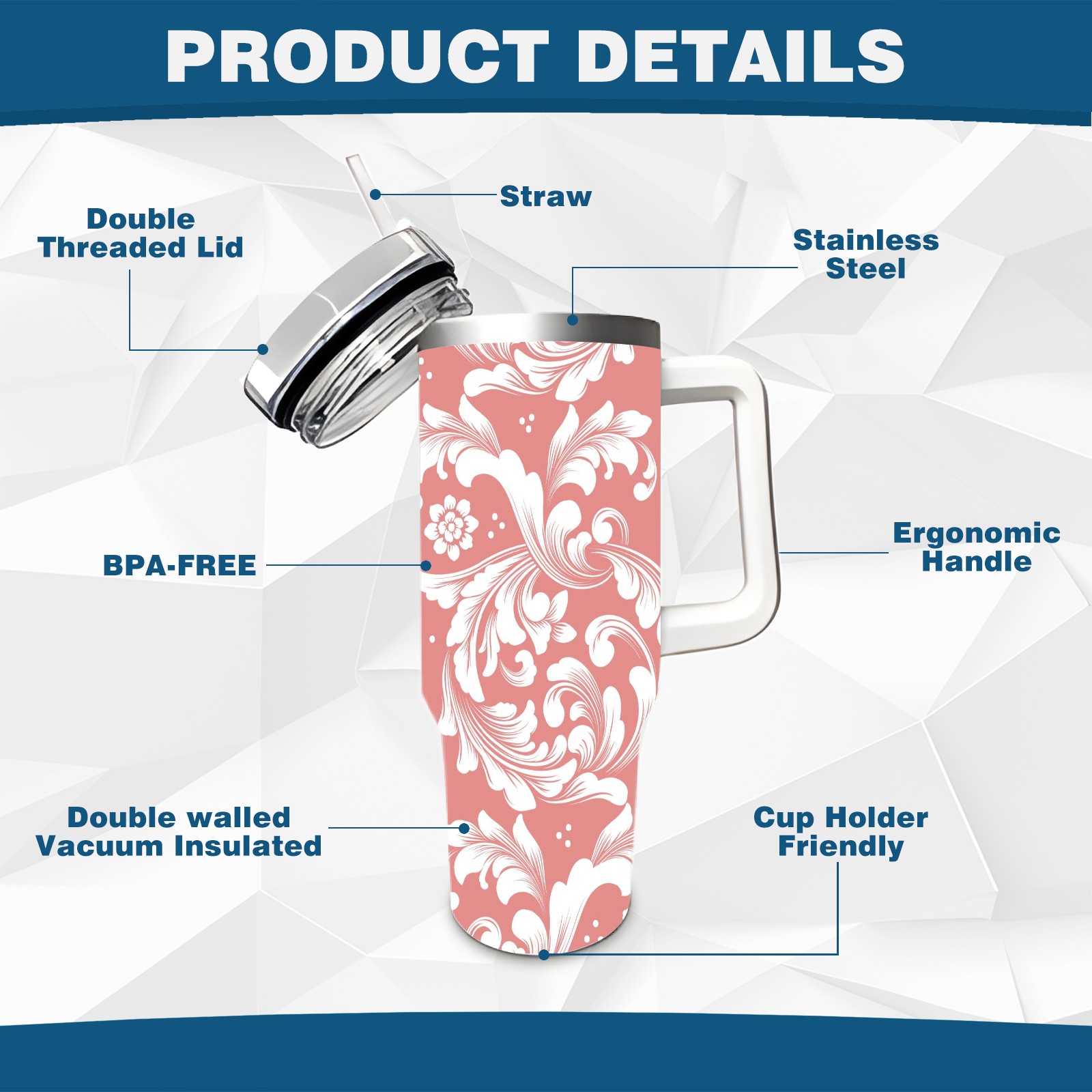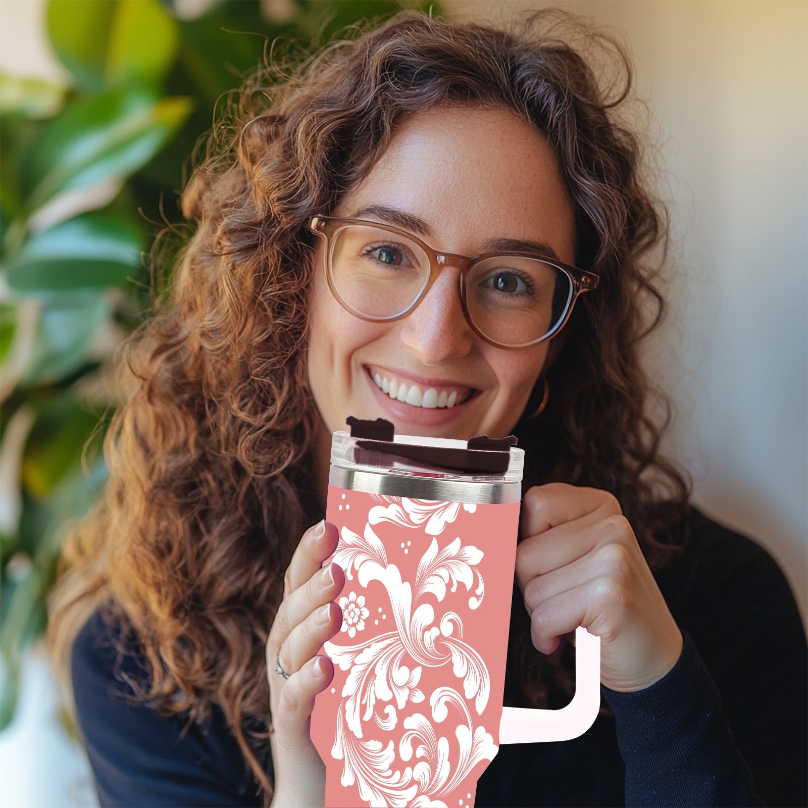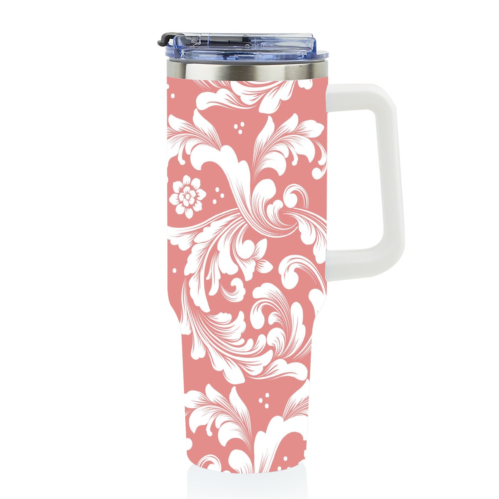 40oz Damask Seamless Red thermos with lid and straw, leak-proof stainless steel, with handle, spill-proof bottle, convenient for travel(pink)