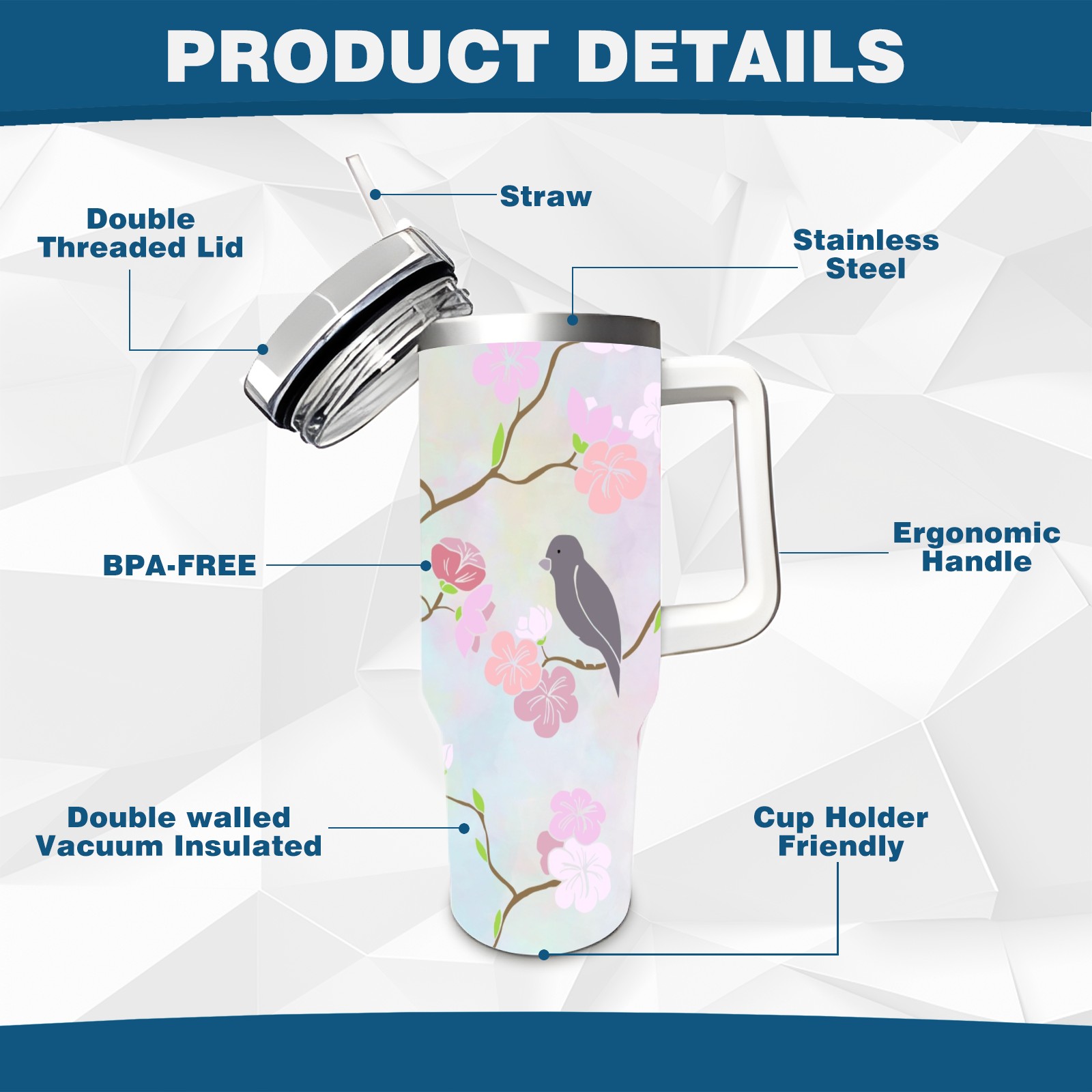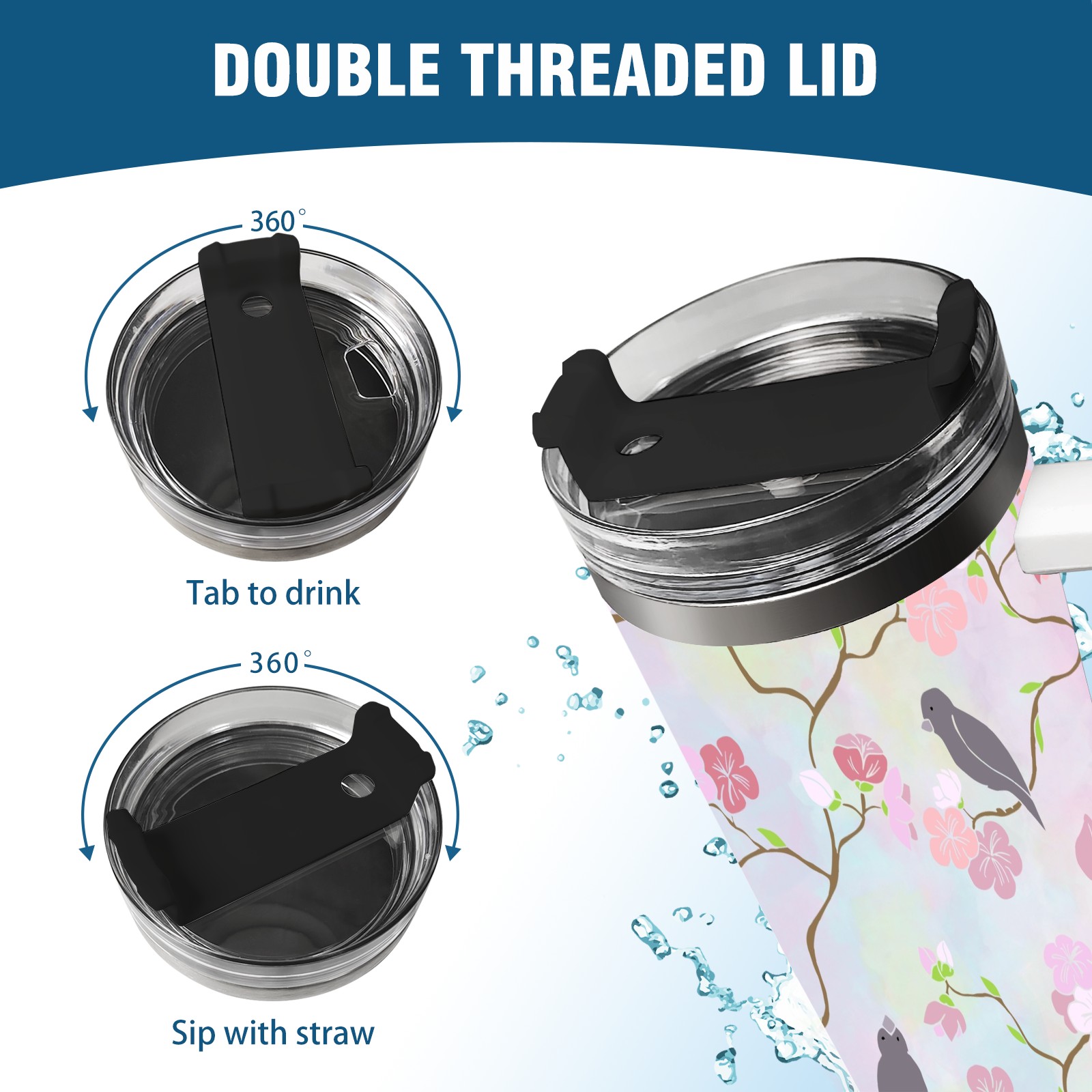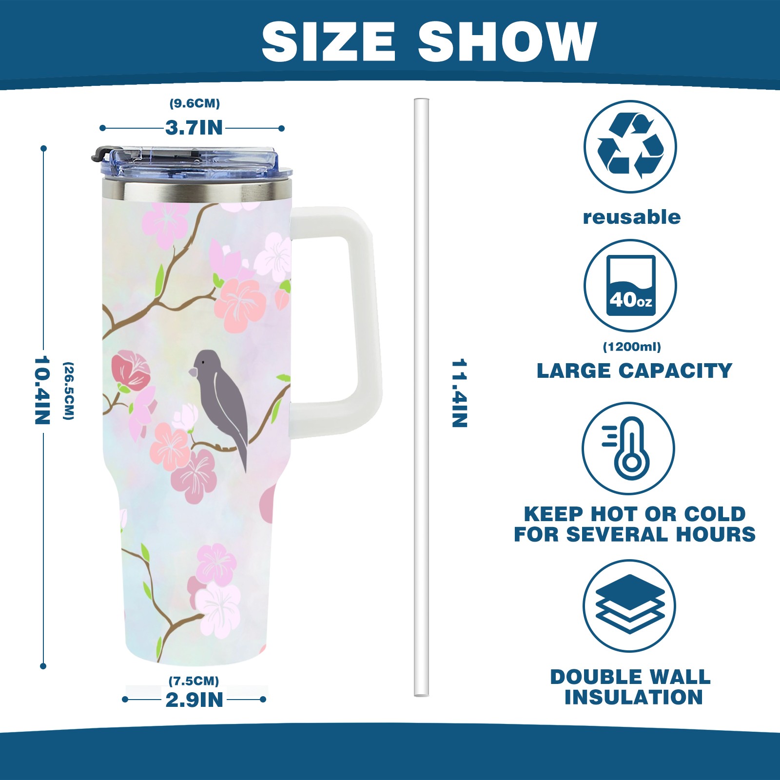 40oz Birds Blossom Seamless thermos with lid and straw, leak-proof stainless steel, with handle, spill-proof bottle, convenient for travel(pink)