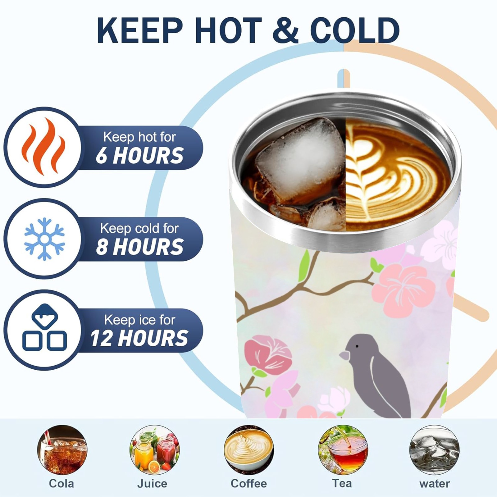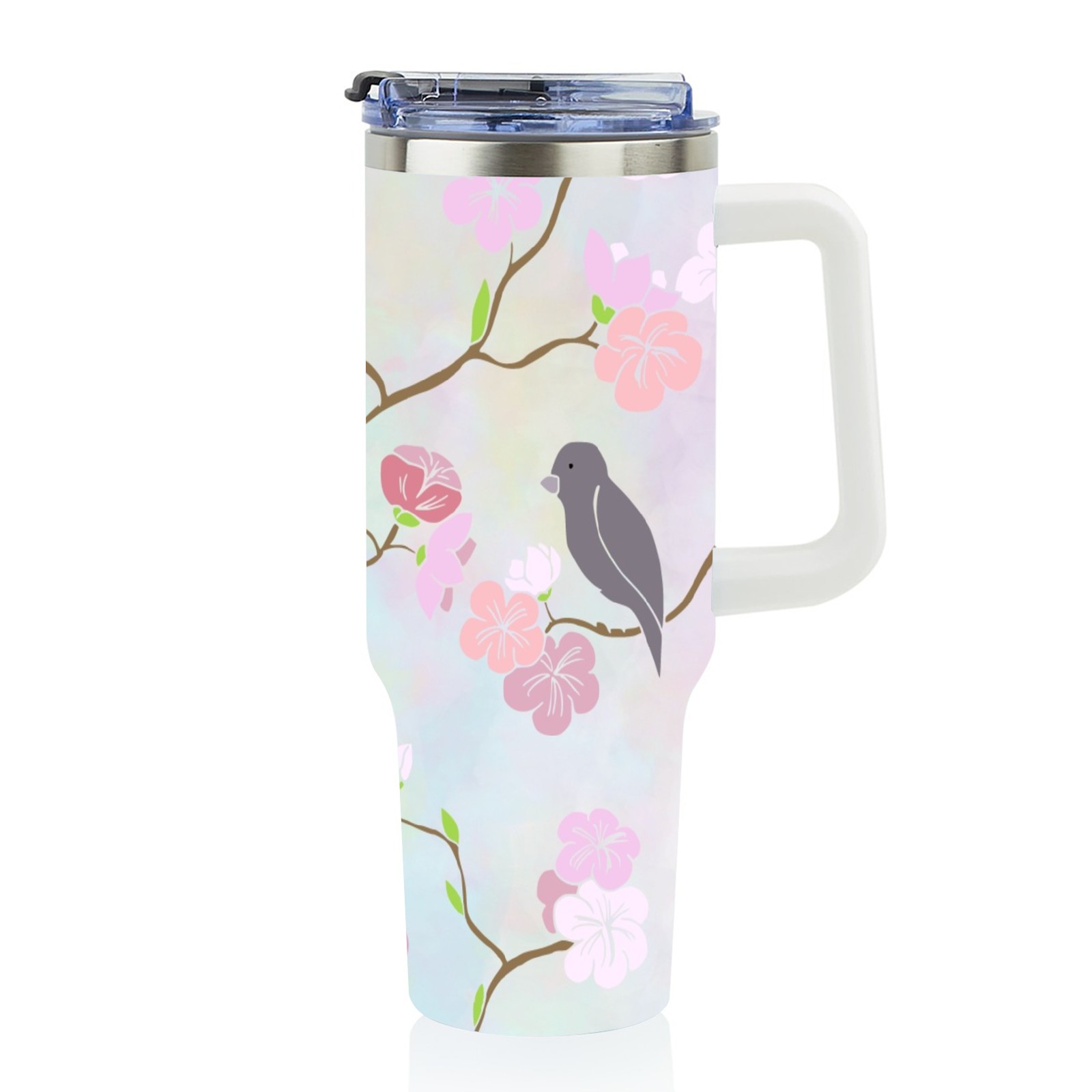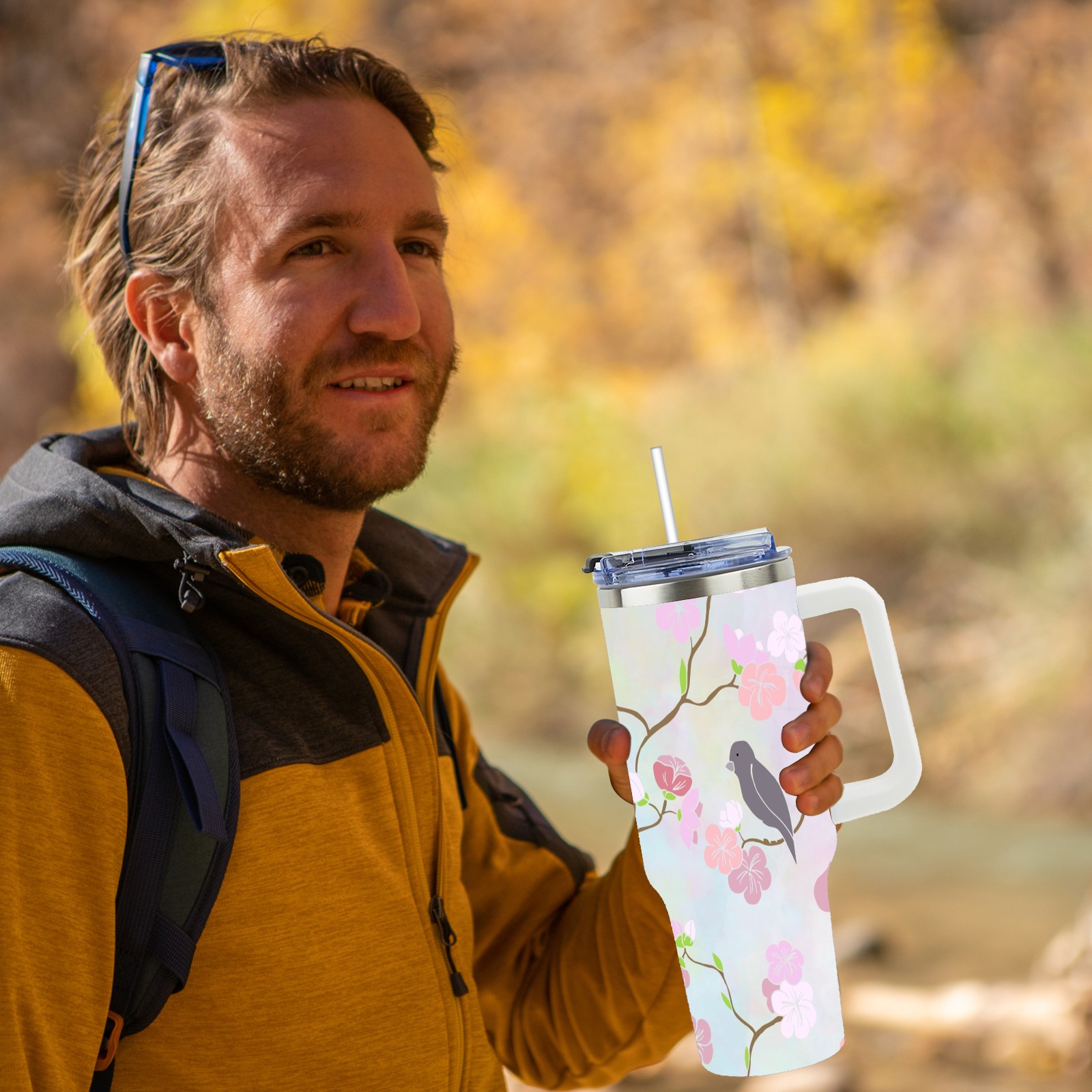 40oz Birds Blossom Seamless thermos with lid and straw, leak-proof stainless steel, with handle, spill-proof bottle, convenient for travel(pink)