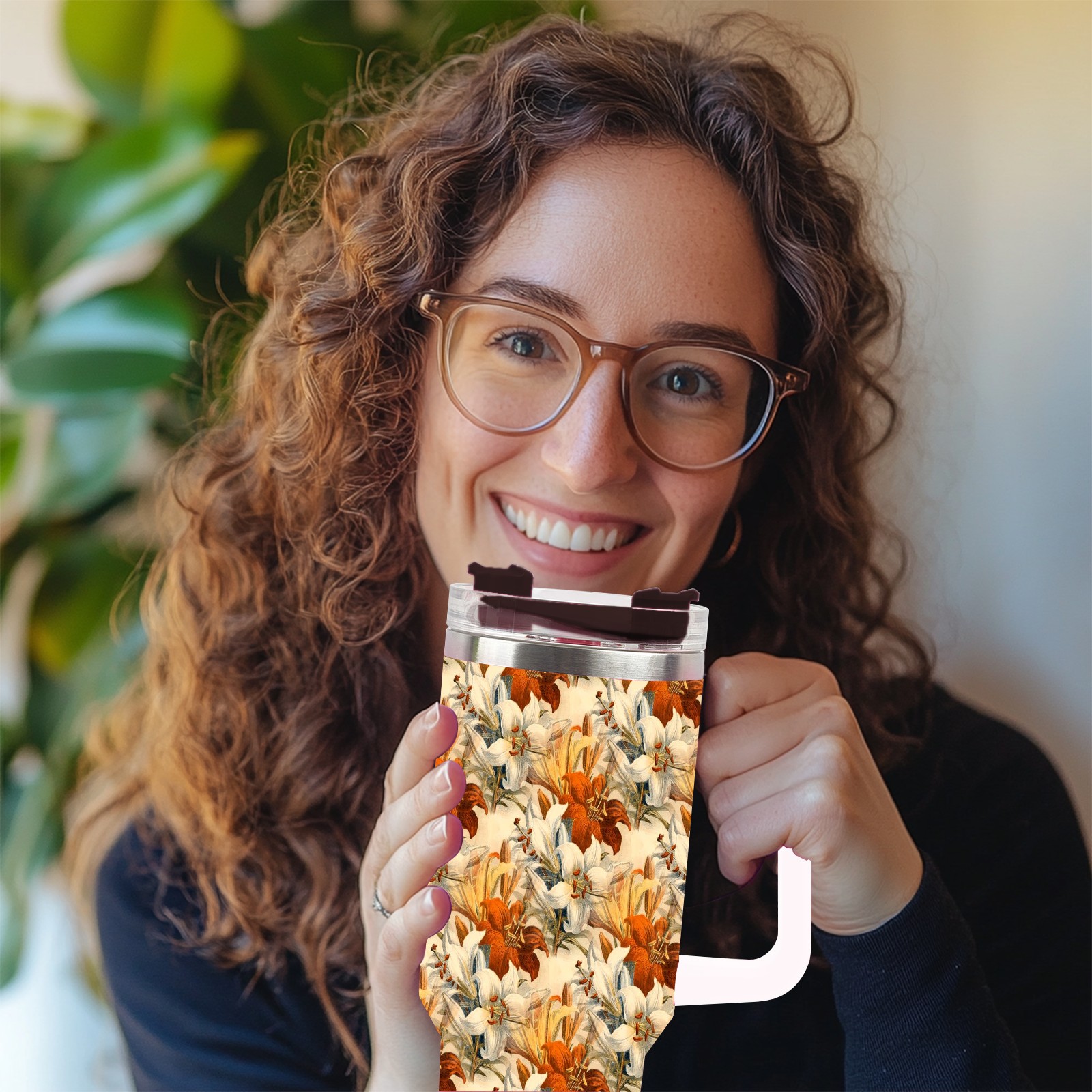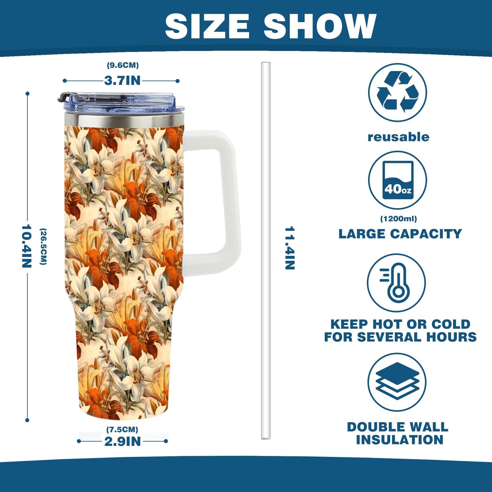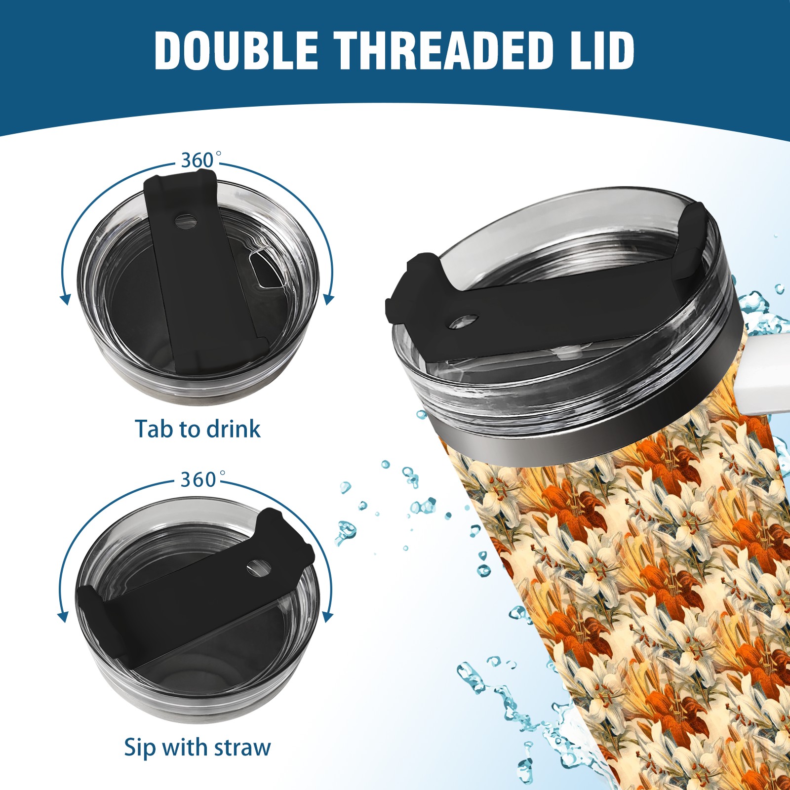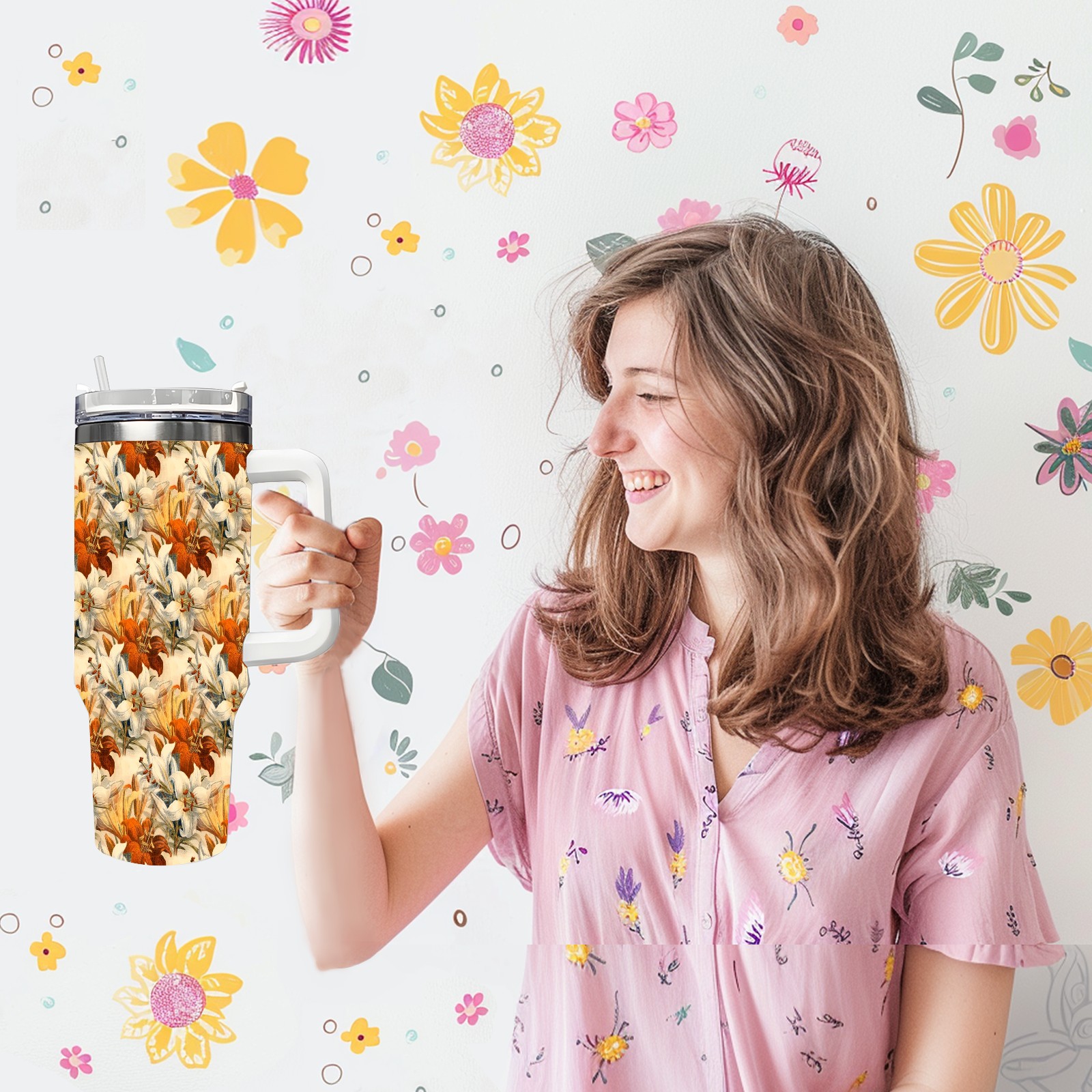 40oz Flower Seamless Retro thermos with lid and straw, leak-proof stainless steel, with handle, spill-proof bottle, convenient for travel(pink)