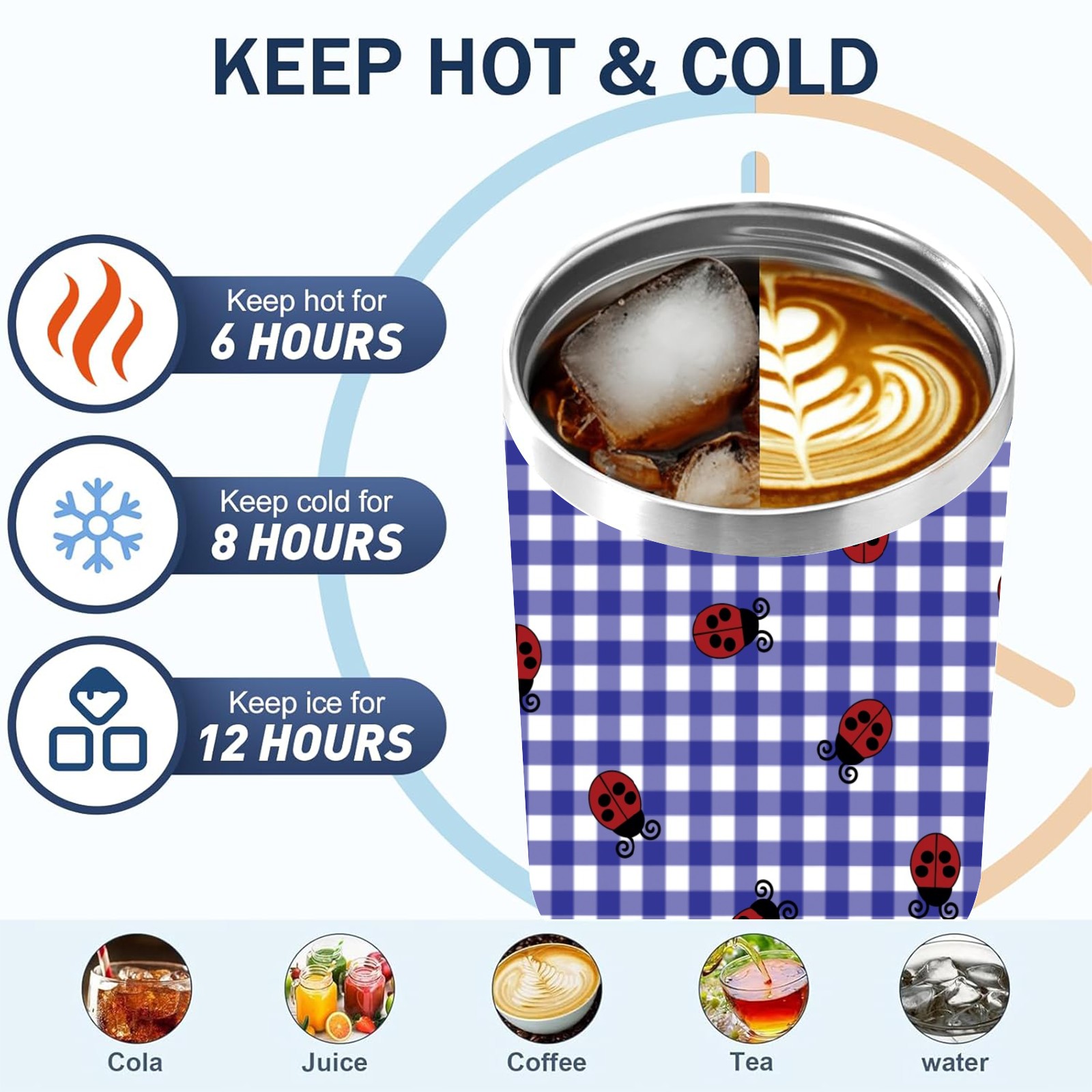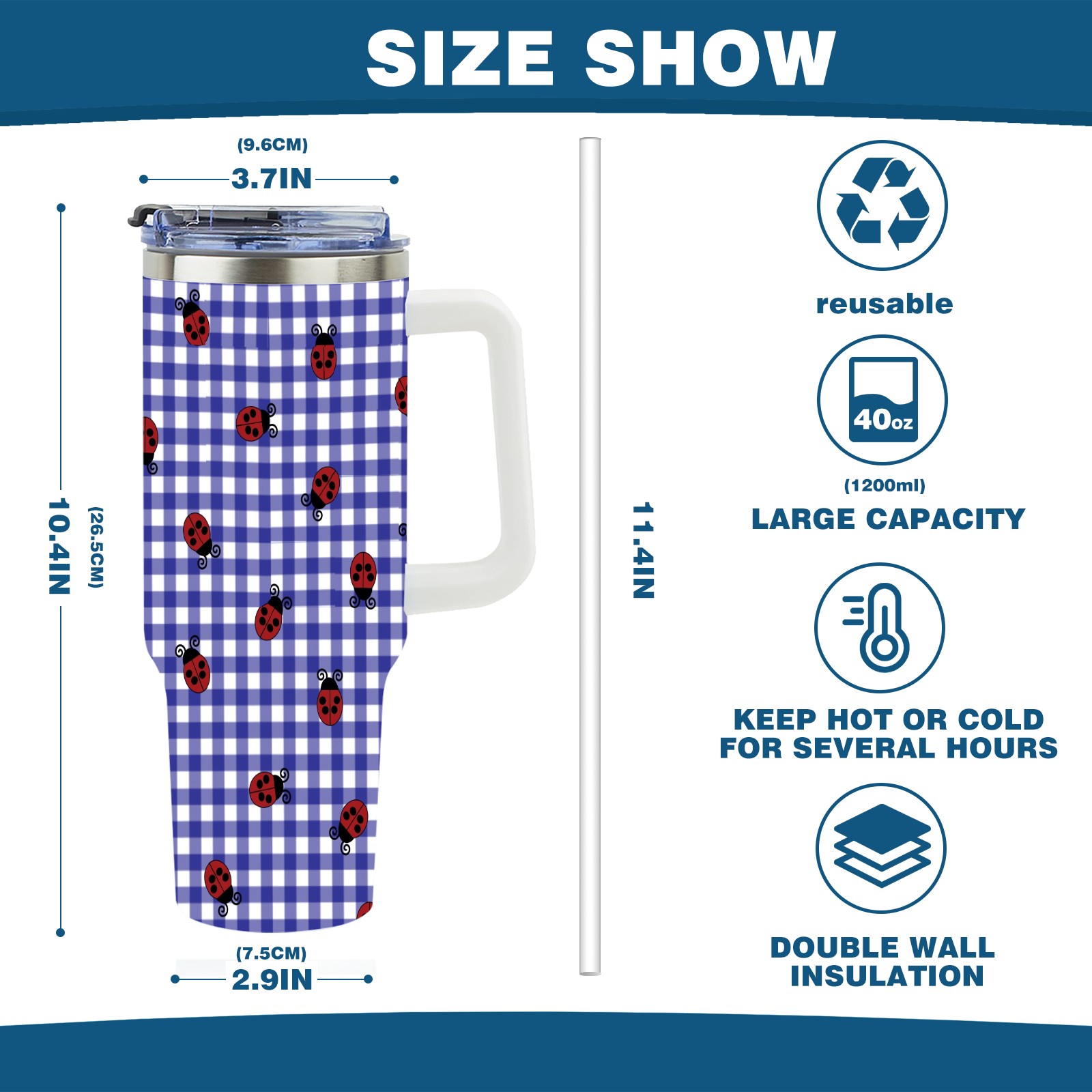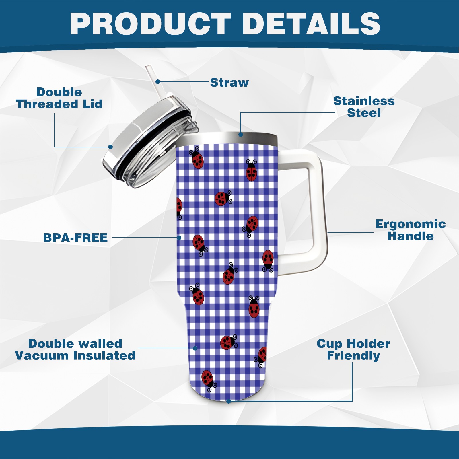 40oz Lattice Ladybug Seamless thermos with lid and straw, leak-proof stainless steel, with handle, spill-proof bottle, convenient for travel(pink)