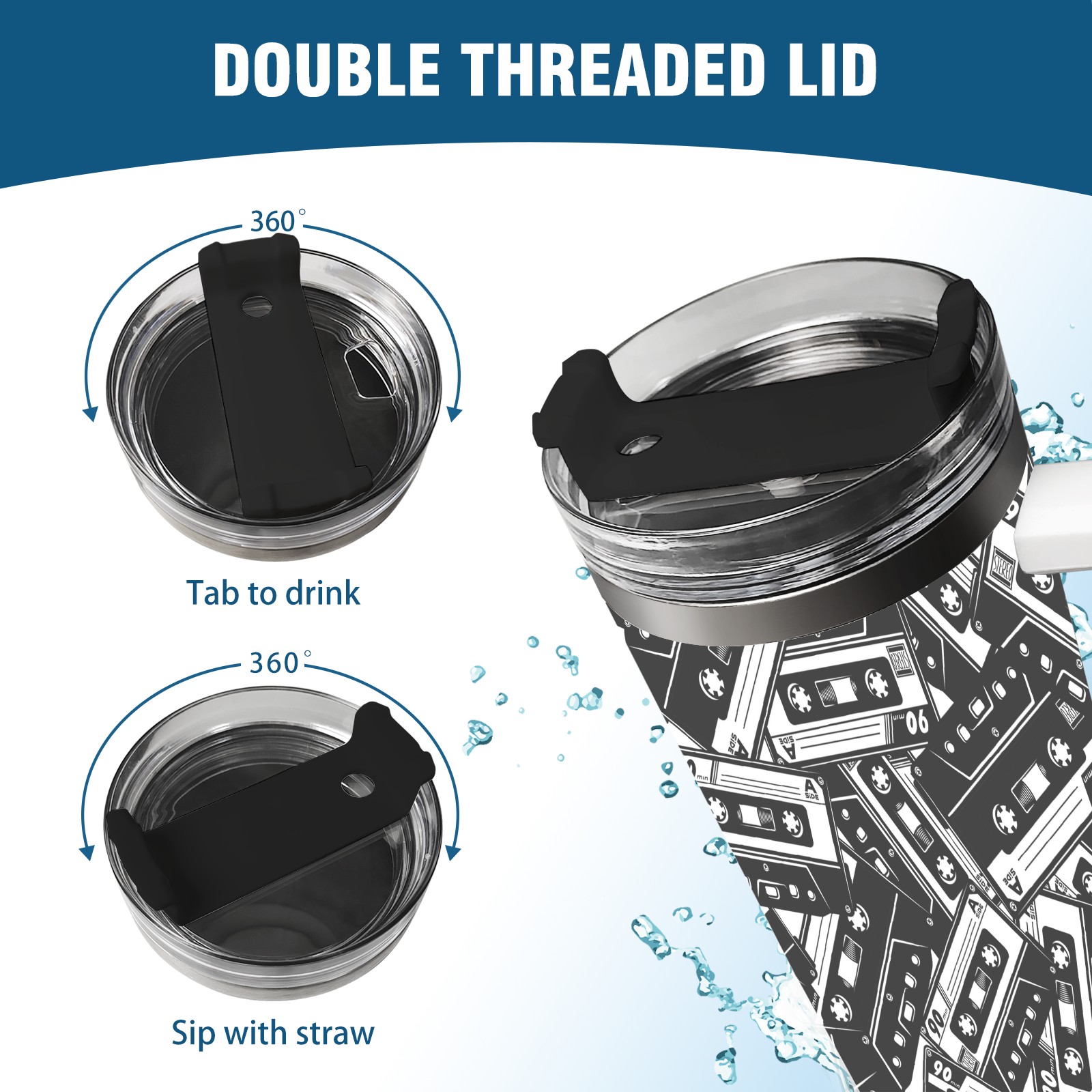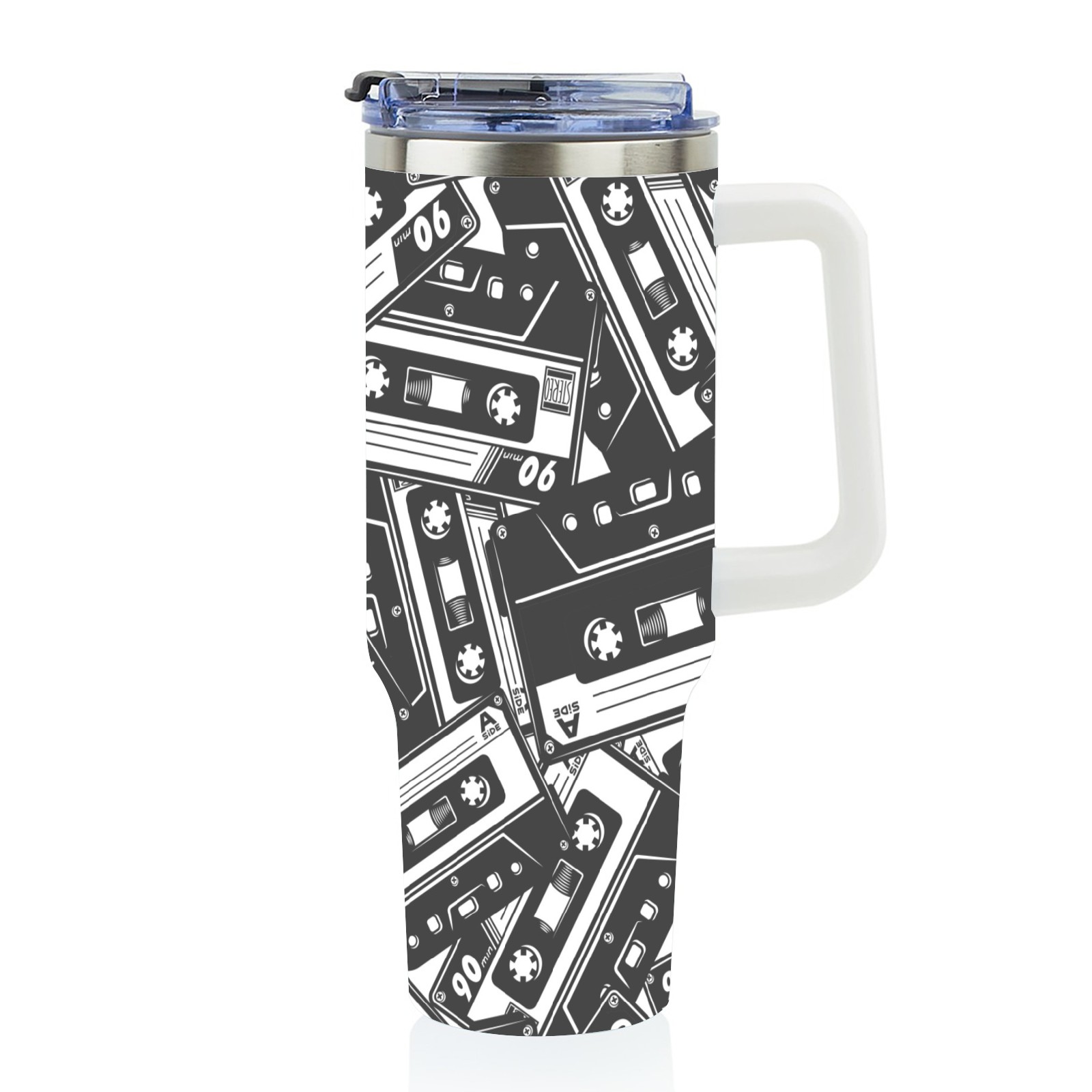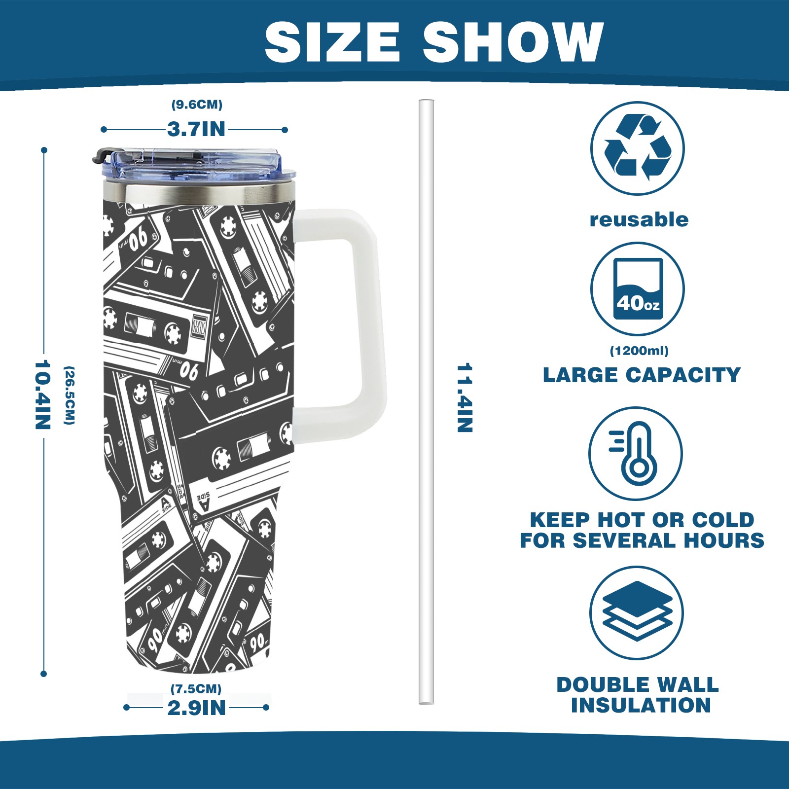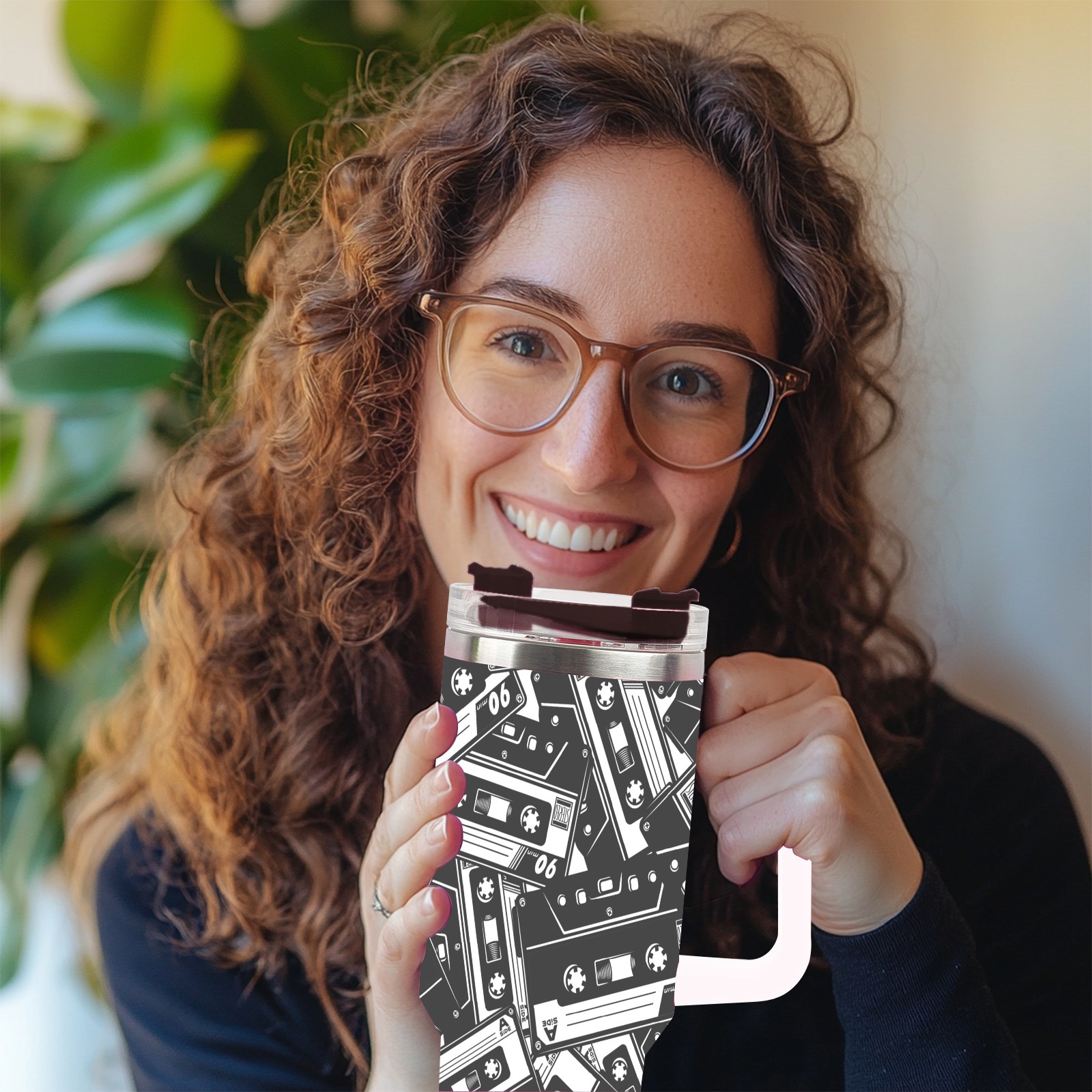40oz Cassette Tape Seamless thermos with lid and straw, leak-proof stainless steel, with handle, spill-proof bottle, convenient for travel(pink)