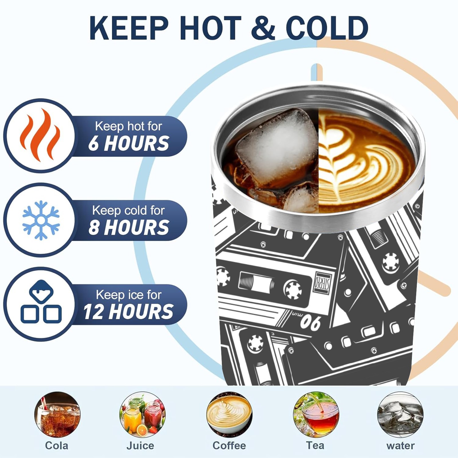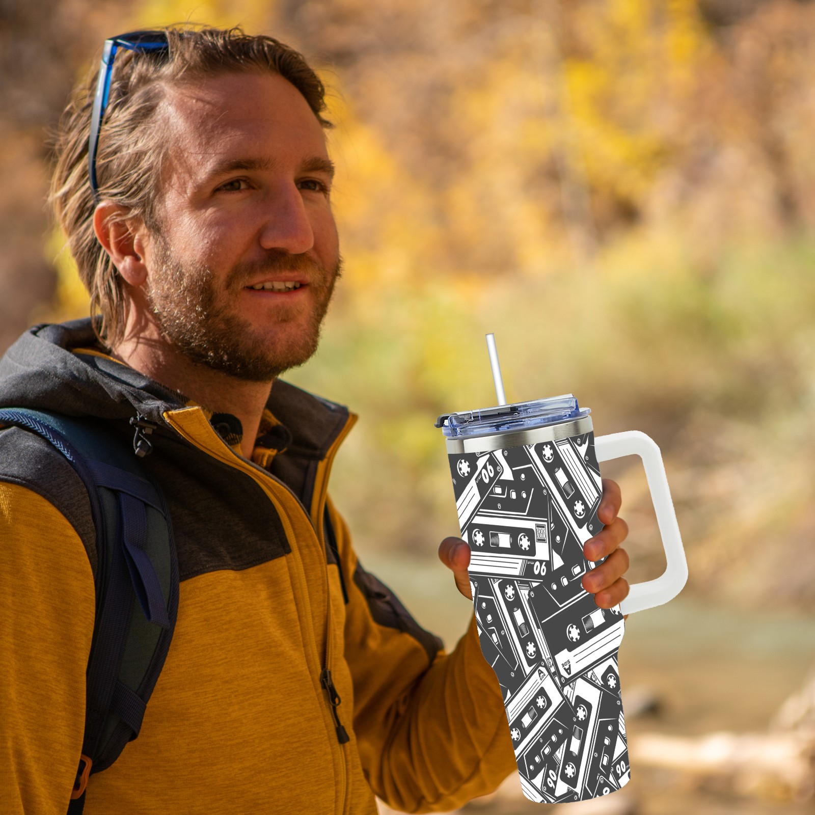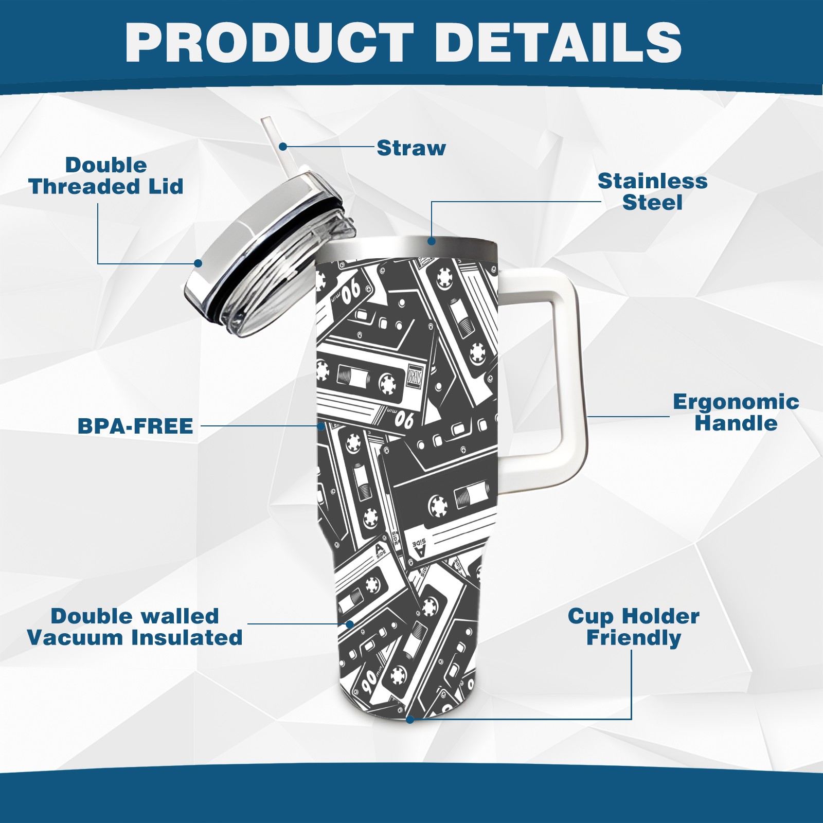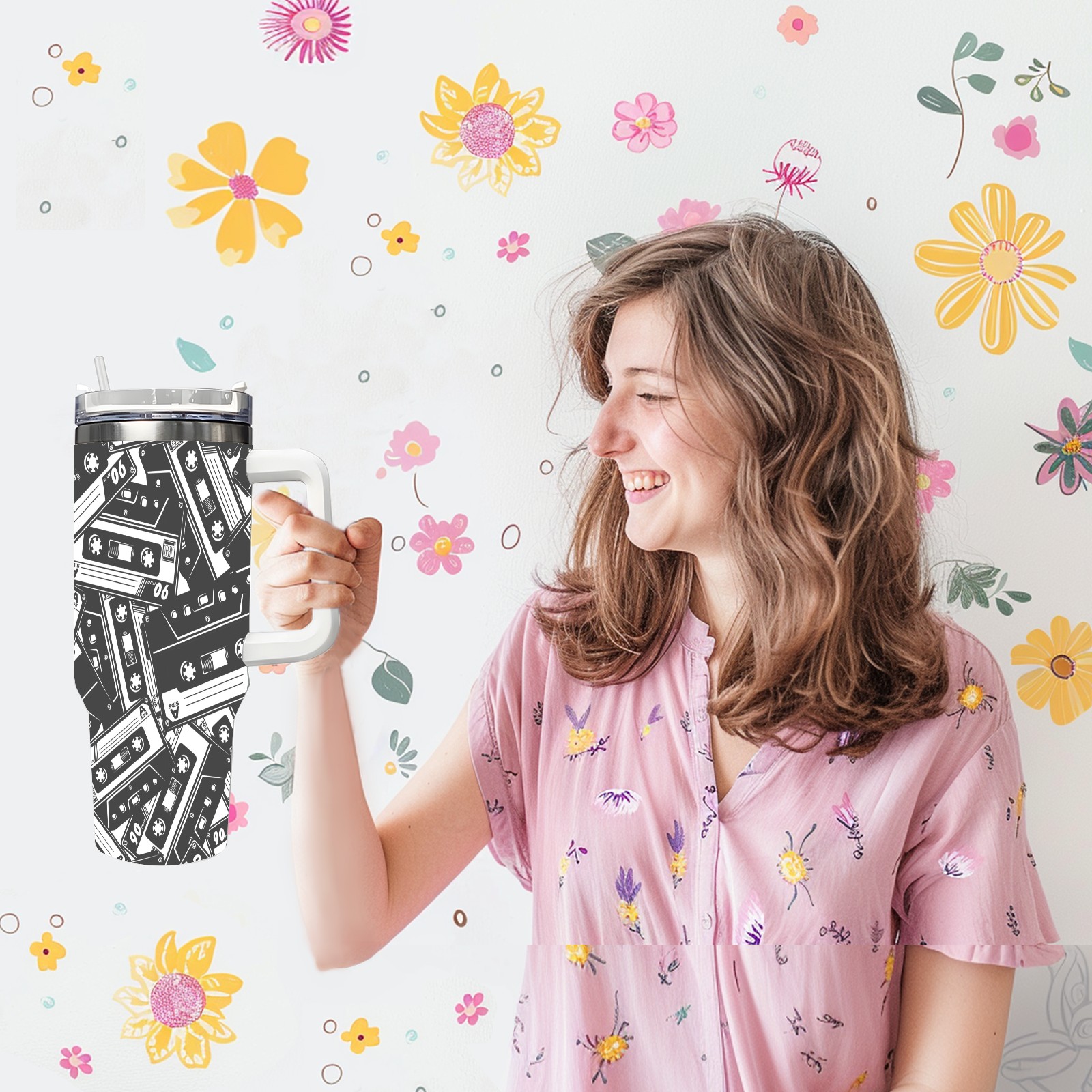 40oz Cassette Tape Seamless thermos with lid and straw, leak-proof stainless steel, with handle, spill-proof bottle, convenient for travel(pink)