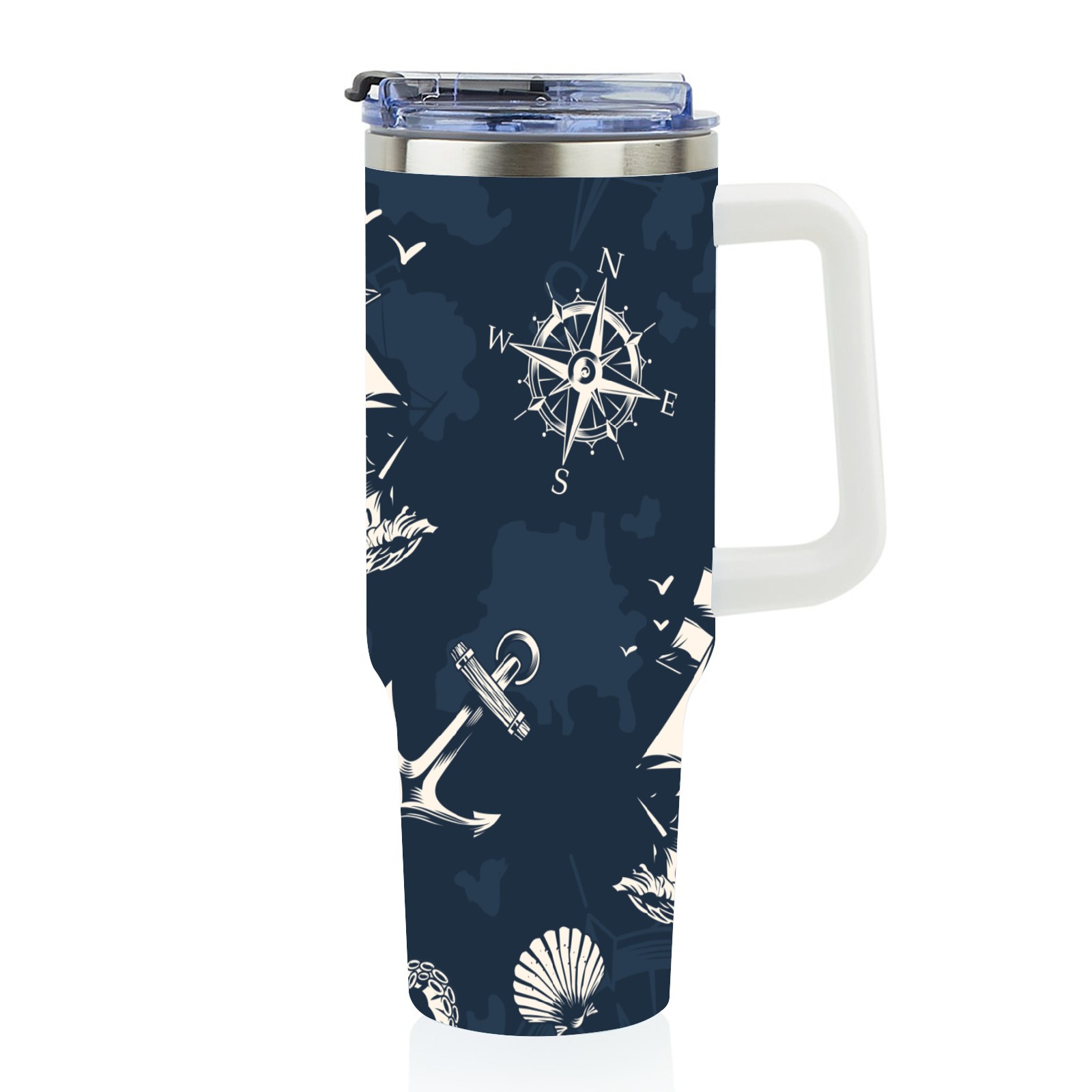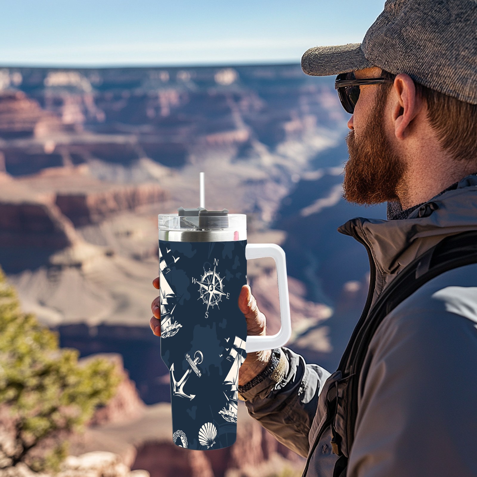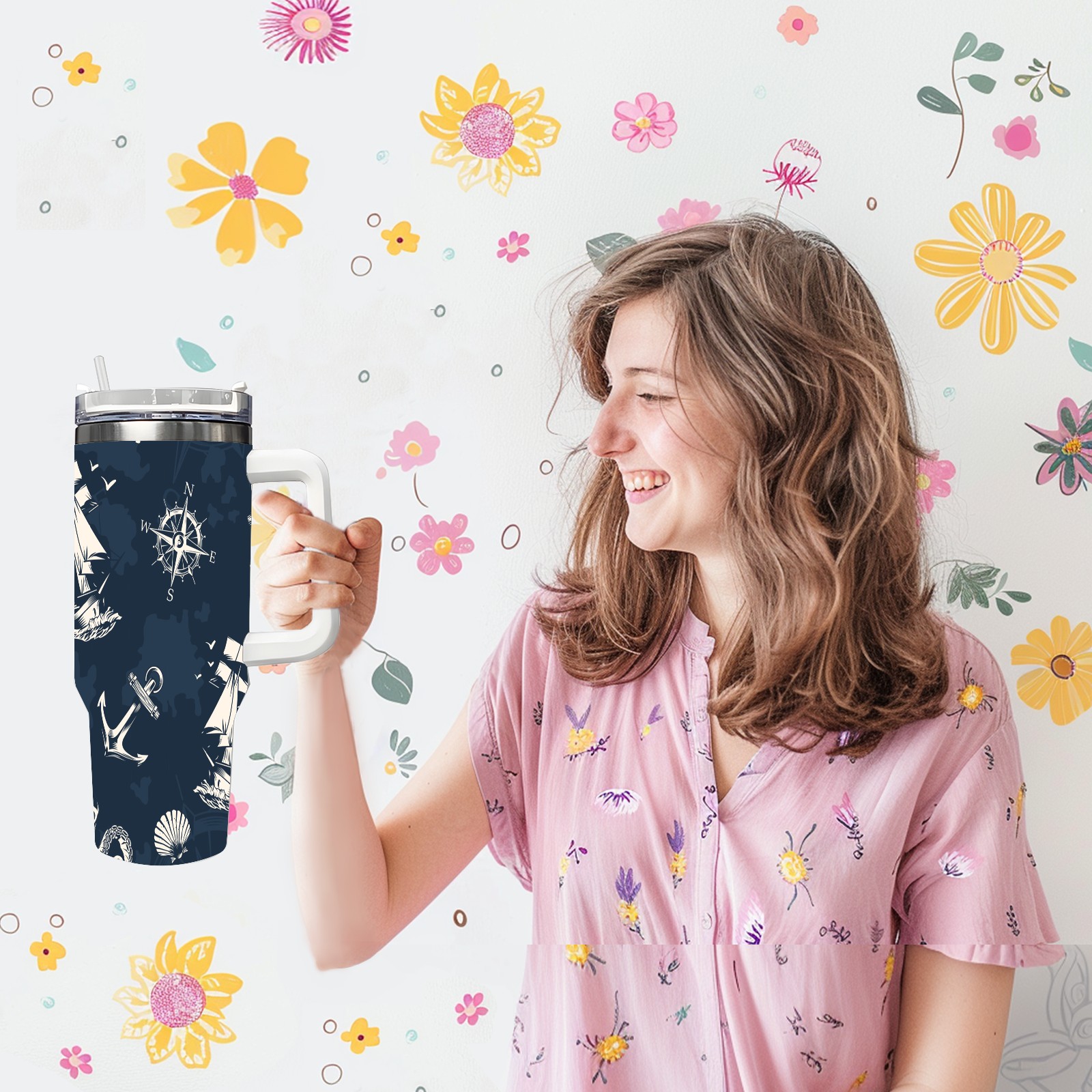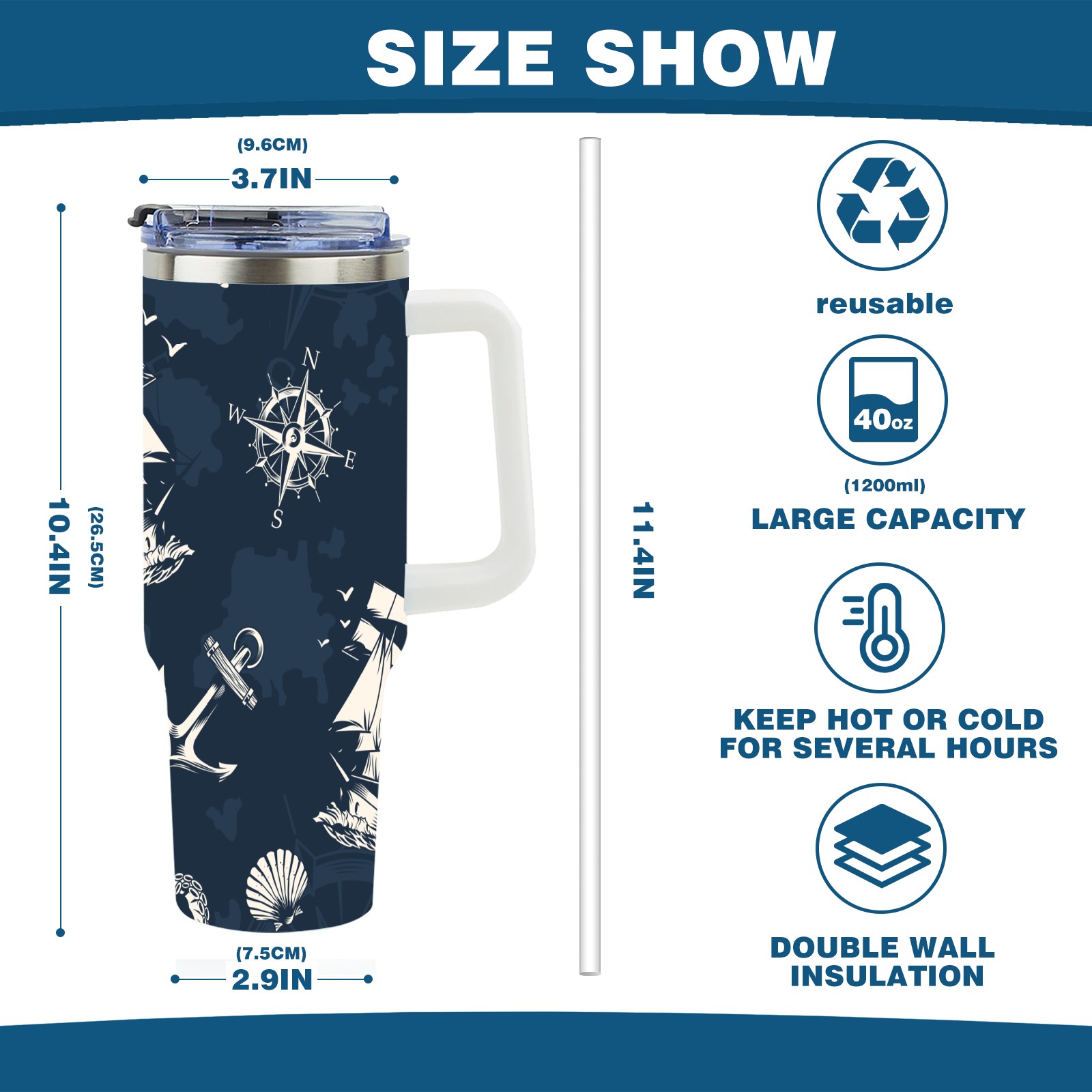 40oz Nautical Sea Seamless thermos with lid and straw, leak-proof stainless steel, with handle, spill-proof bottle, convenient for travel(pink)